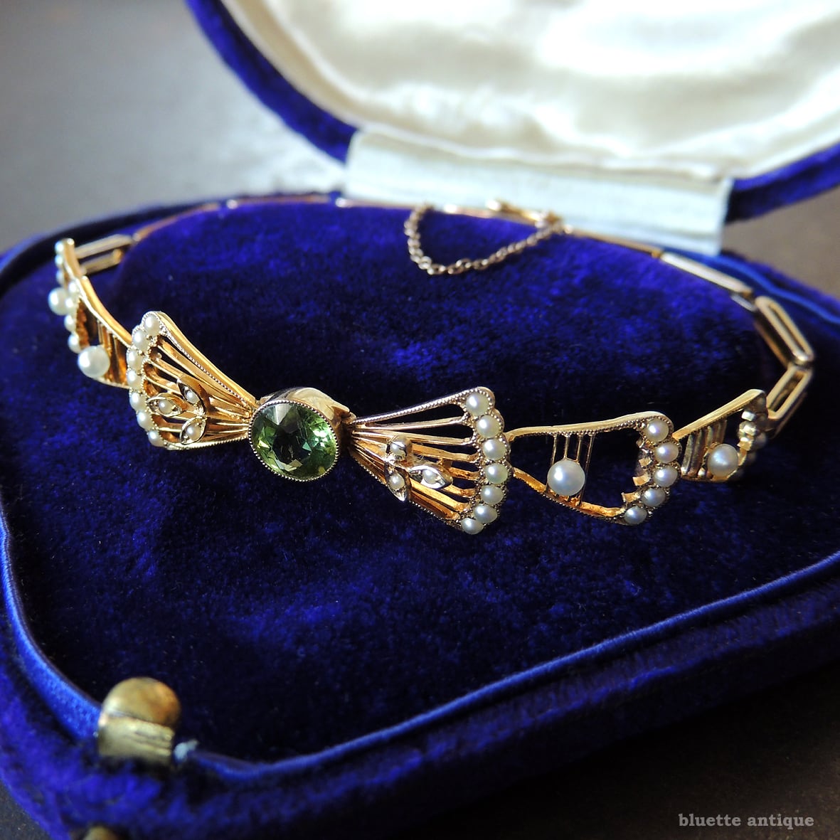 しなやかに手首に添う、15金のブレスレット。アール・デコのデザイン、リボンモチーフは甘くなり過ぎず、エレガントです。 中央は輝きの強いペリドット、照り艶の良い真珠が散りばめられており、大変美しいです。 留め具の差し込み部に刻印が有り、着ける時は隠れます。細部のつくり込みも丁寧で、奥ゆかしさも感じられる意匠。 素晴らしいブレスレットを是非、新しい季節の装いに取り入れて下さい。