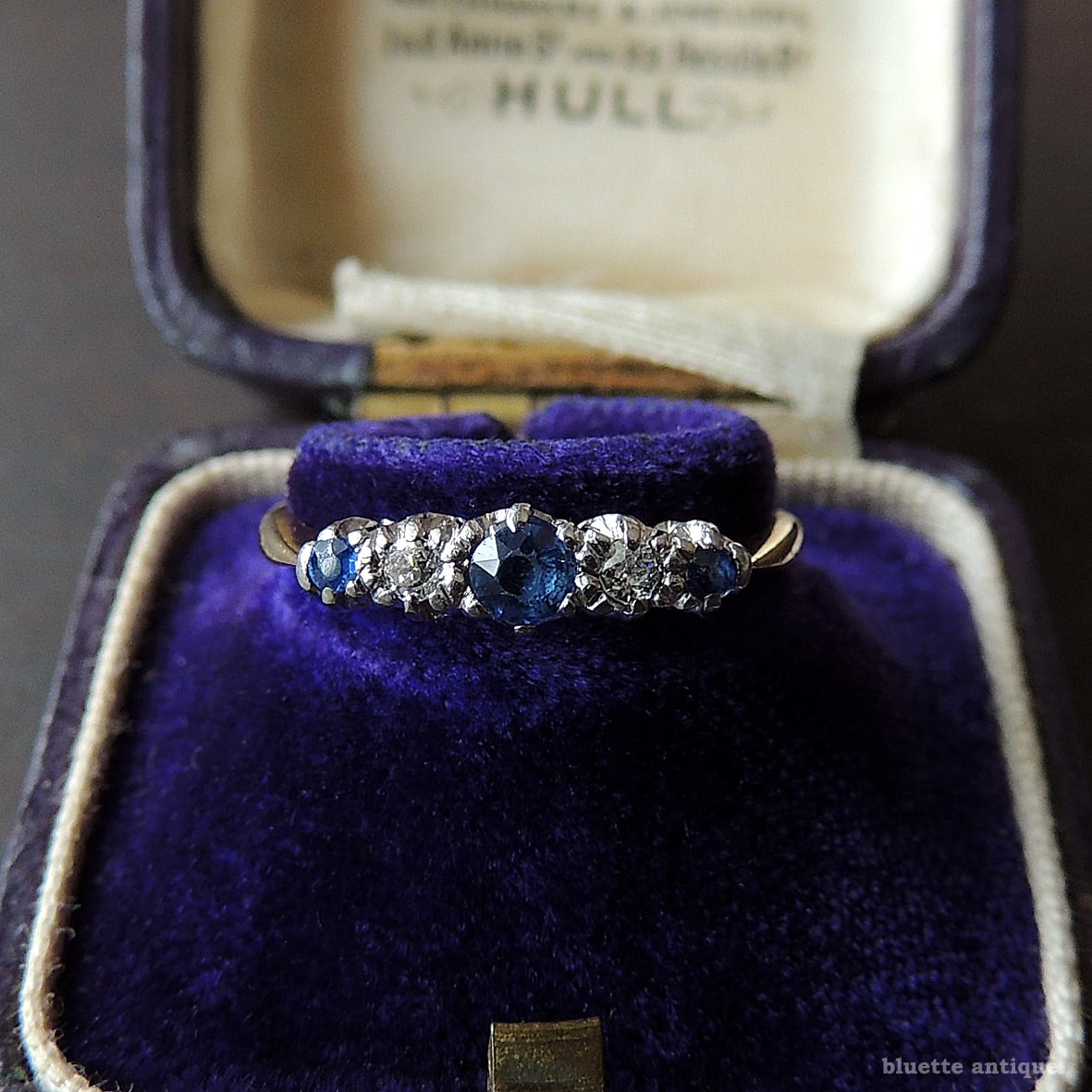 イギリスより、18金、天然サファイアと天然ダイヤモンドのリングです。明るいブルーが魅力のサファイア3石とダイヤモンド2石は、プラチナの台にしっかりとセットされています。