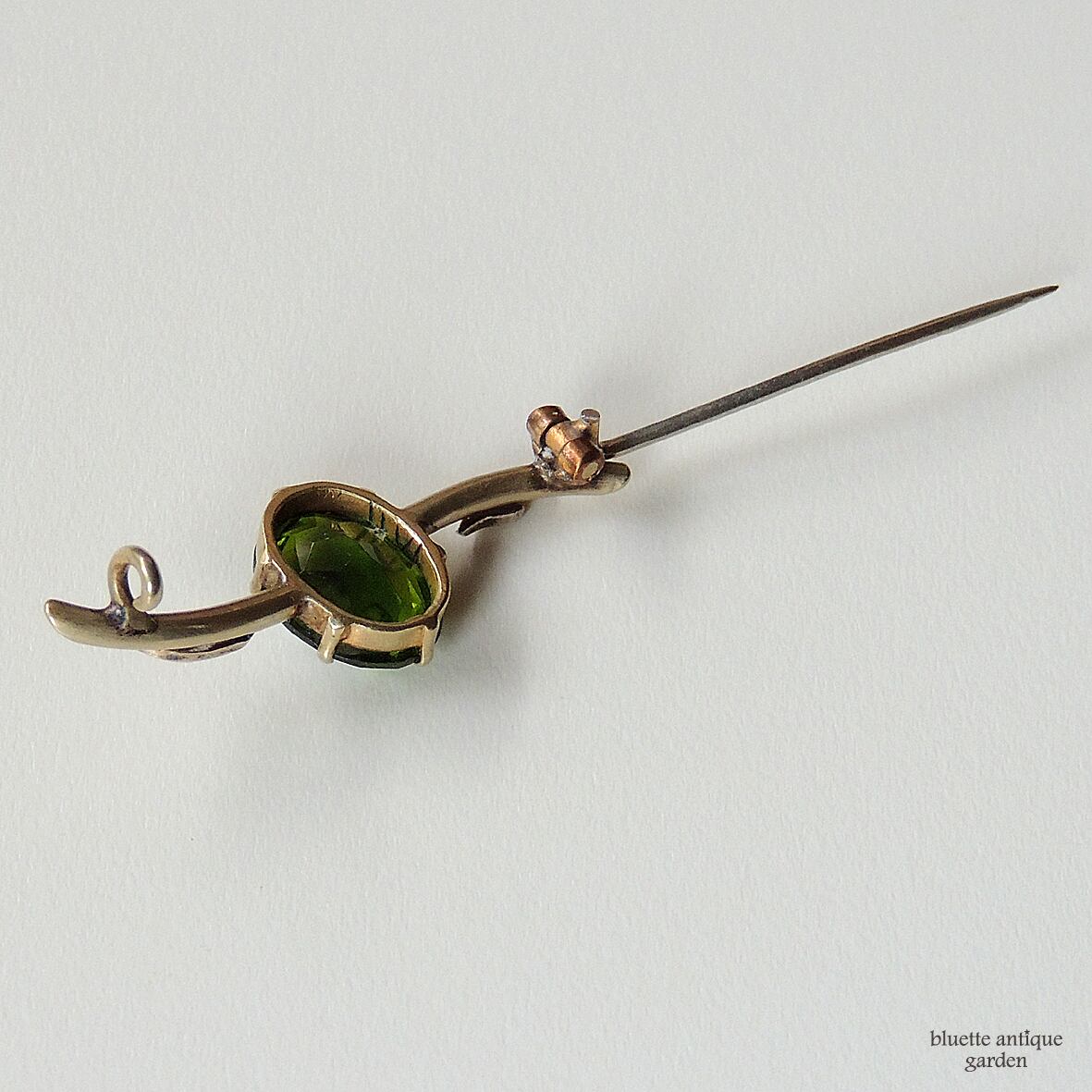 中央にはシックな色合いのグリーンガラス、枝のように伸びたバーの両端にはリーフデザイン、真ん中にシードパールを模した飾りが付いています。