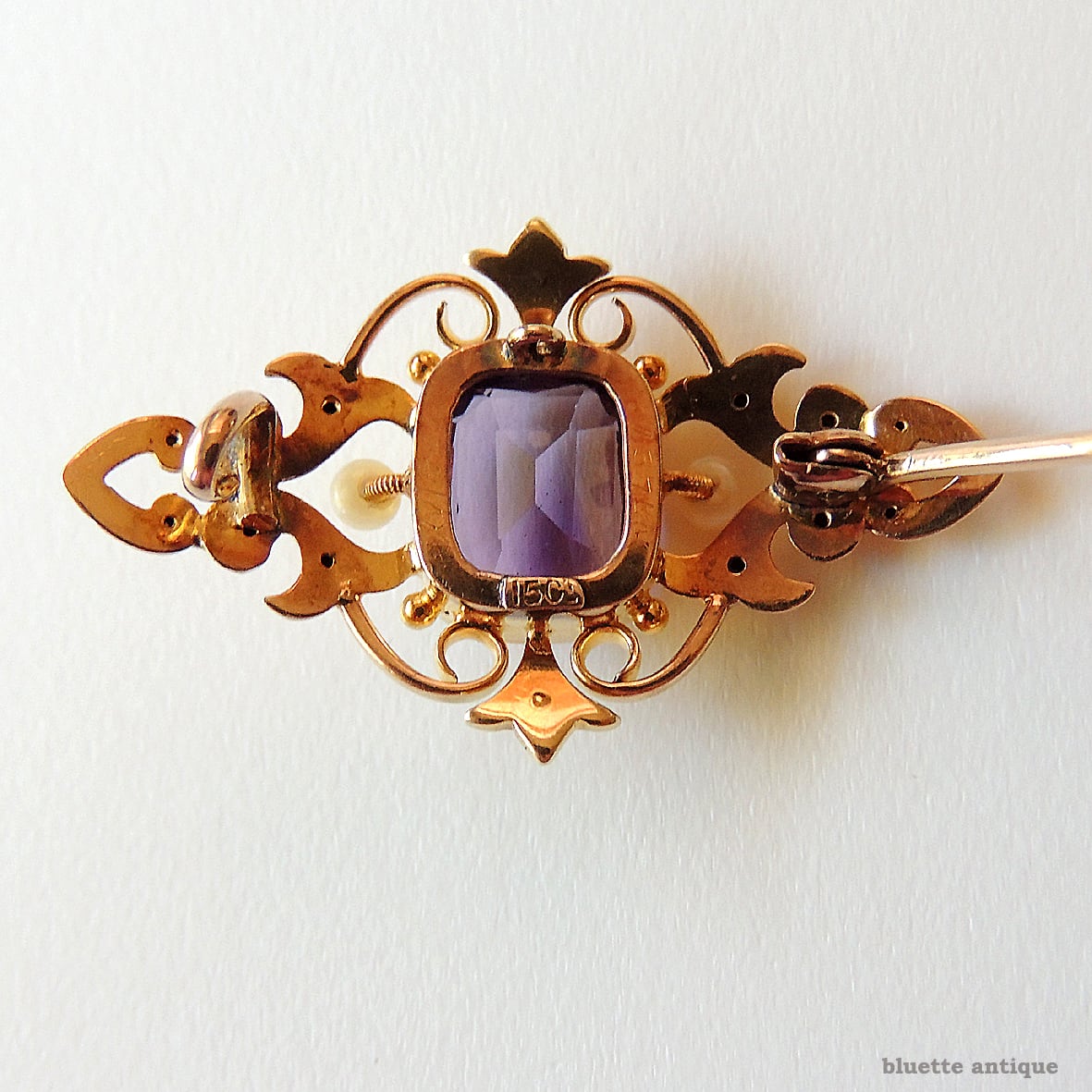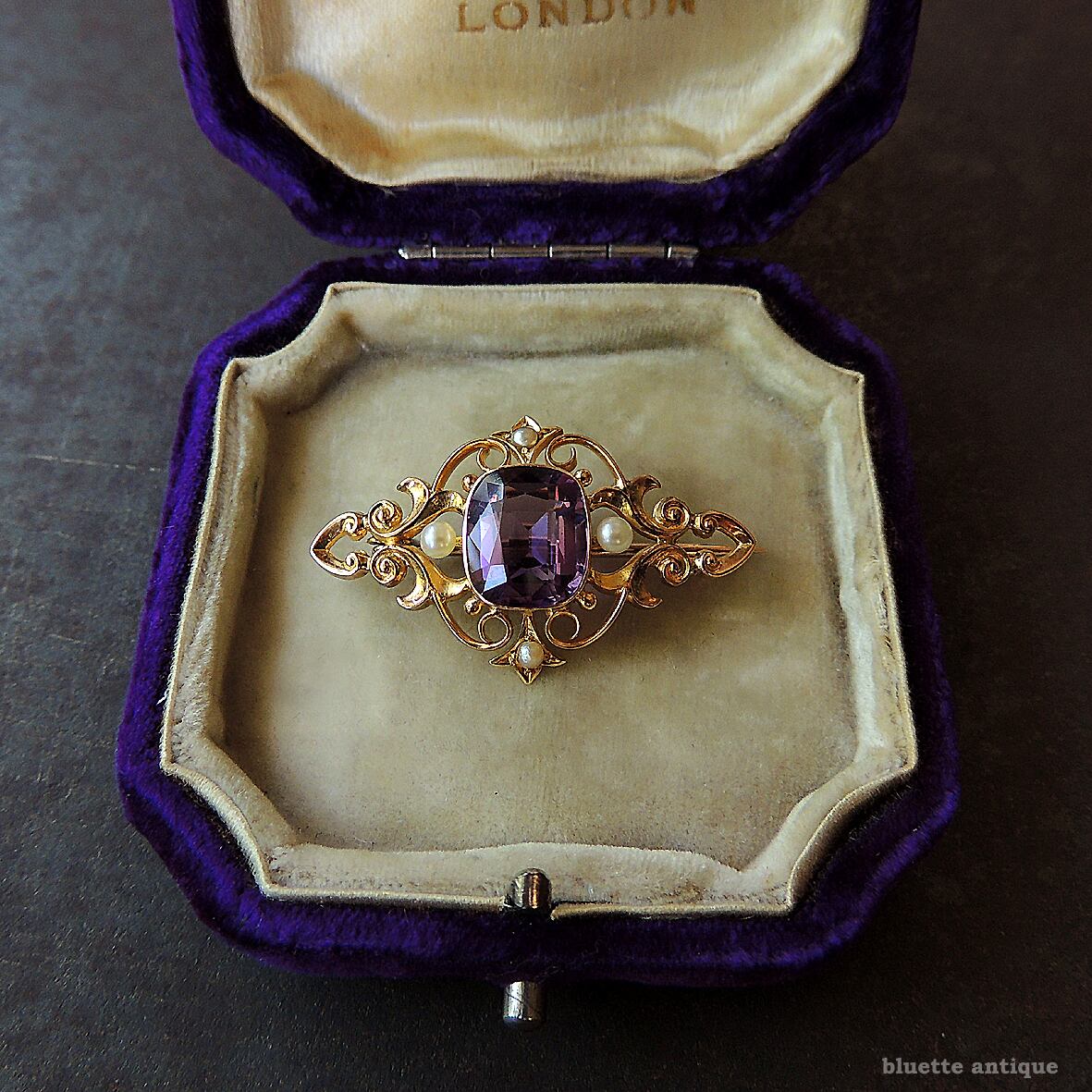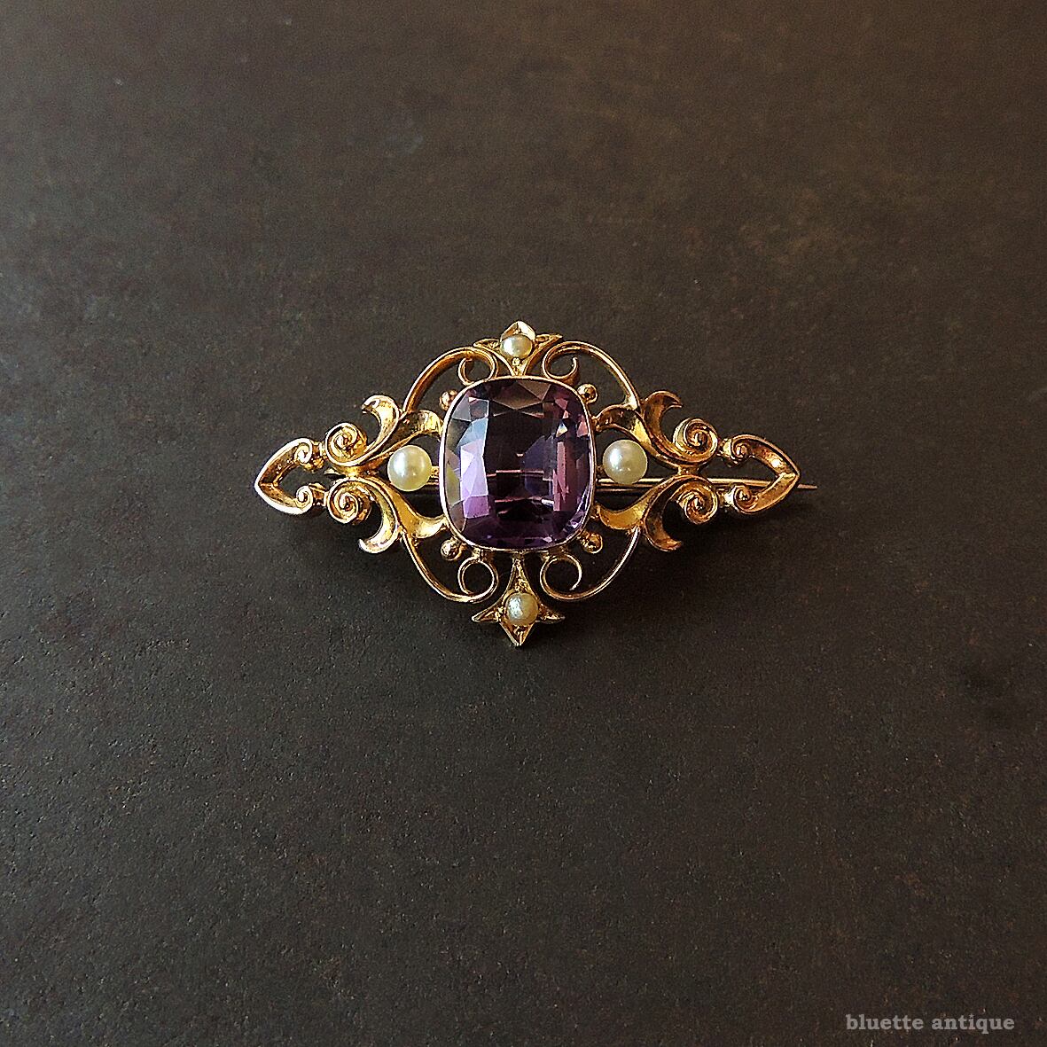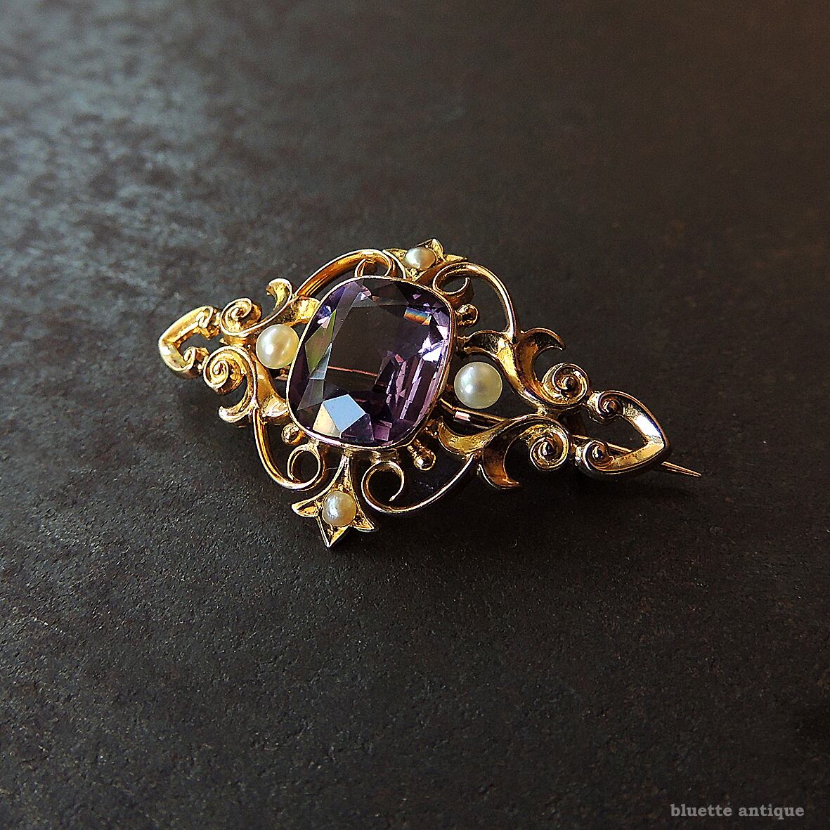英国アンティークジュエリー アール・ヌーヴォー 15ctゴールド 天然アメシスト 真珠 ブローチ(ソーティングメモ付)