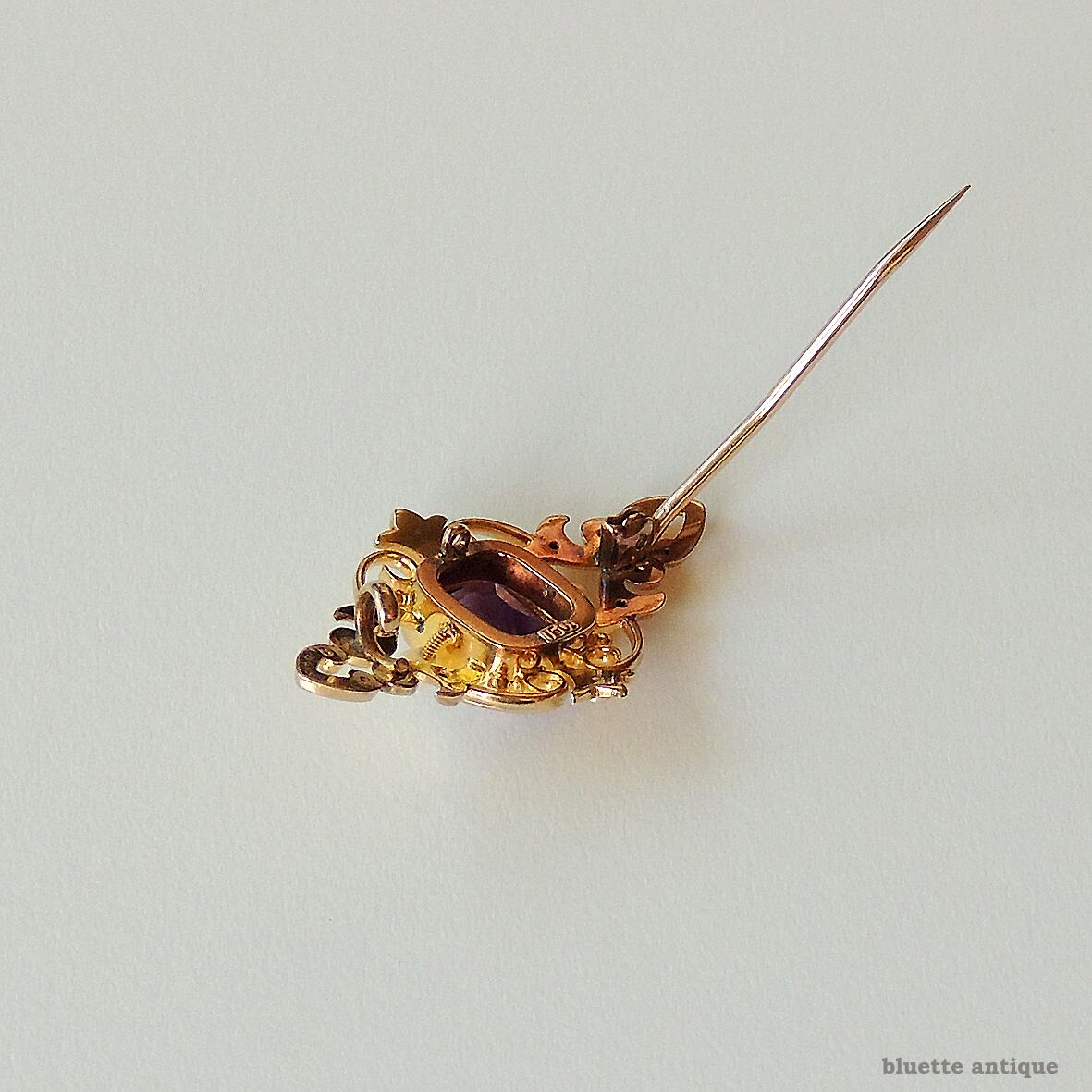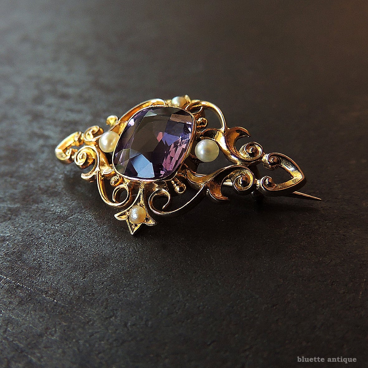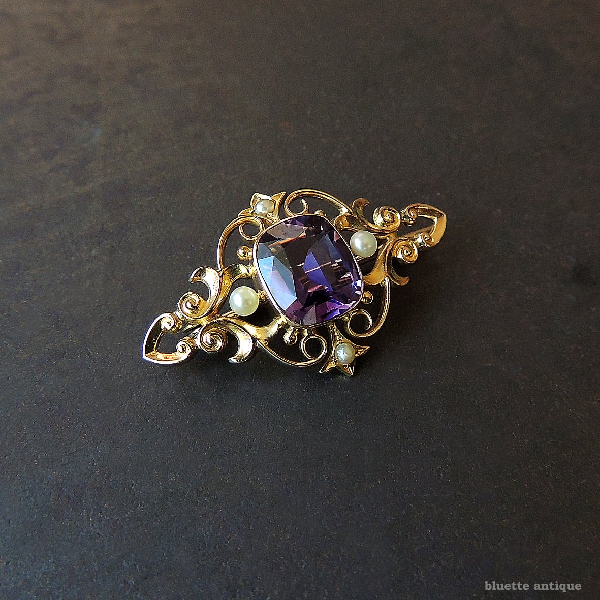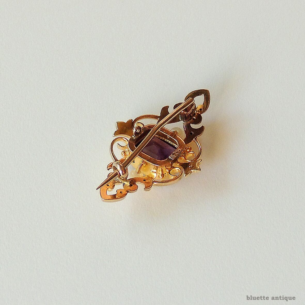 英国アンティークジュエリー アール・ヌーヴォー 15ctゴールド 天然アメシスト 真珠 ブローチ(ソーティングメモ付)