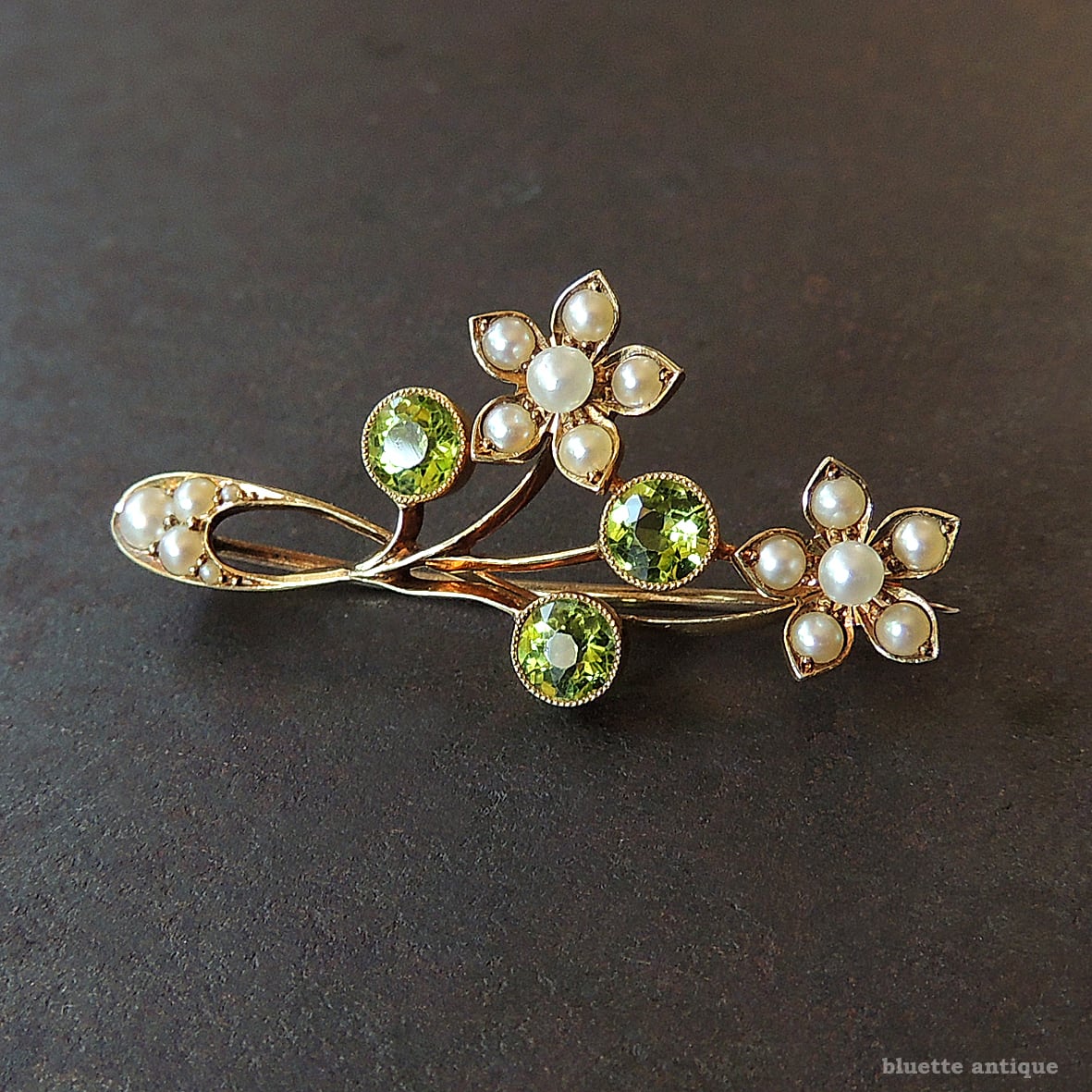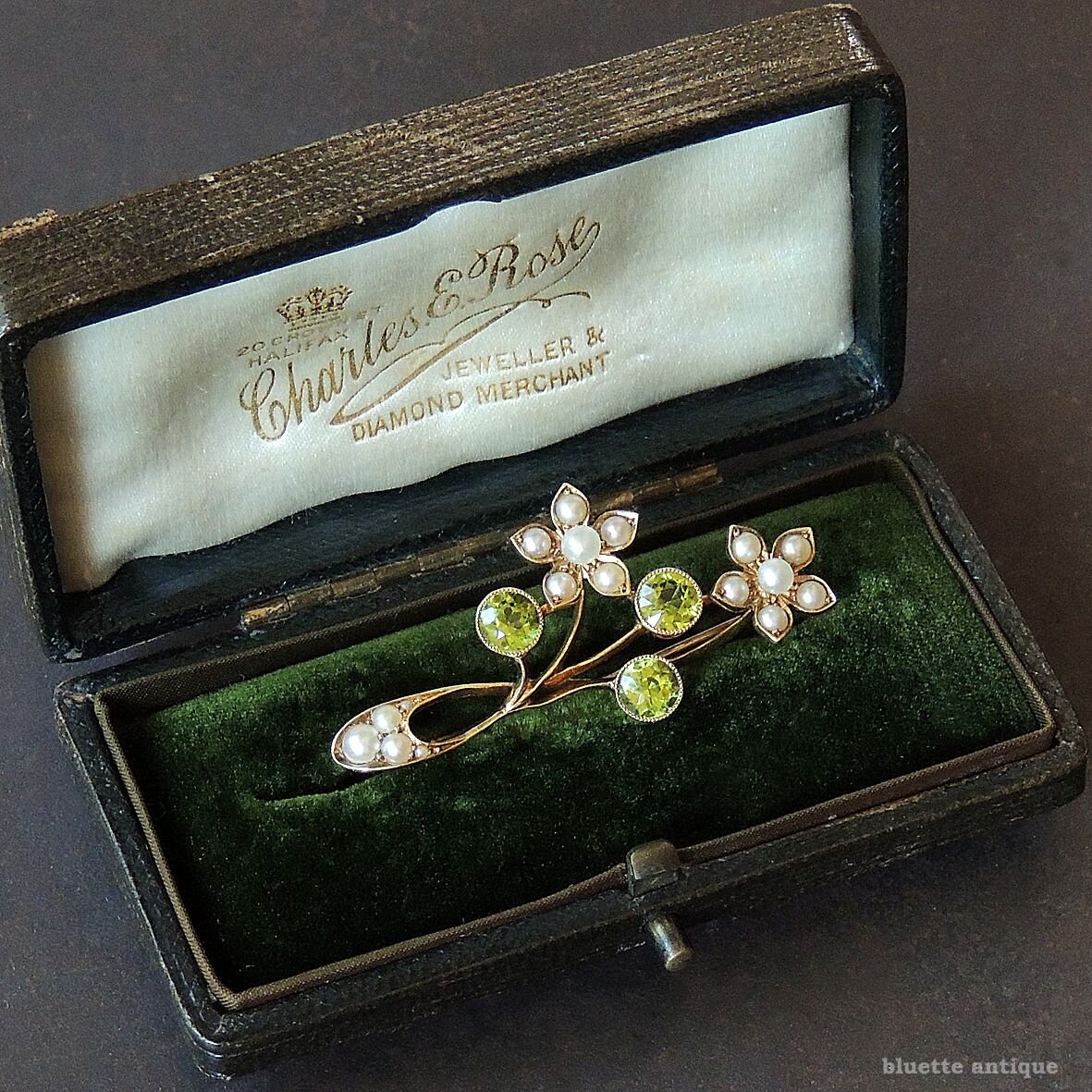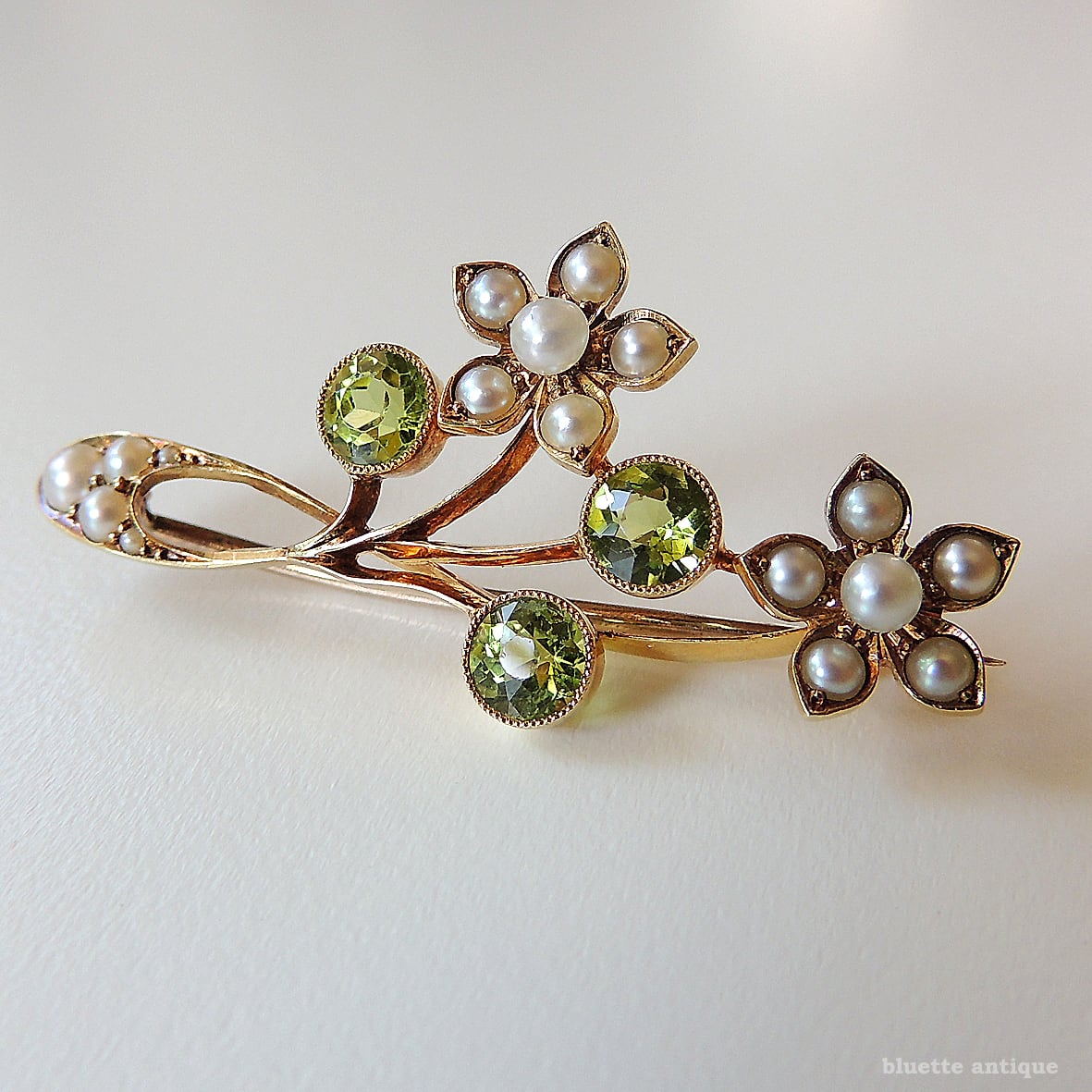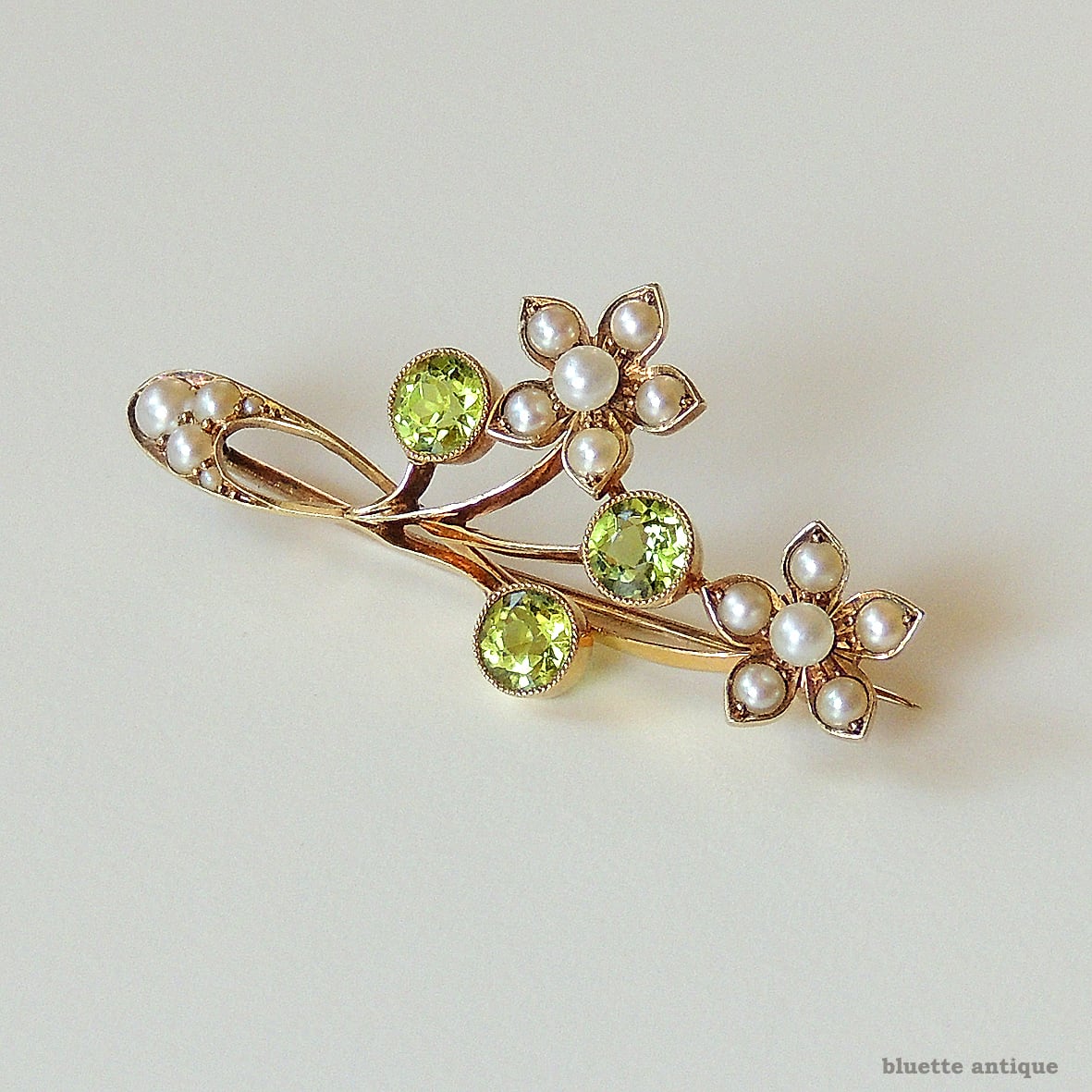 英国アンティークジュエリー アール・ヌーヴォー 15ctゴールド 天然ペリドット 真珠 フローラル ブローチ(ソーティングメモ付)