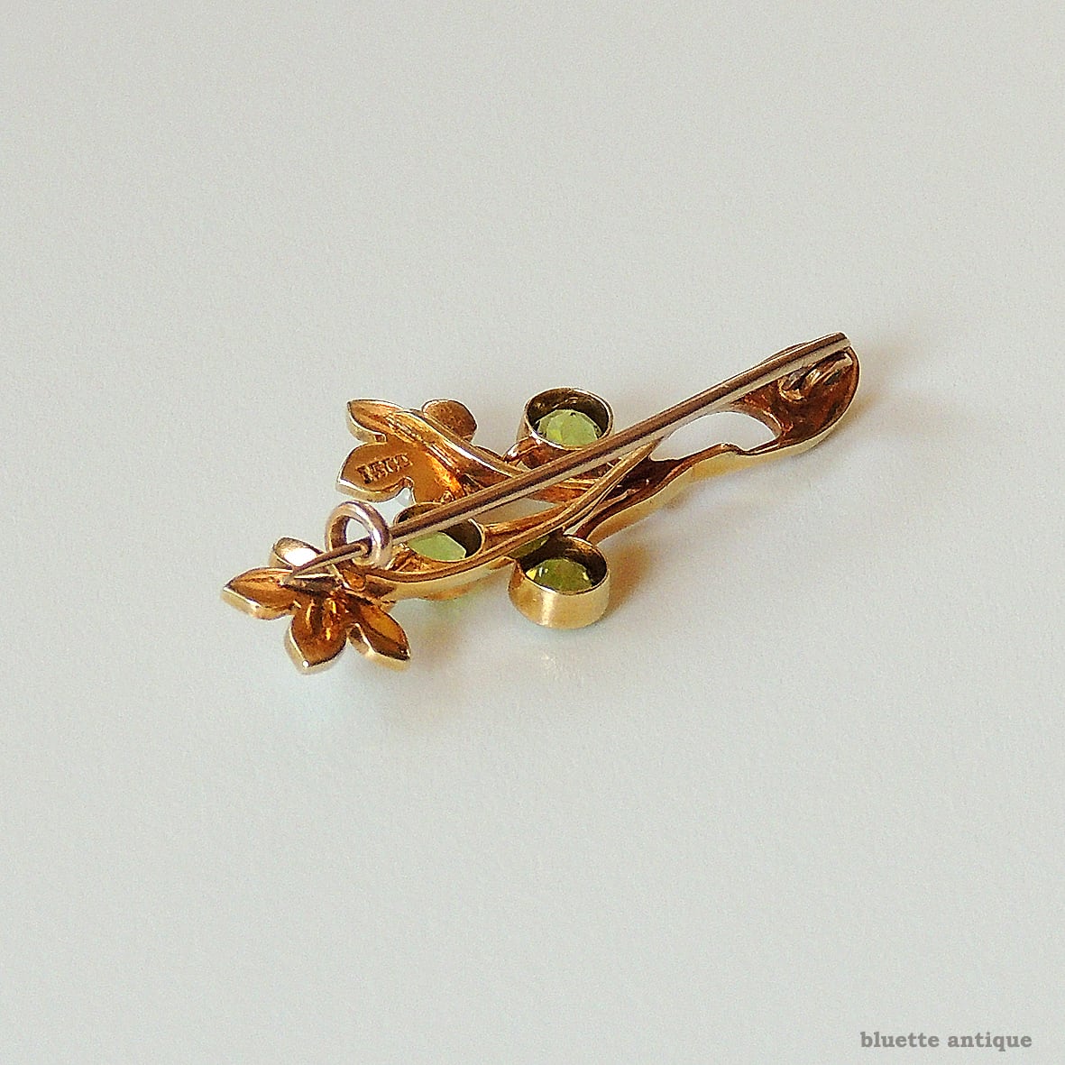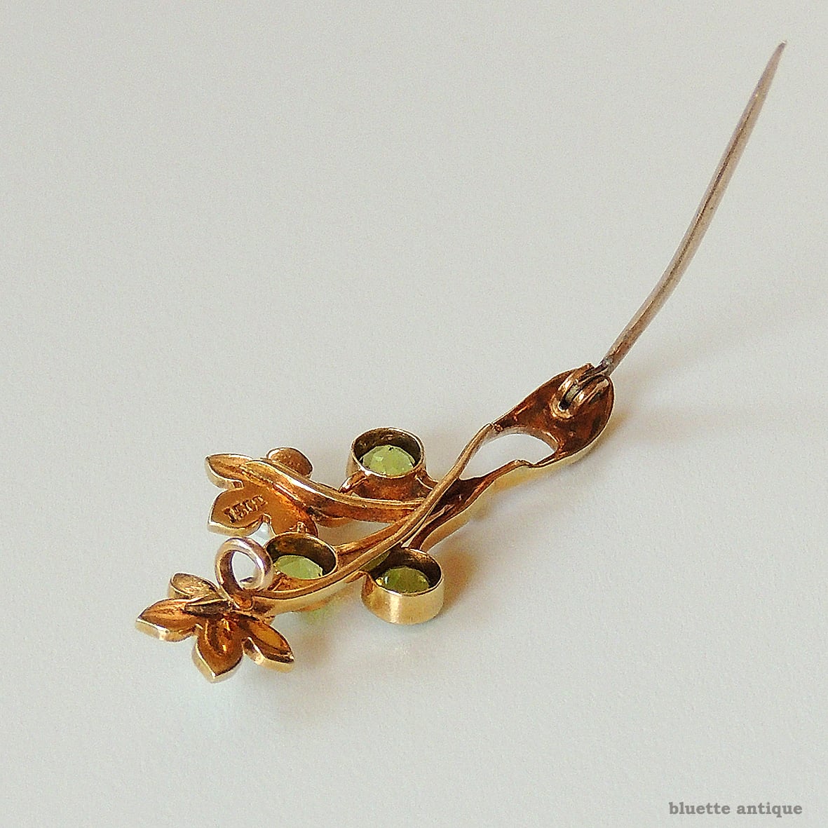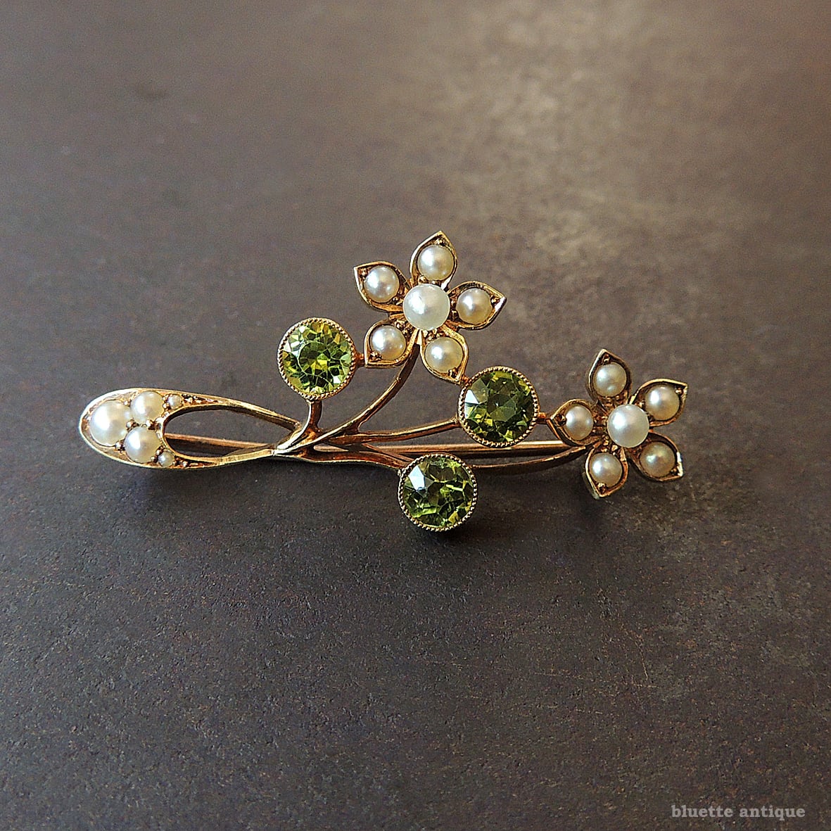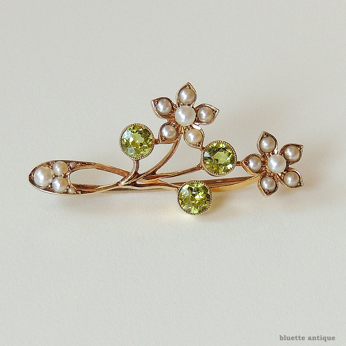 英国アンティークジュエリー アール・ヌーヴォー 15ctゴールド 天然ペリドット 真珠 フローラル ブローチ(ソーティングメモ付)