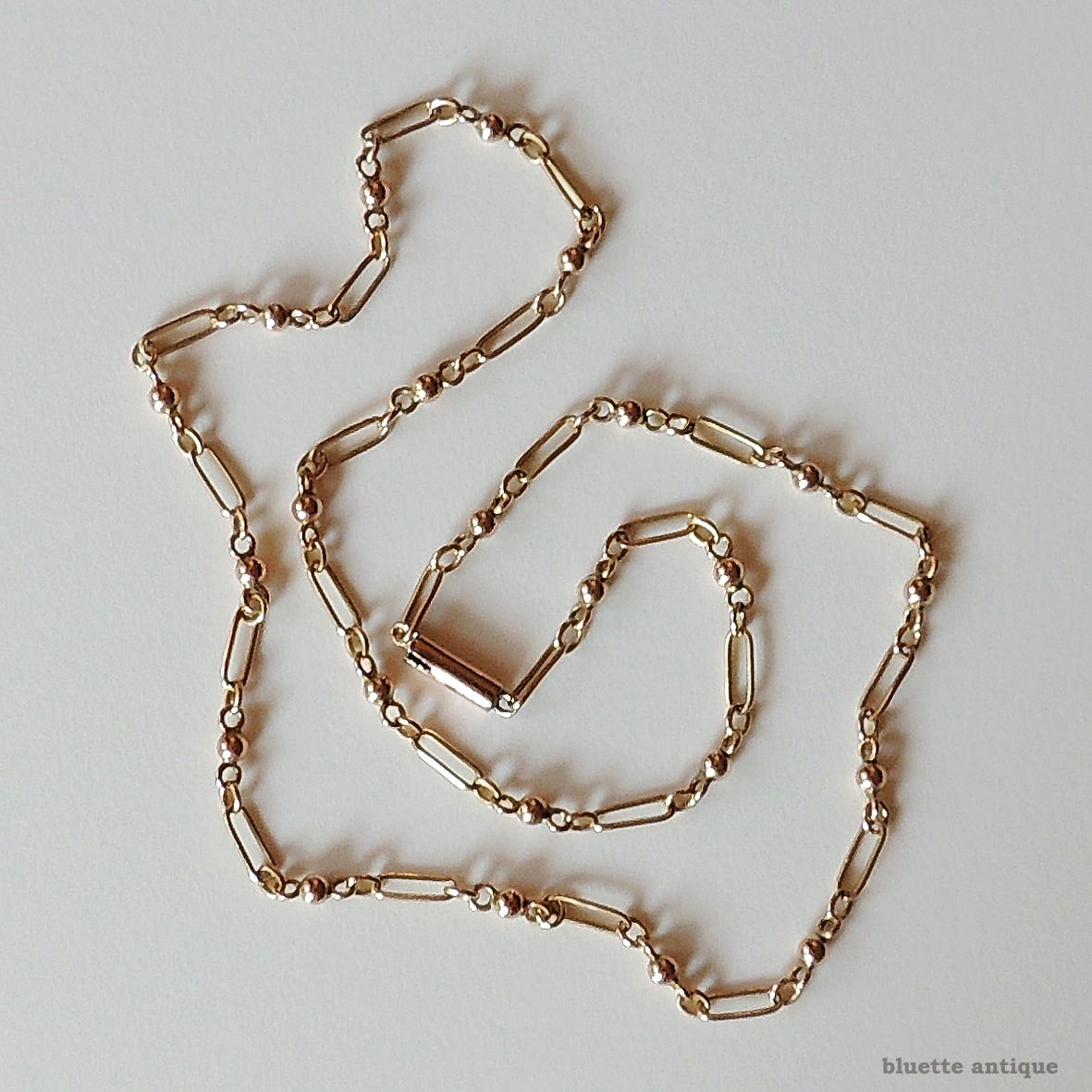 約42cm、9金の刻印の残る、大小のリンクを丁寧に繋いだ美しいフィガロチェーン。約5グラムと十分なボリュームが有ります。