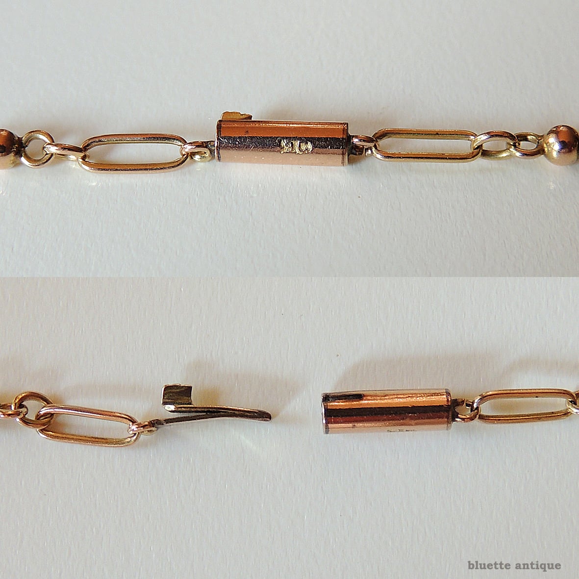 バレルクラスプは、アンティークのチェーンによく見られるもの。くの字に曲がった留め具を挿し込みます。こちらはしっかりと気持ちよく留まります。