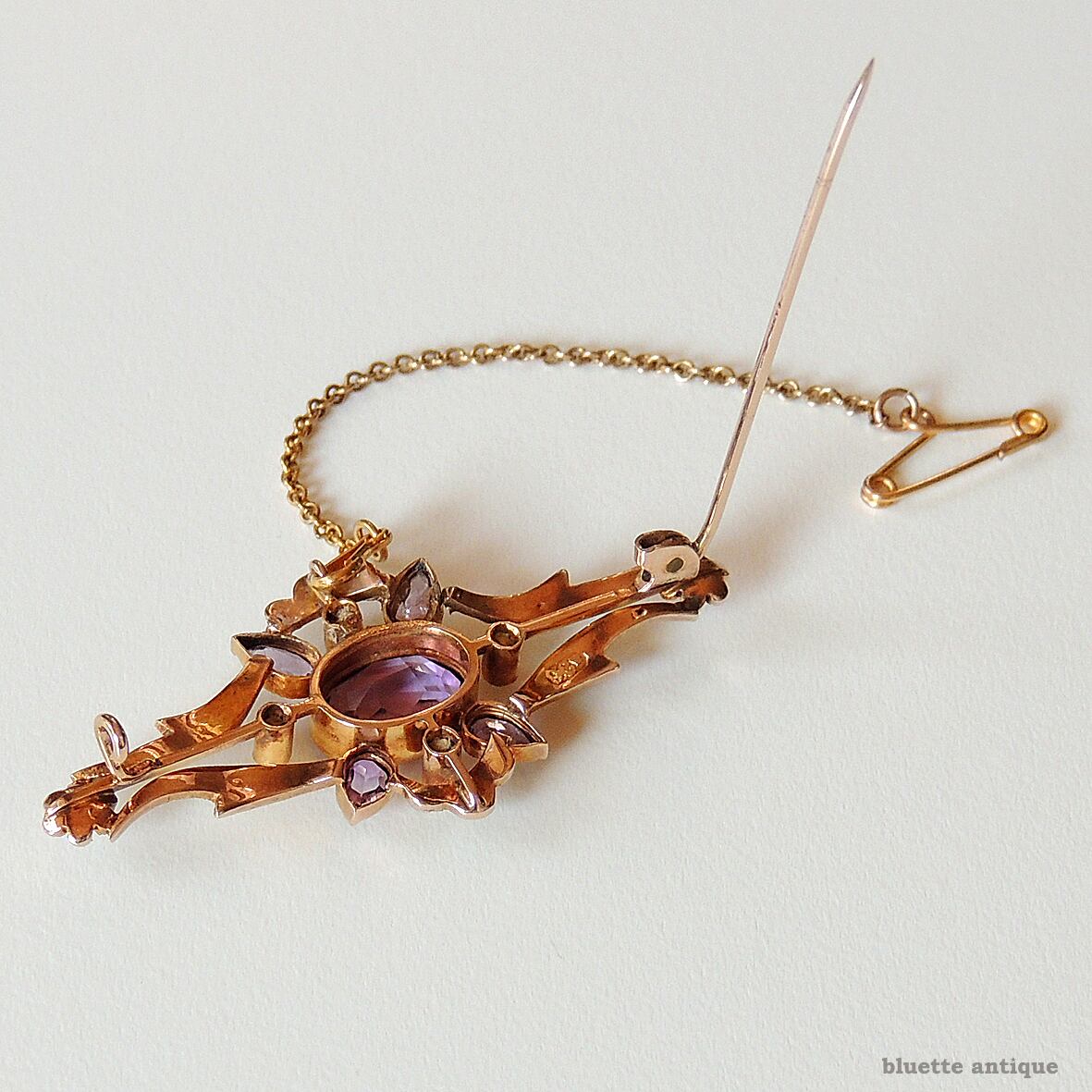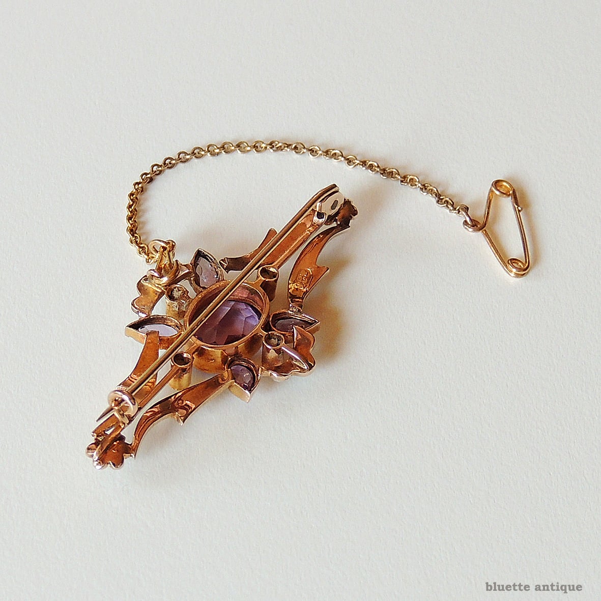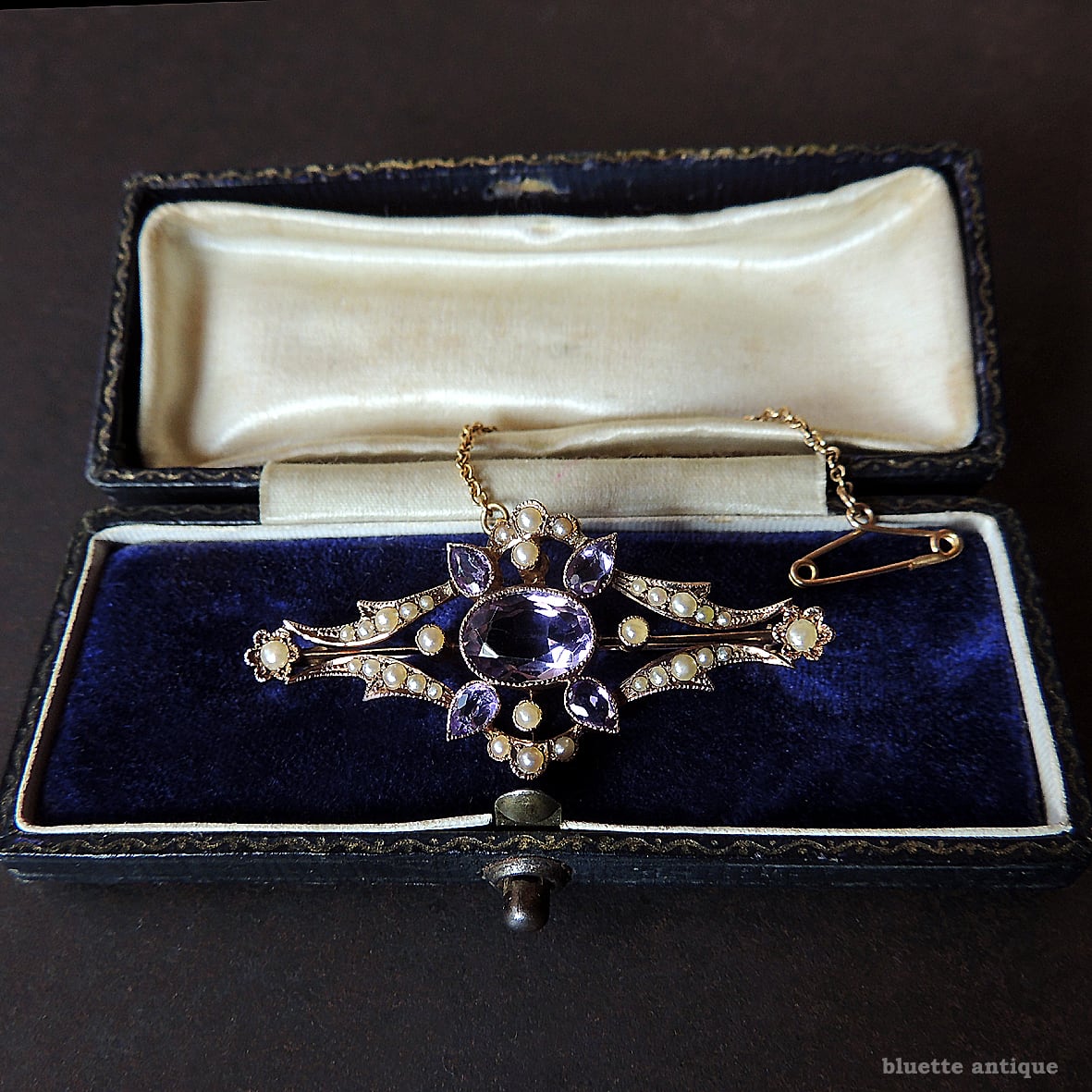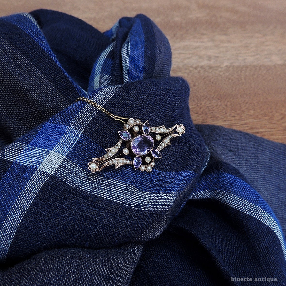 伸びやかなアール・ヌーヴォーデザインが美しいブローチ。両端のお花の台座に留まる真珠も愛らしいです。澄んだ紫のアメシストと散りばめられた真珠がとても魅力的です。