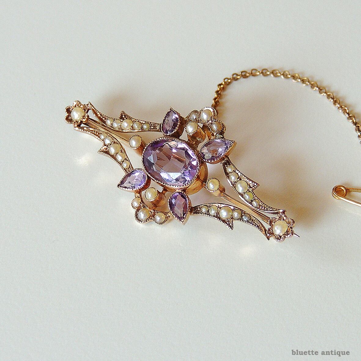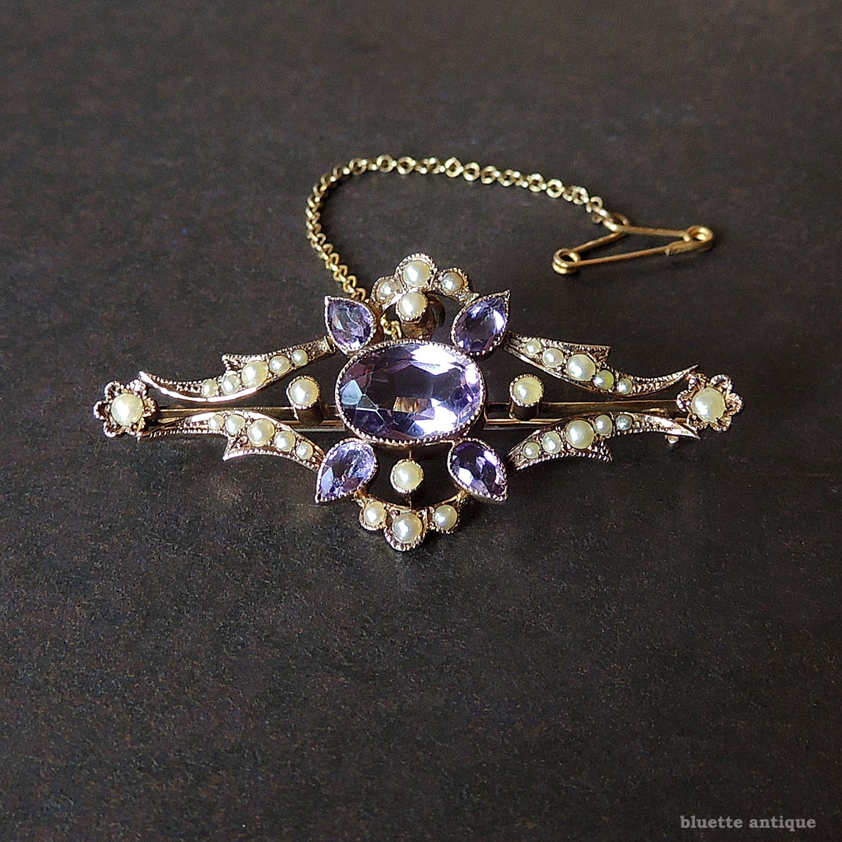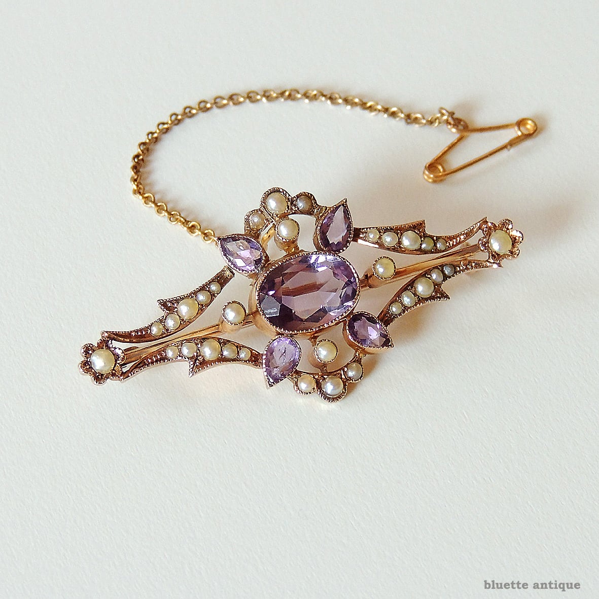 アンティークジュエリー アール・ヌーヴォー 9ctゴールド 天然アメシスト 真珠 ブローチ(ソーティングメモ付)【訳有り】