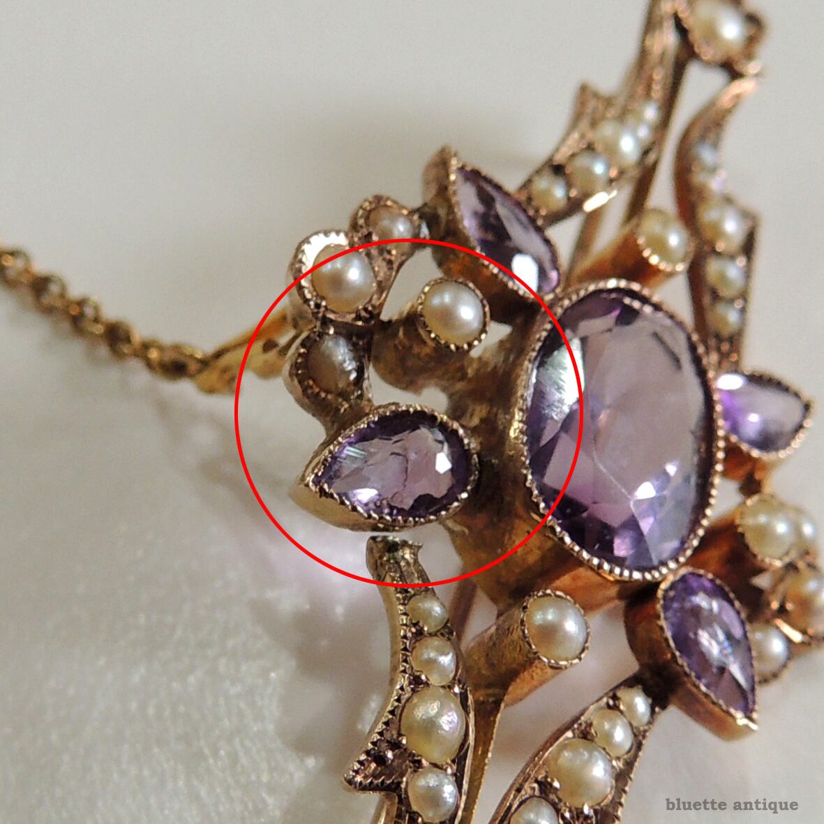 ルーペで確認すると、アメシストや真珠に僅かな擦れ・欠け、インクルージョン、接着剤のはみだし等有。
