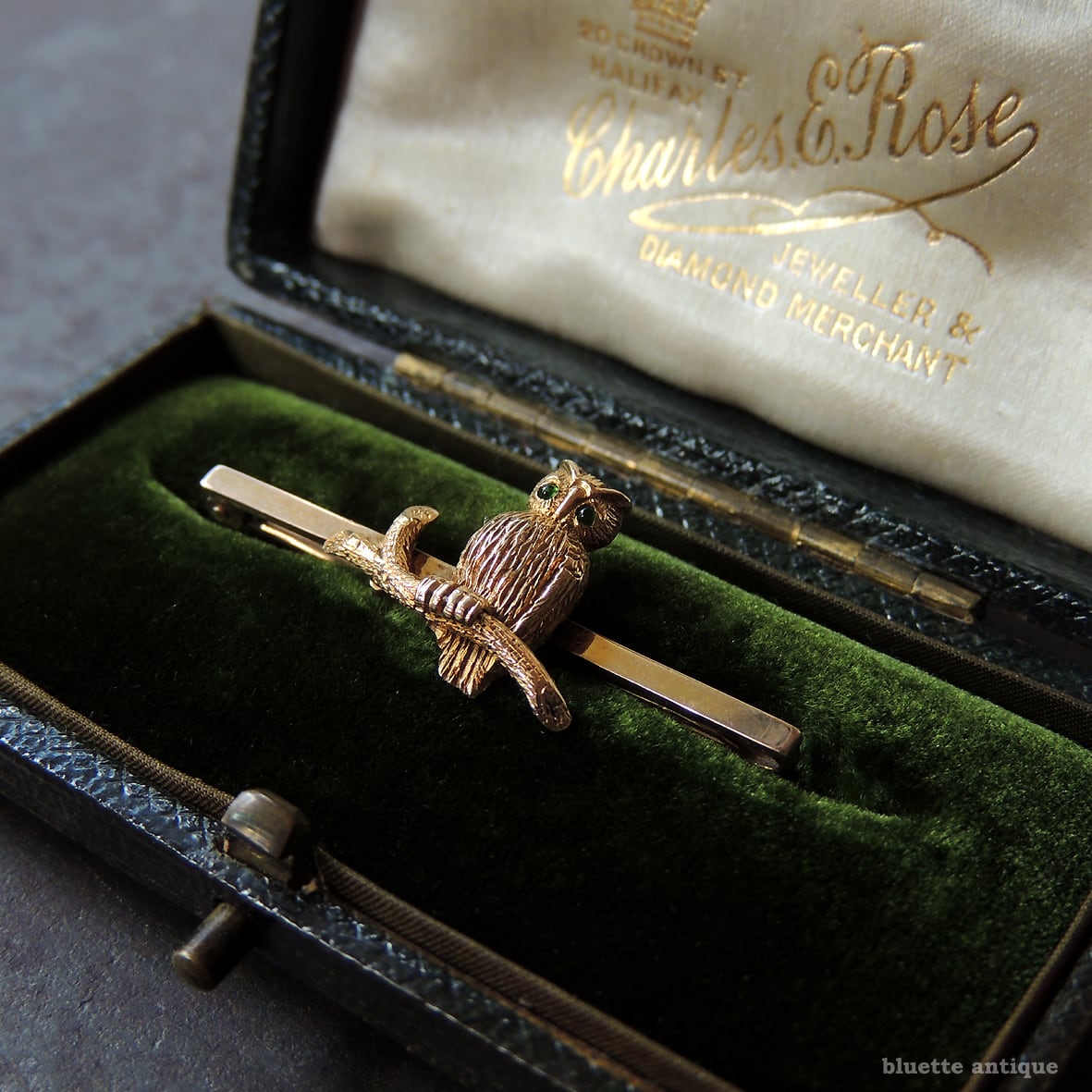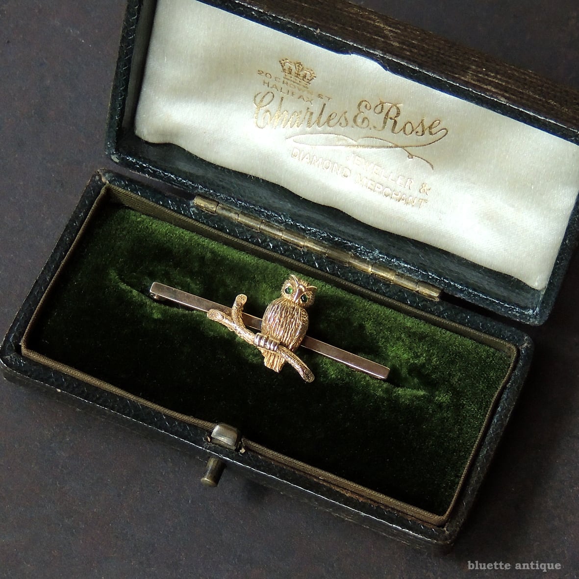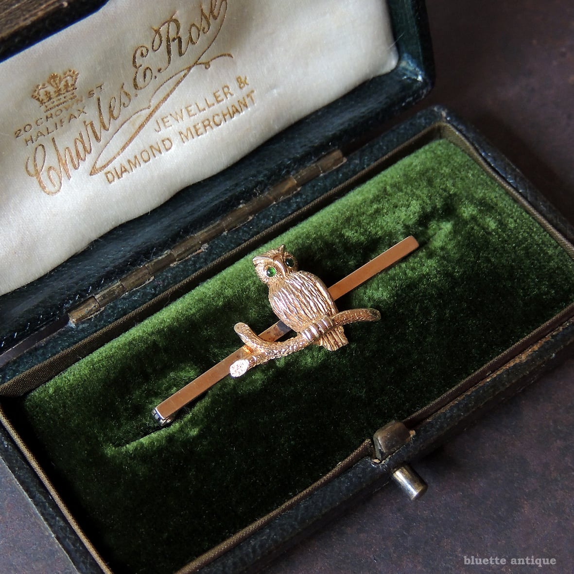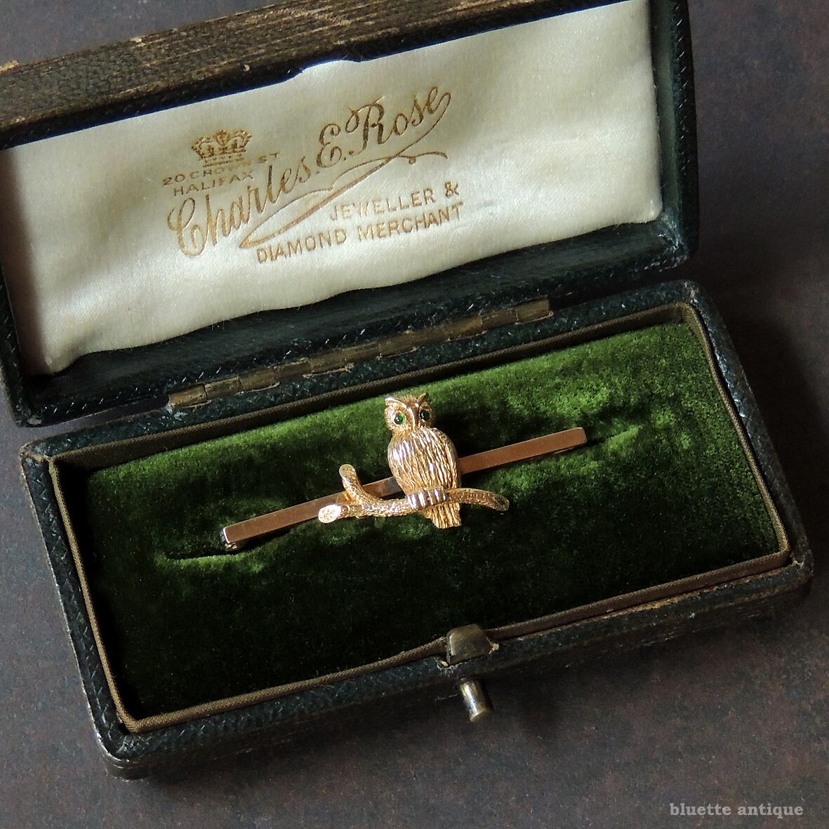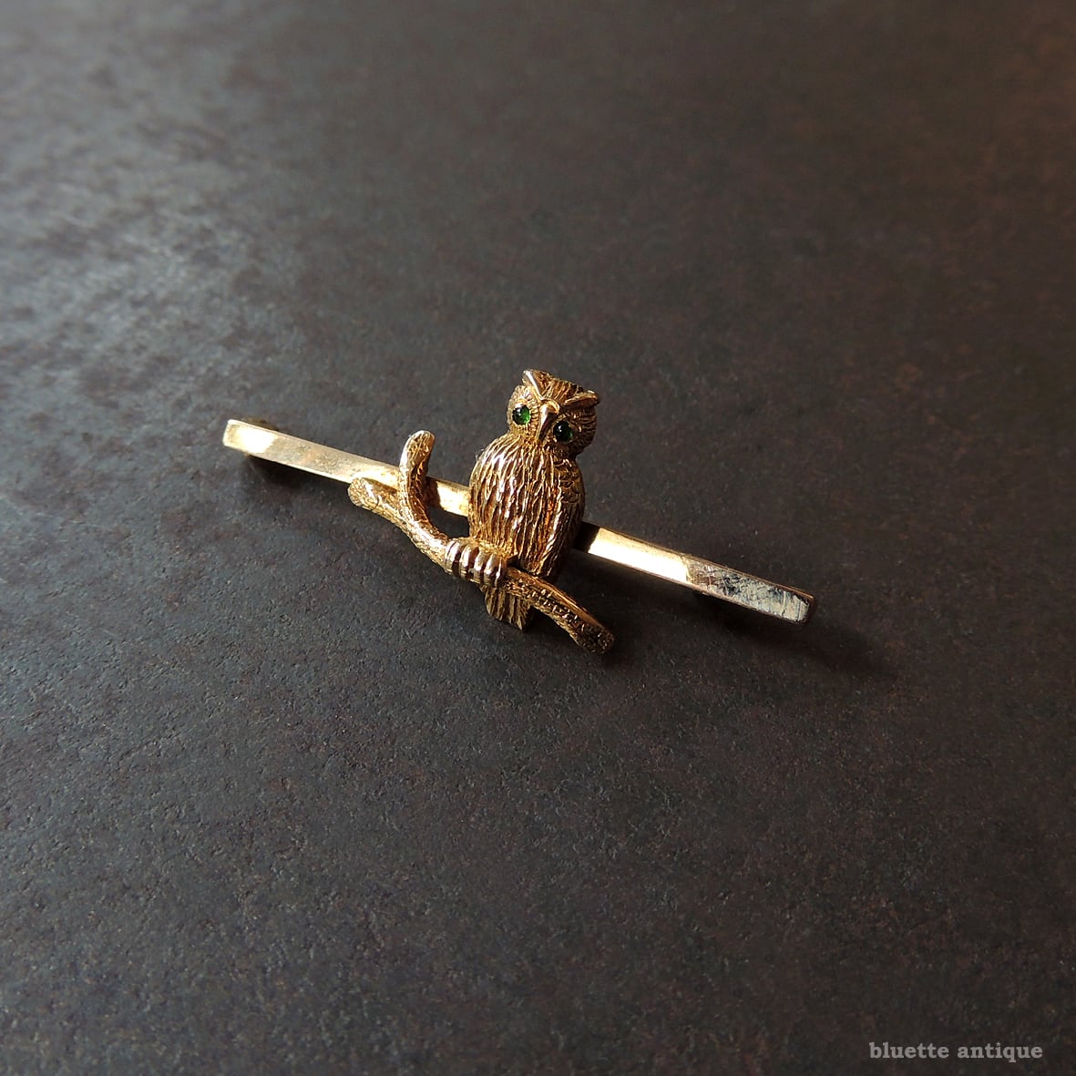 イギリスより、英国アンティーク、15金、グリーンアイ、フクロウのブローチです。フクロウ本体は15金、バー部分は9金。刻印は有りませんが、鑑別機関にて検査済です。