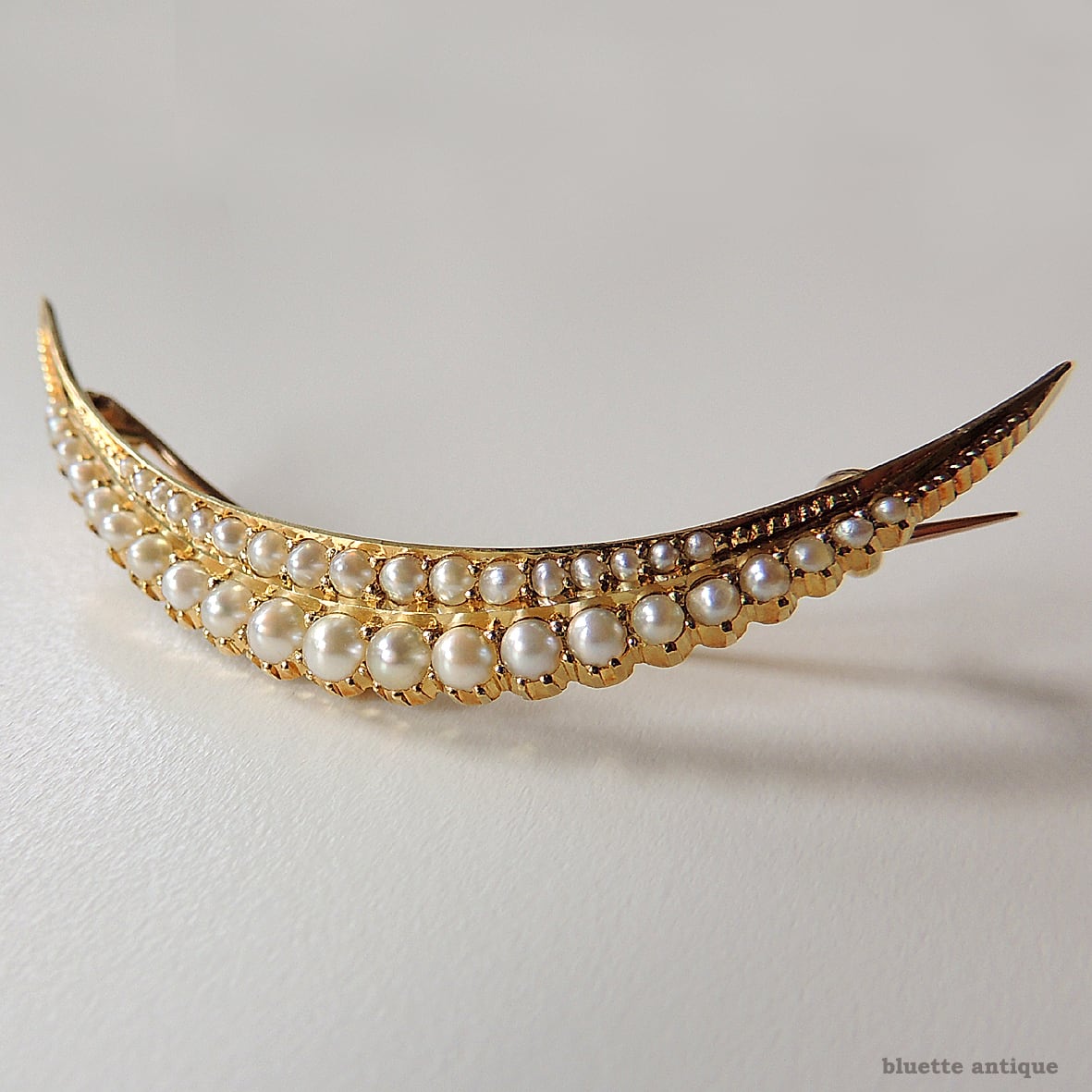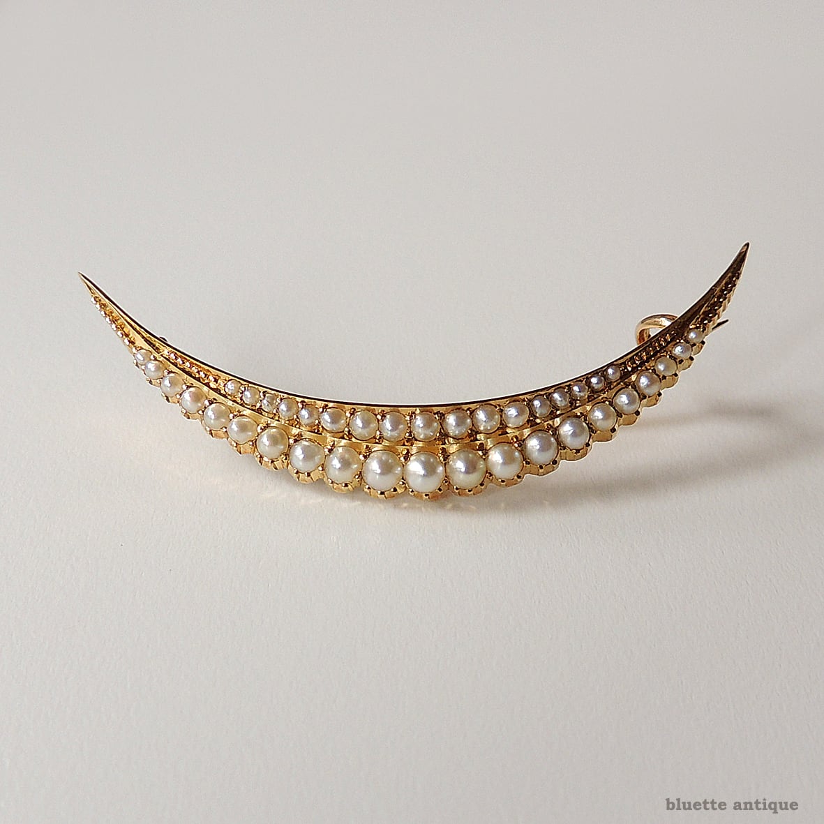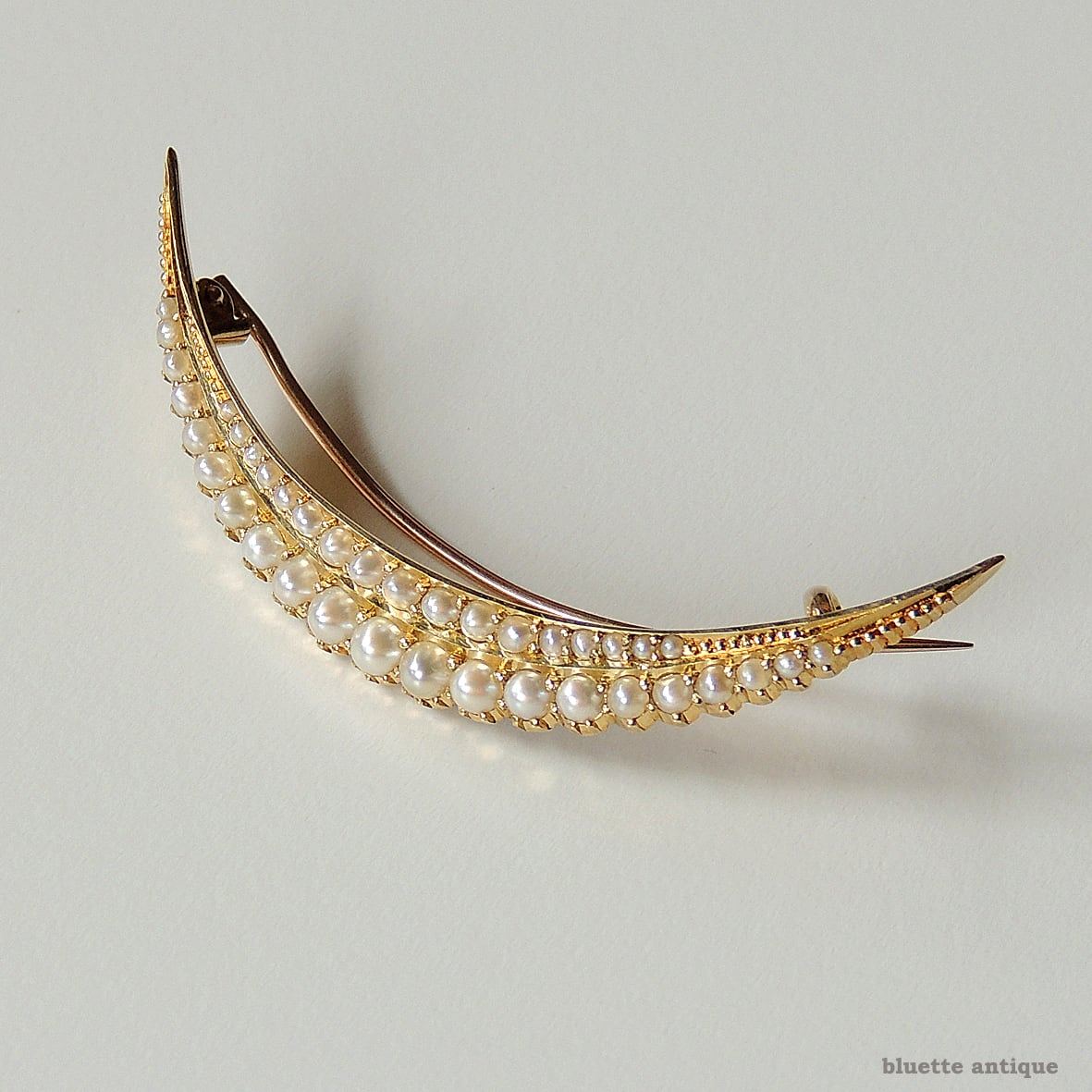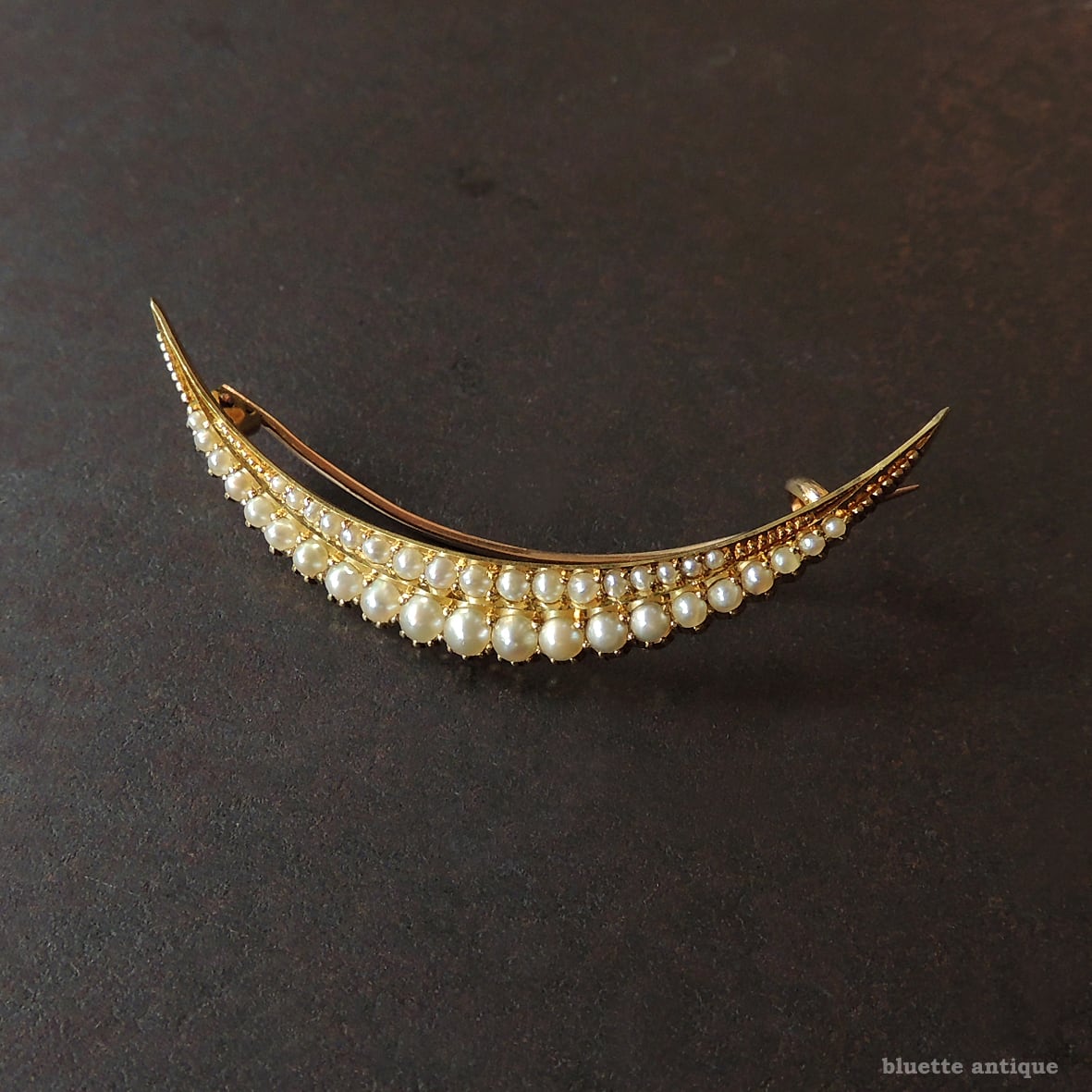 英国アンティークジュエリー 15ctゴールド 二重真珠 クレセント(三日月)ブローチ(ソーティングメモ付)