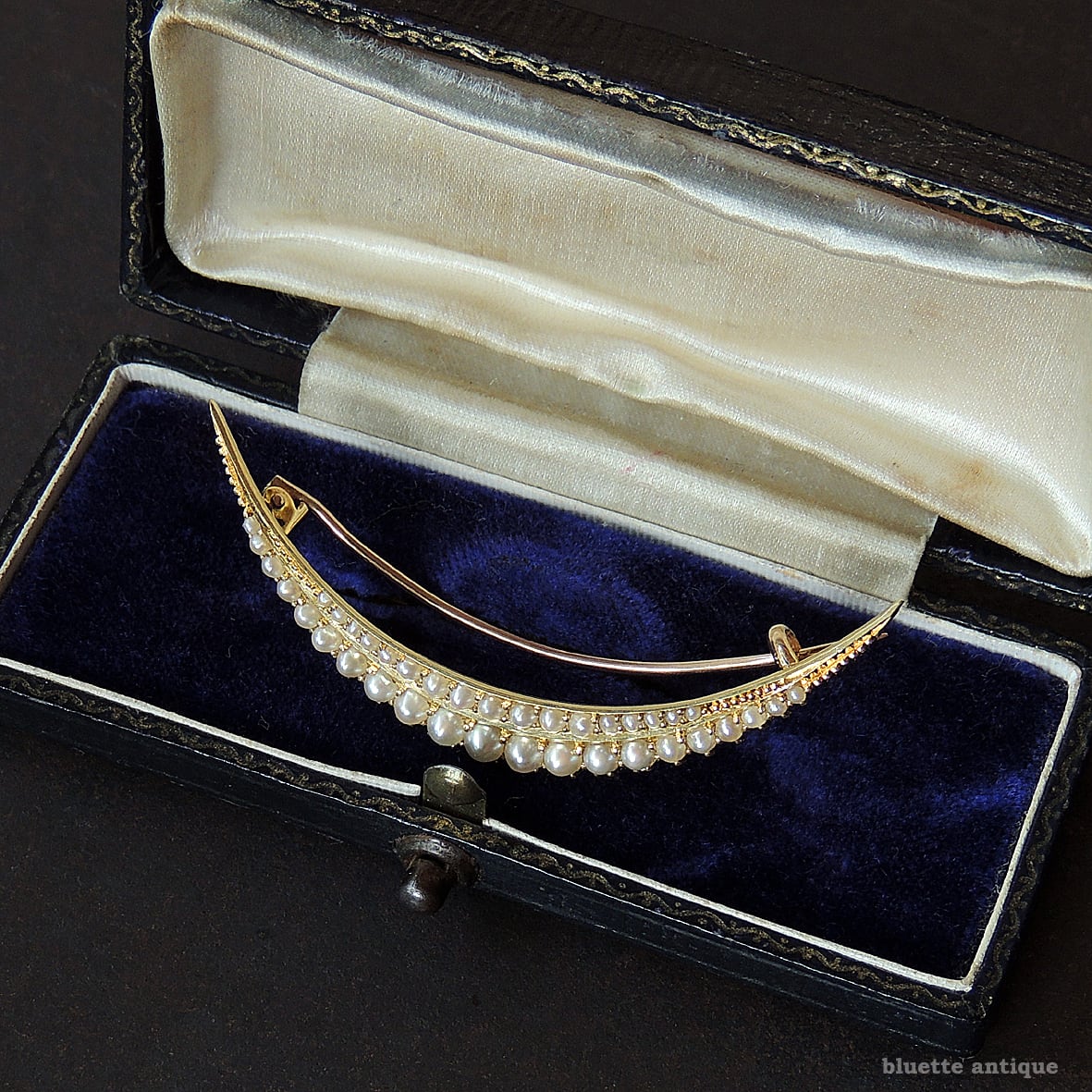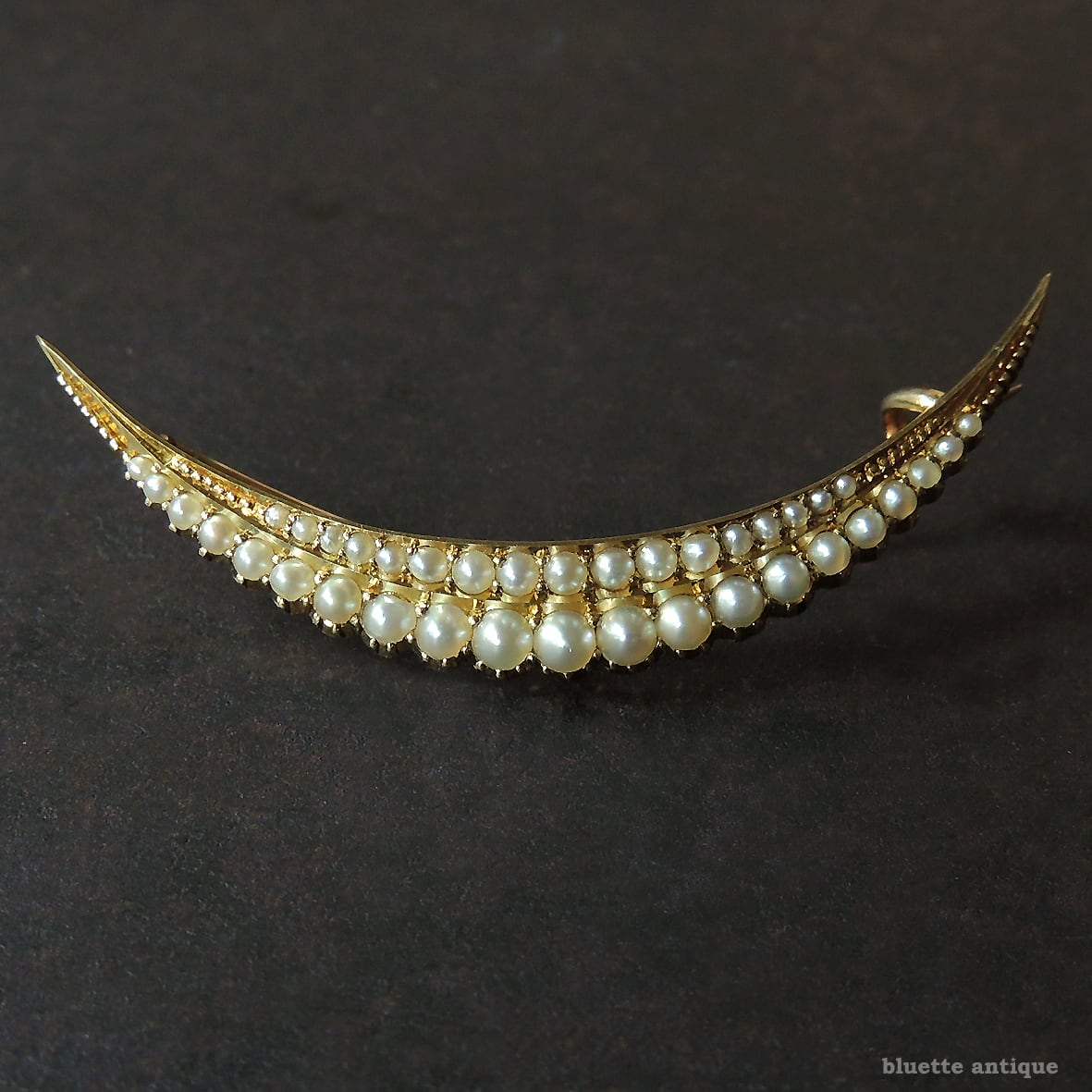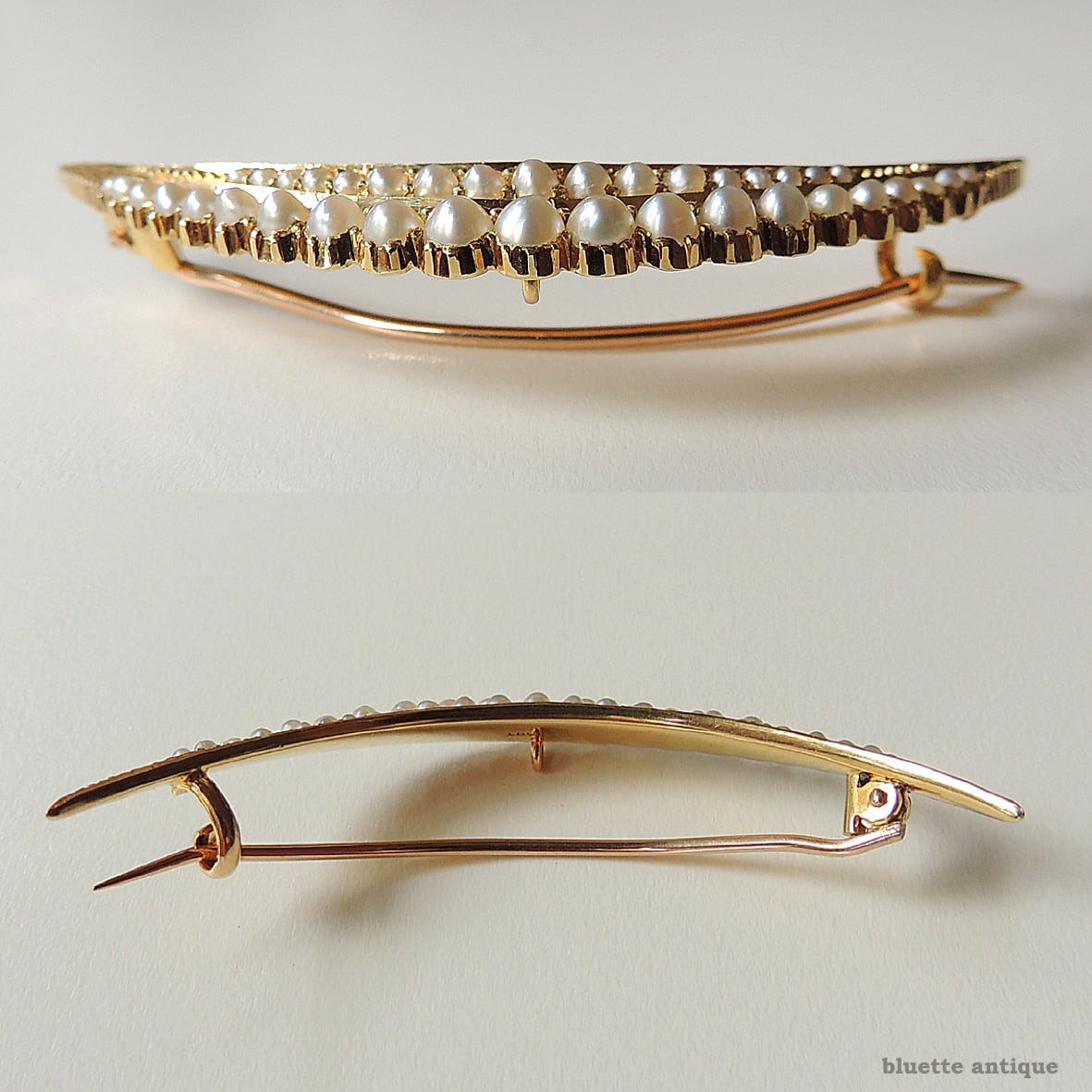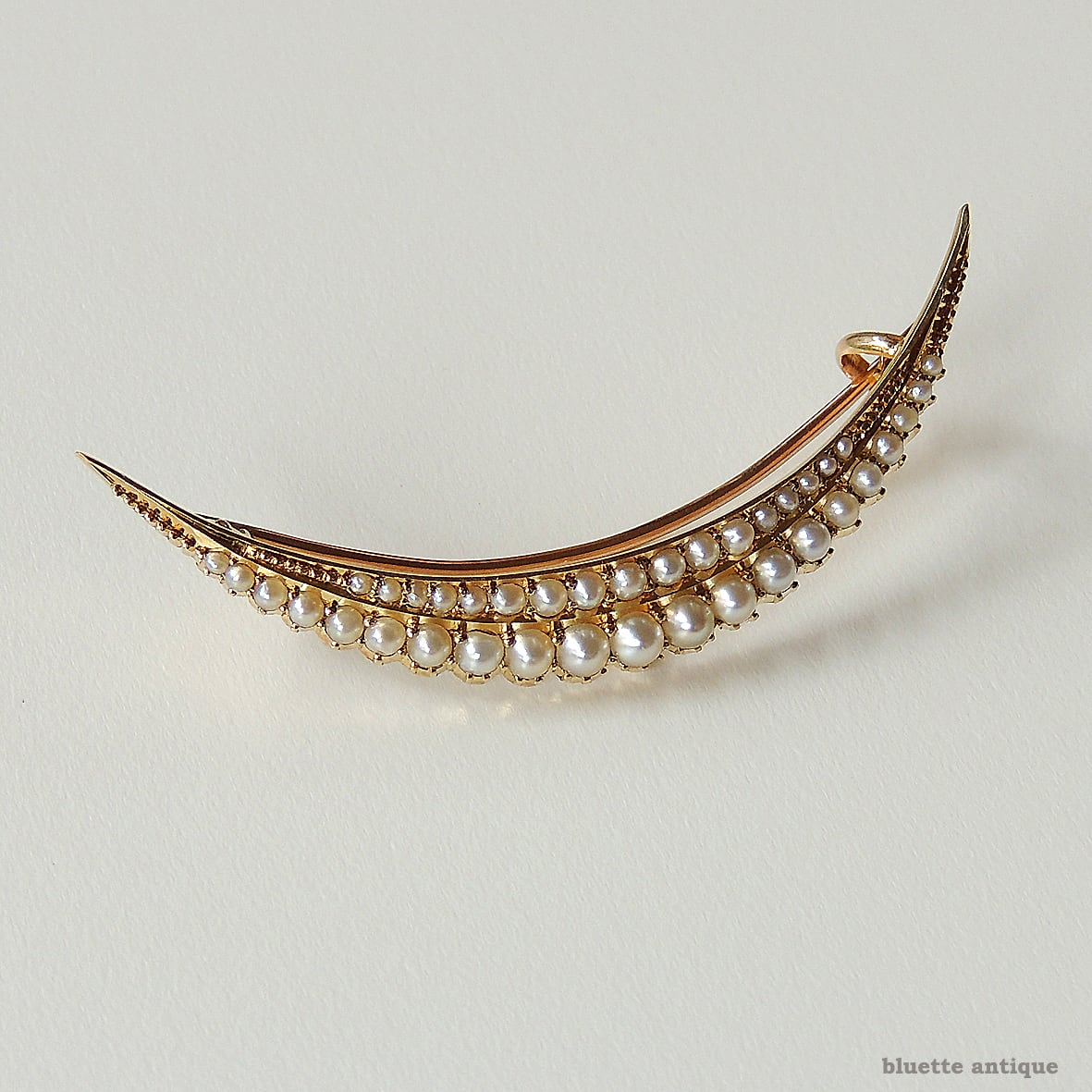 英国アンティークジュエリー 15ctゴールド 二重真珠 クレセント(三日月)ブローチ(ソーティングメモ付)