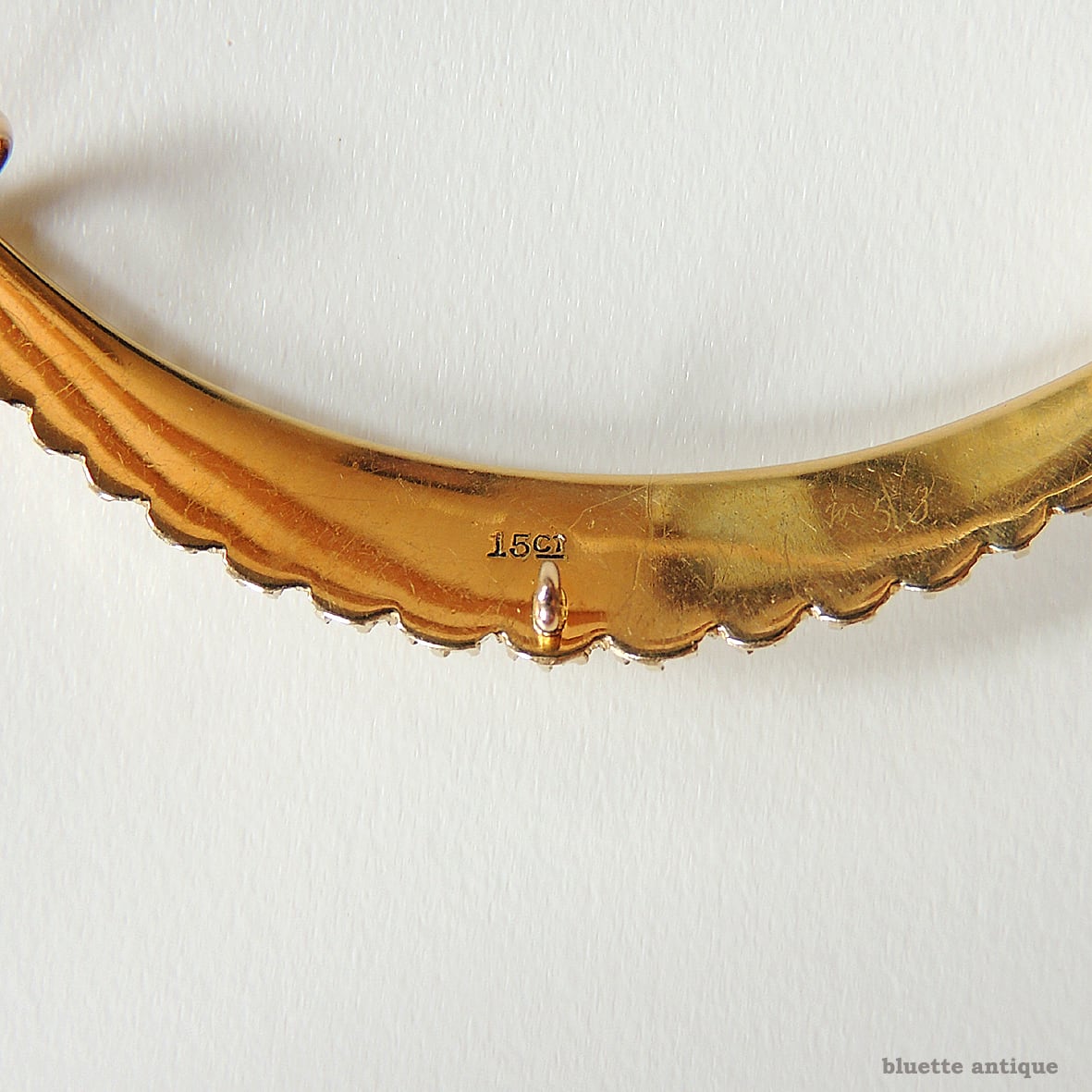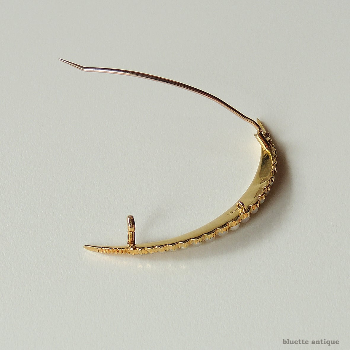 英国アンティーク、15金、二重真珠、クレセントのブローチです。縦約2.3センチ、横約5.4センチのやや存在感あるクレセント。15金の台に2列に並んだ真珠が繊細でエレガントです。背面に金の品位をあらわす「15CT」の刻印が有ります。セーフティーチェーン用のループが一つ付いています。