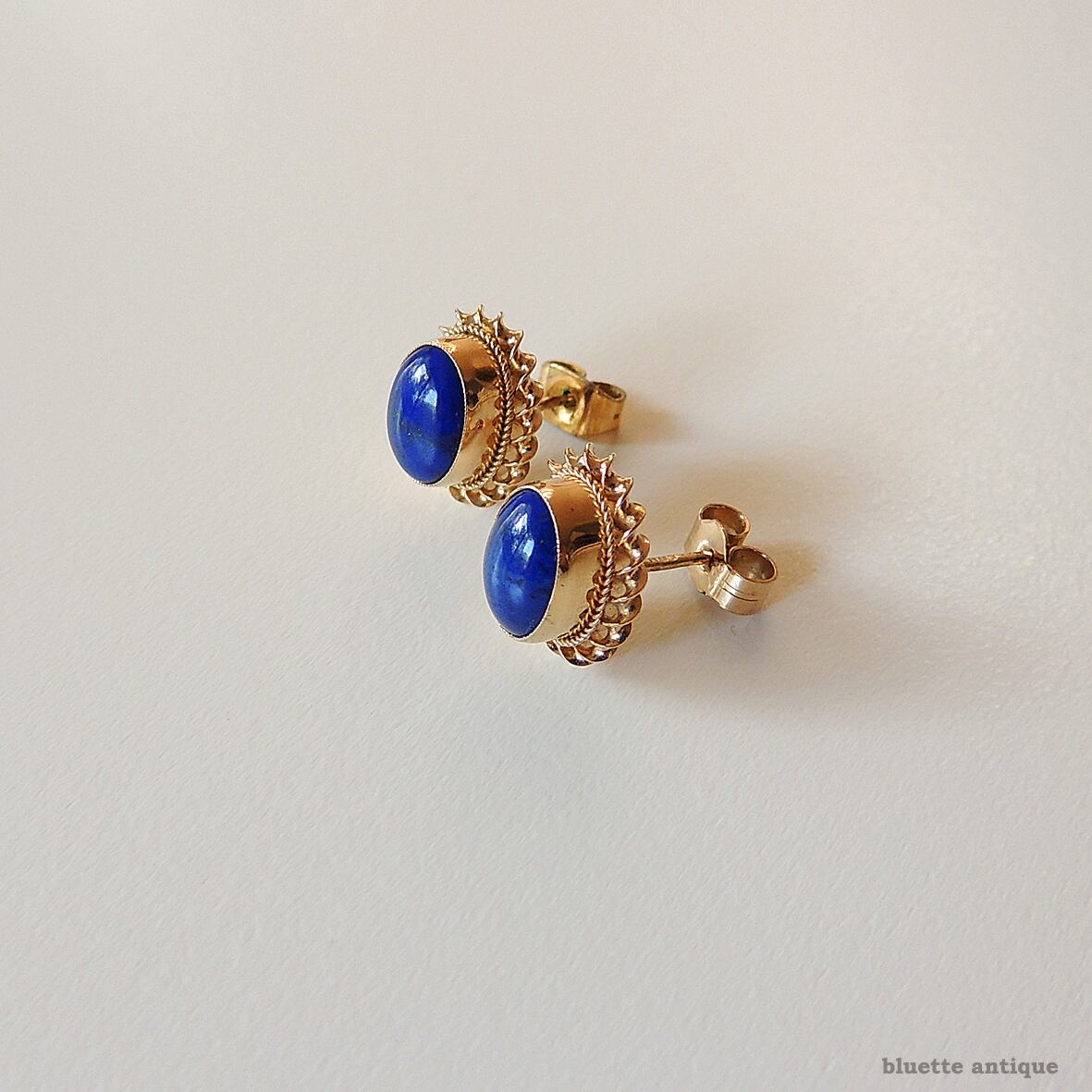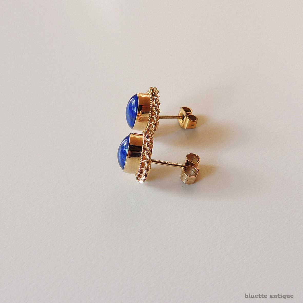 ルーペで確認すると、ラピスラズリの表・裏面に、僅かな擦り傷等有りますが、肉眼では気になりません。ポストに僅かな曲りが有りますが、装着に問題は有りません。金属部分に経年による黒ずみ・僅かな緑青等有りますが、全体的にはとてもよいコンディションです。