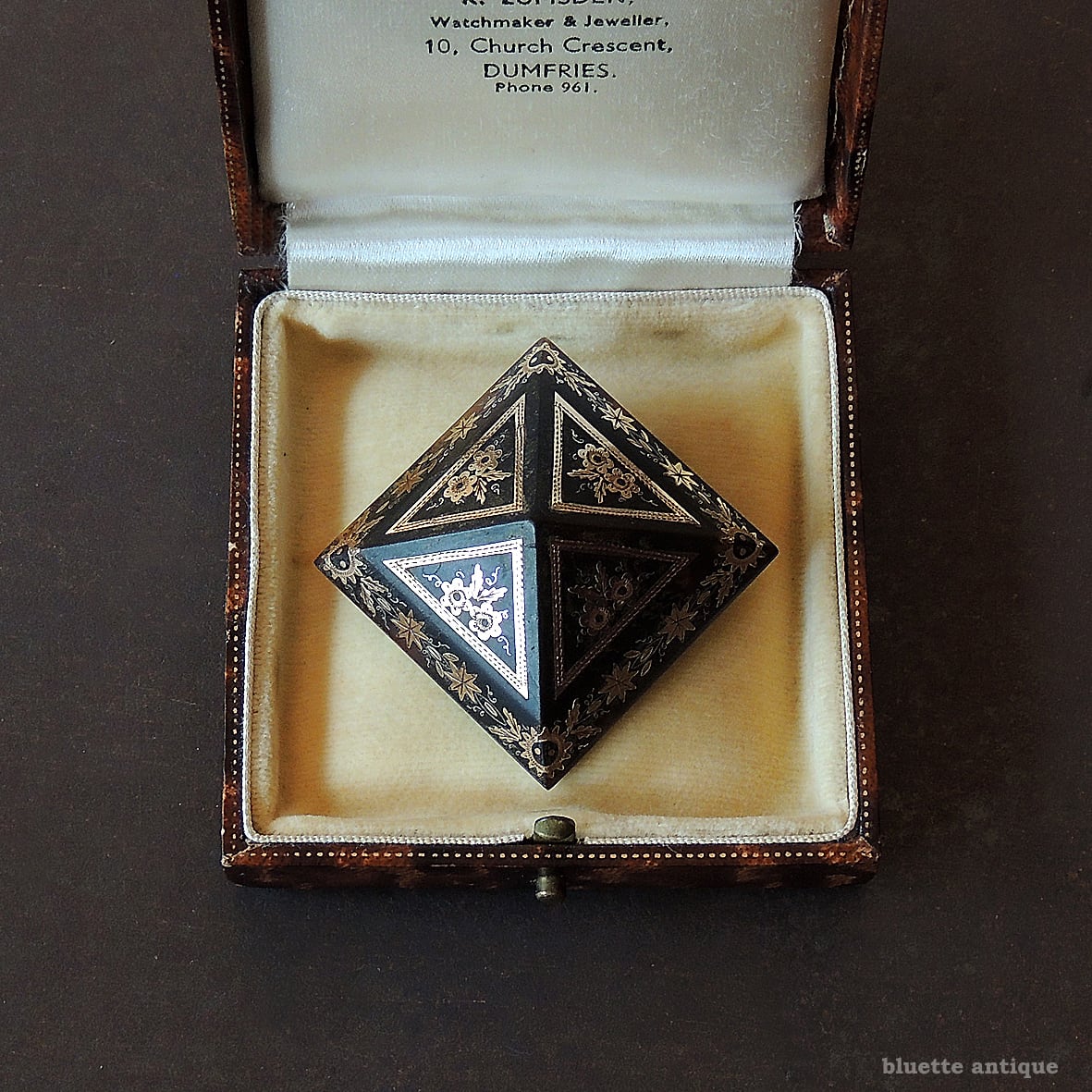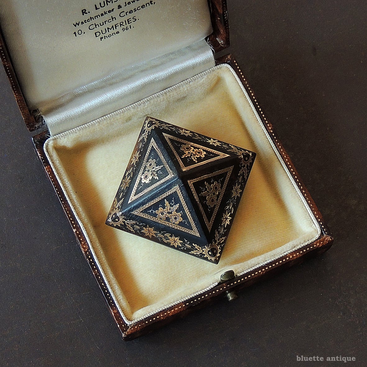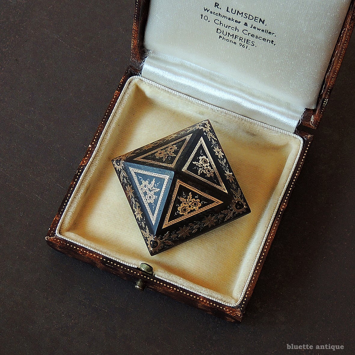 べっ甲に金銀や真珠母貝などを象嵌したもの。日本の蒔絵に影響を受けたといわれる技法。もとは家具などの装飾でしたが、ヴィクトリアンの頃にはジュエリーとして愛好されました。その詳しい製法は途絶えてしまったため、幻のジュエリーといわれています。