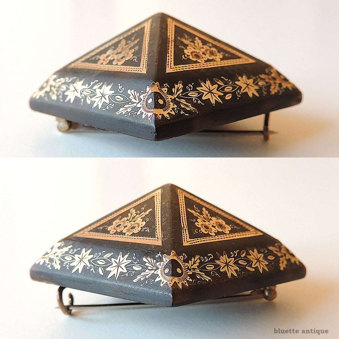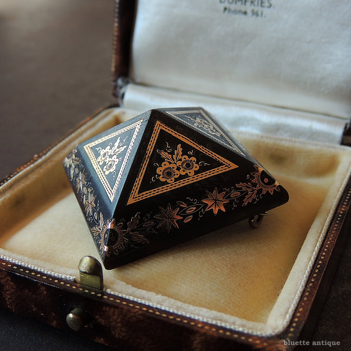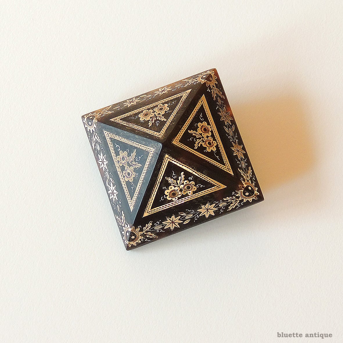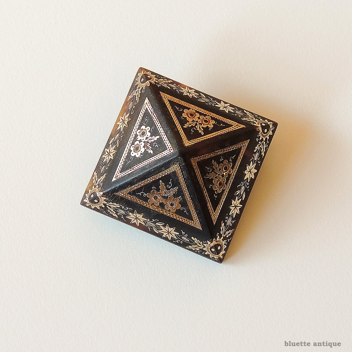 アンティーク、ヴィクトリアンのピクウェです。スクエア、ピラミッド型のべっ甲に、ゴールドとシルバーが象嵌された造形の大変美しいブローチ。