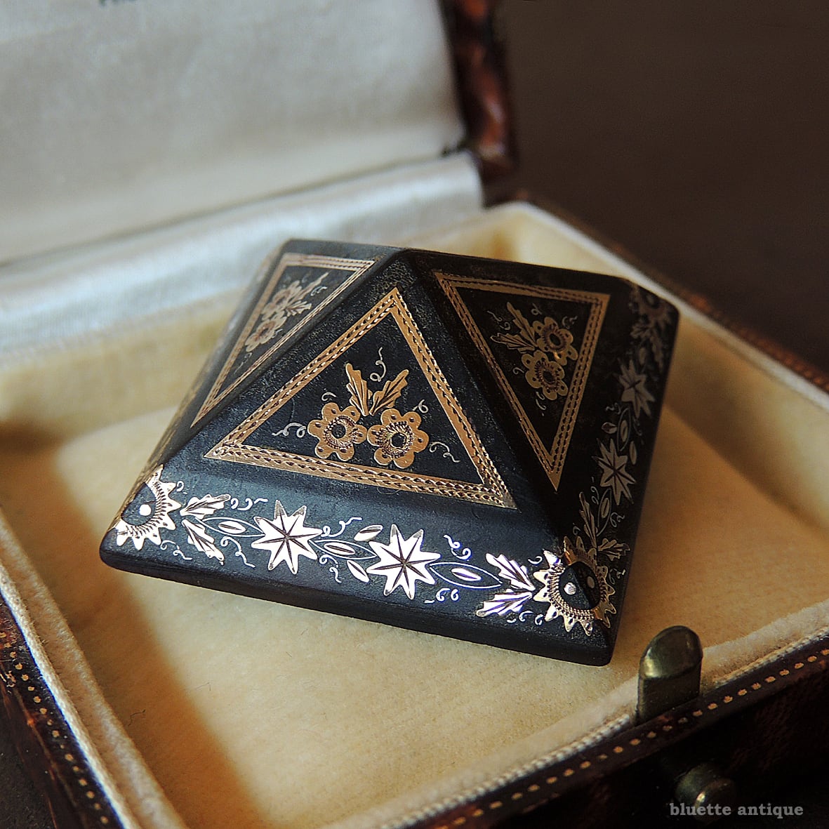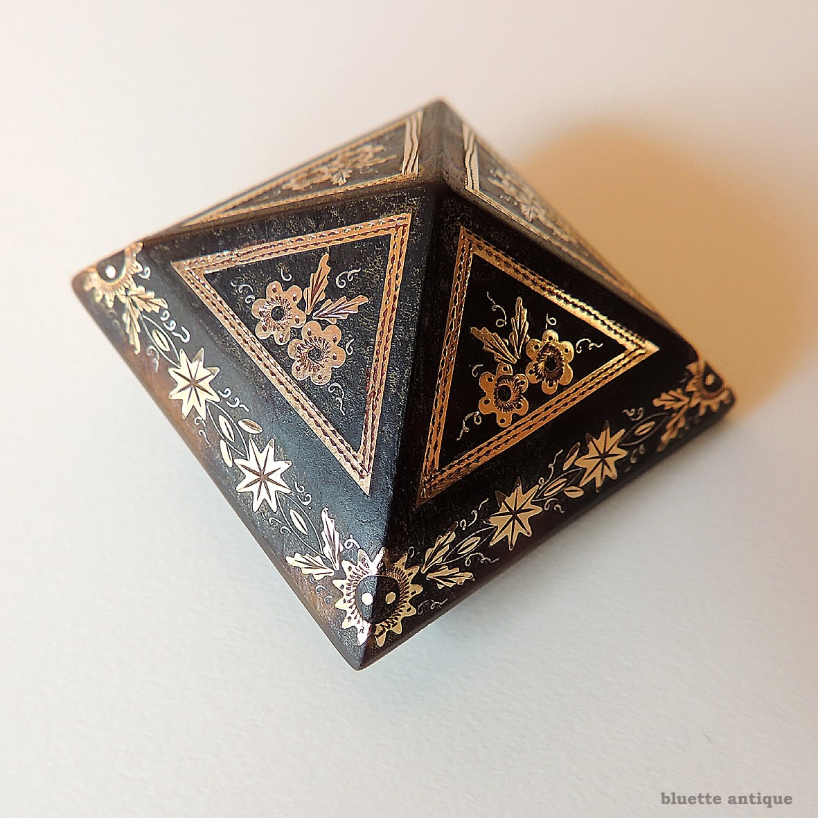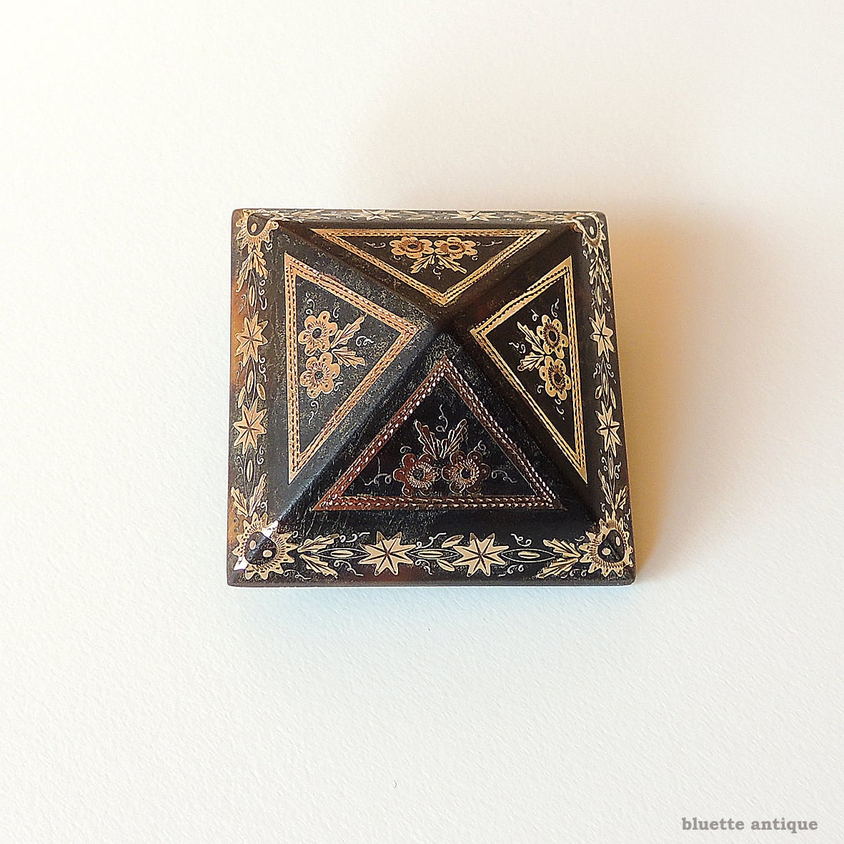 アンティーク、ヴィクトリアンのピクウェです。スクエア、ピラミッド型のべっ甲に、ゴールドとシルバーが象嵌された造形の大変美しいブローチ。