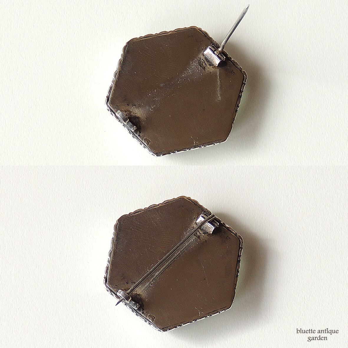 ルーペで確認すると、ガラスの表面に擦り傷、小さな欠け等有。裏のシルバー部分に傷、擦れ、黒ずみ等有。こちらの部分はアンティークの風合いの範囲といえるかと思います。