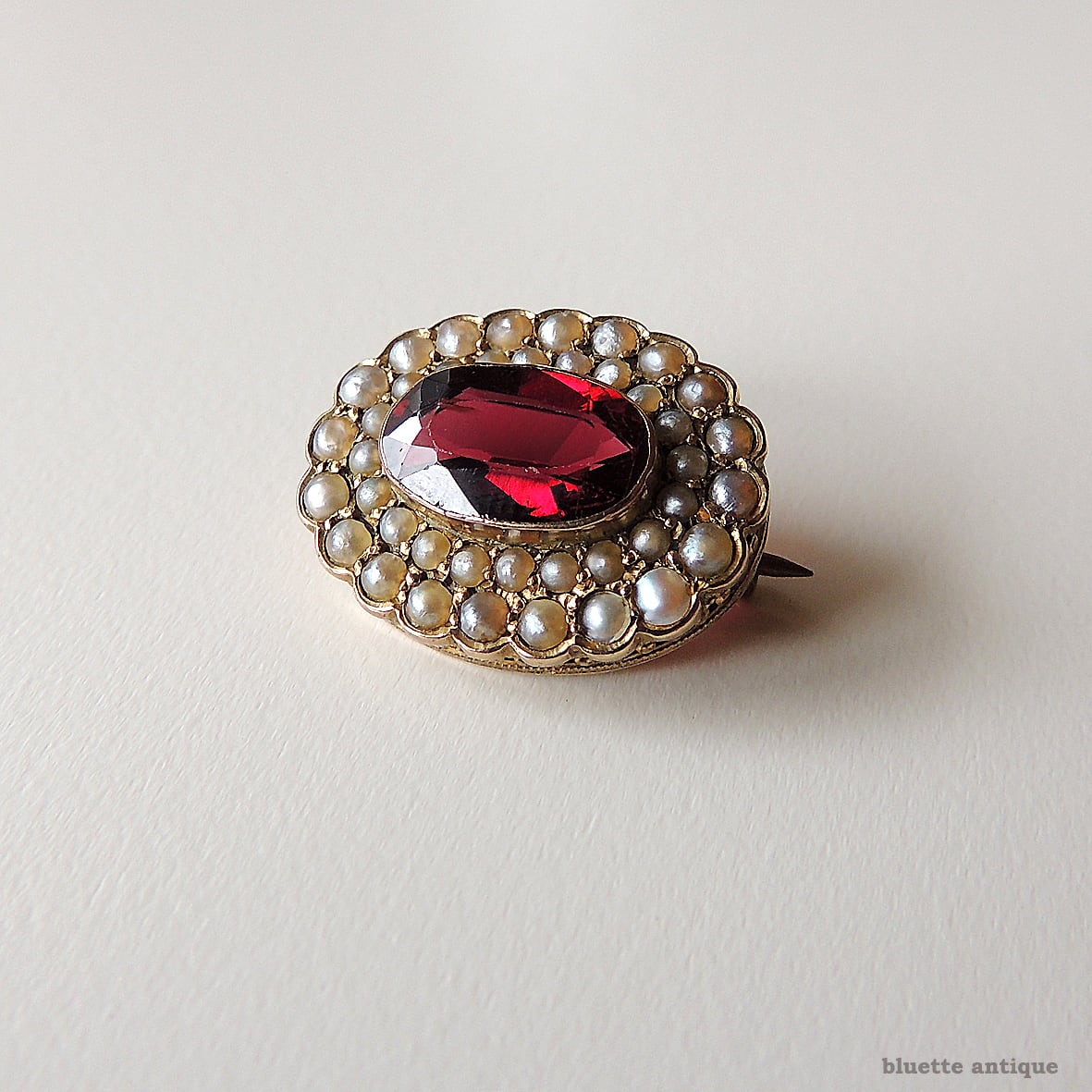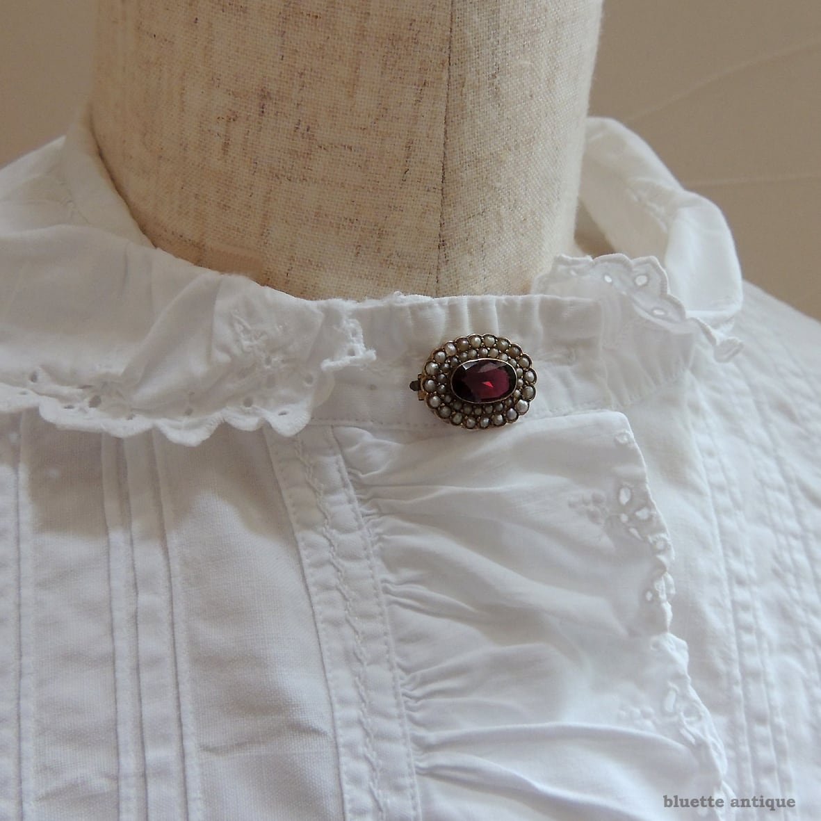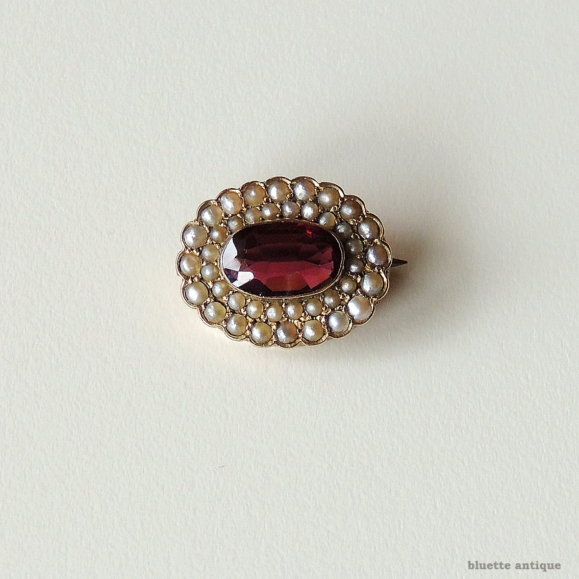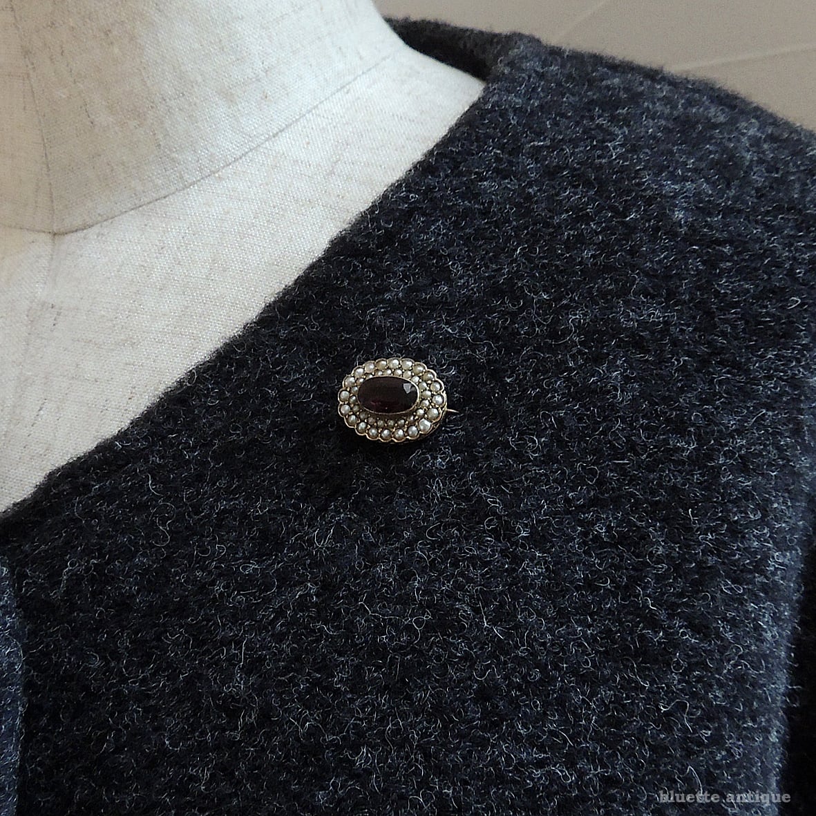 幅約20ミリの小さなレースピン。ガーネットは温かみの有る深い赤。縁取りはややグレーみを感じるシックなカラーのシードパールが二重に取り巻いています。