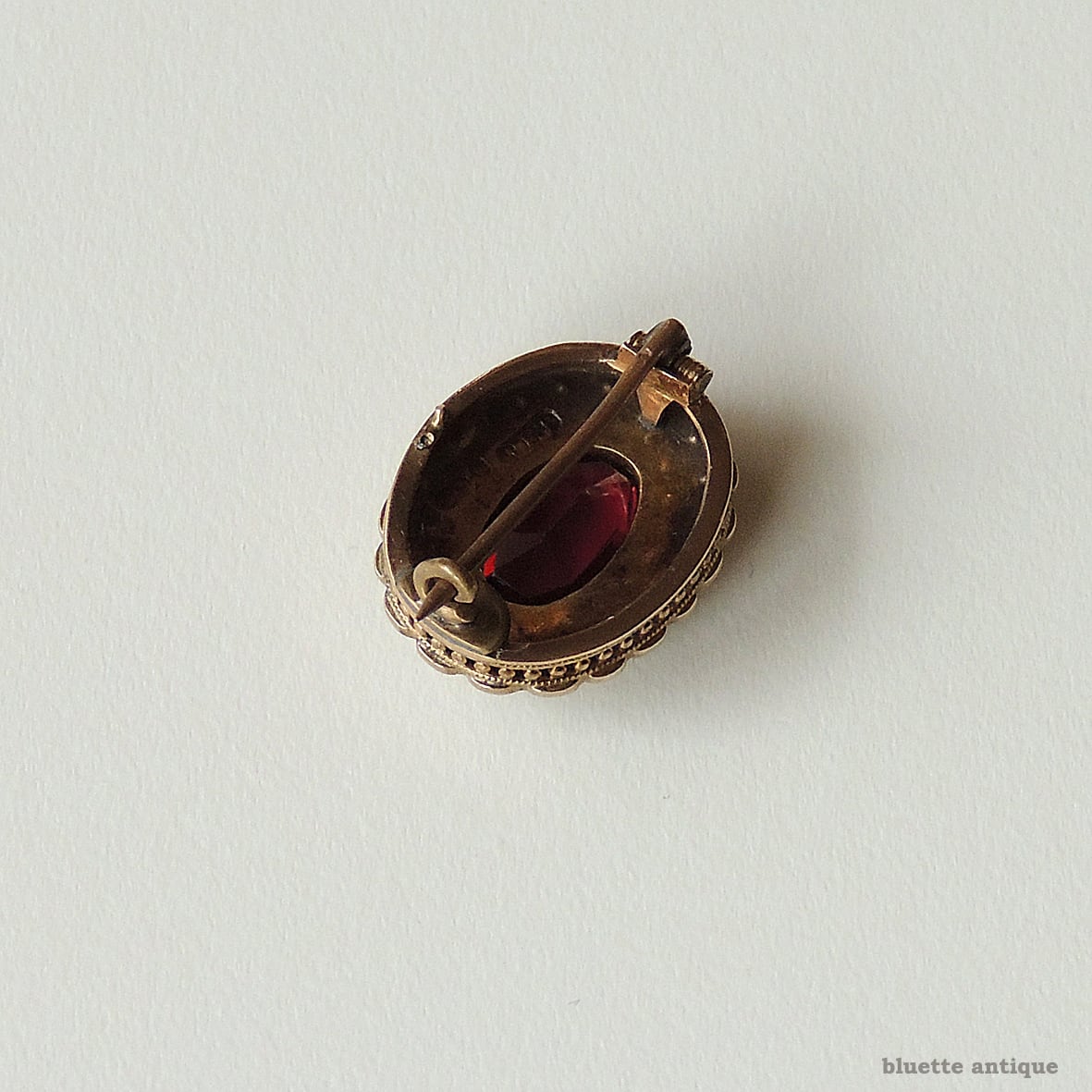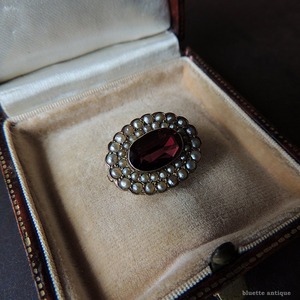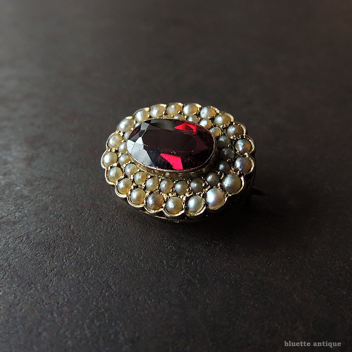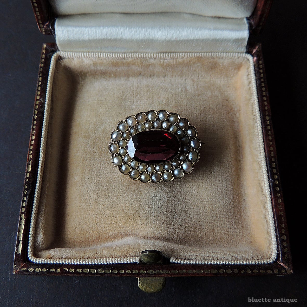 幅約20ミリの小さなレースピン。ガーネットは温かみの有る深い赤。縁取りはややグレーみを感じるシックなカラーのシードパールが二重に取り巻いています。