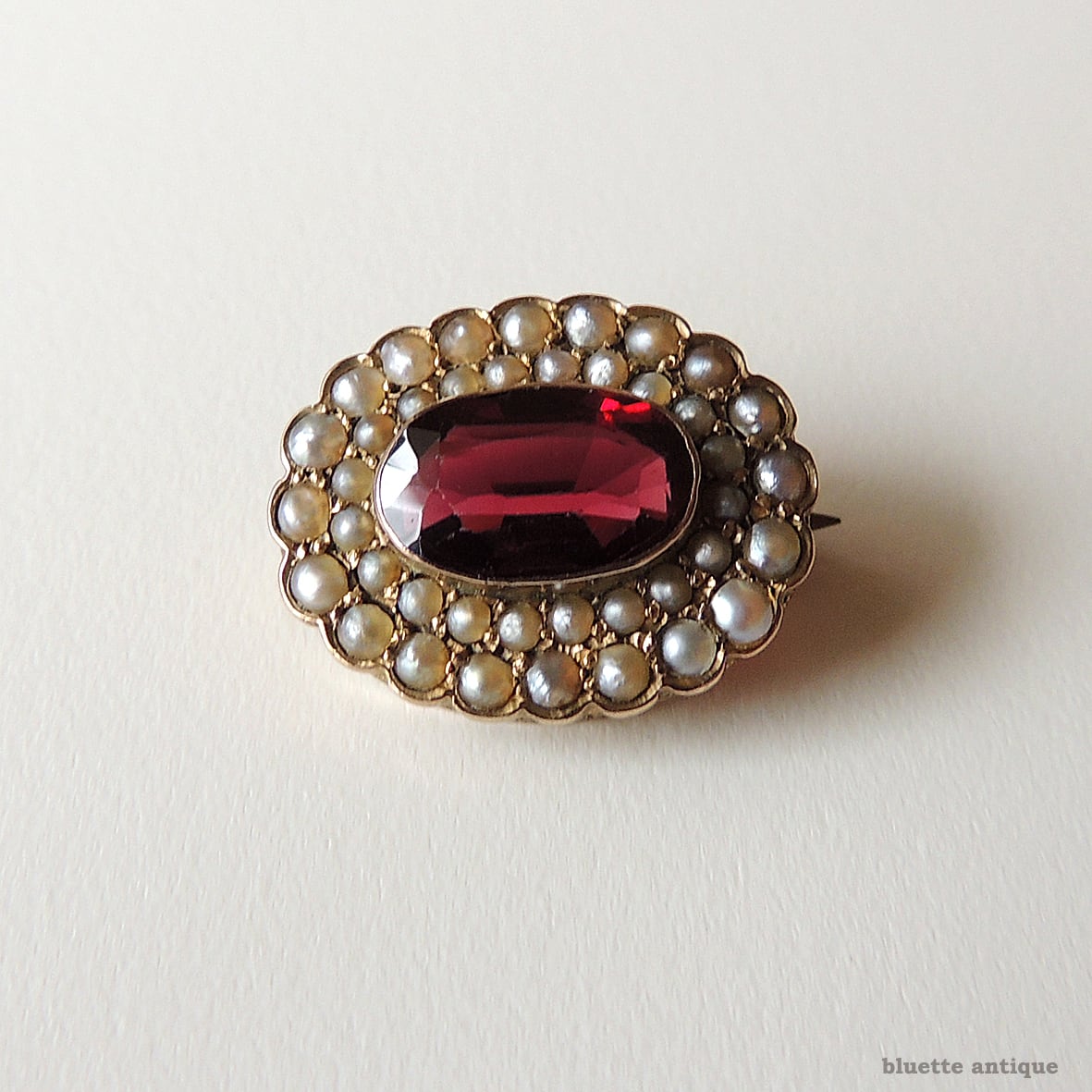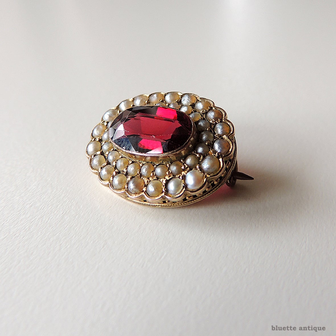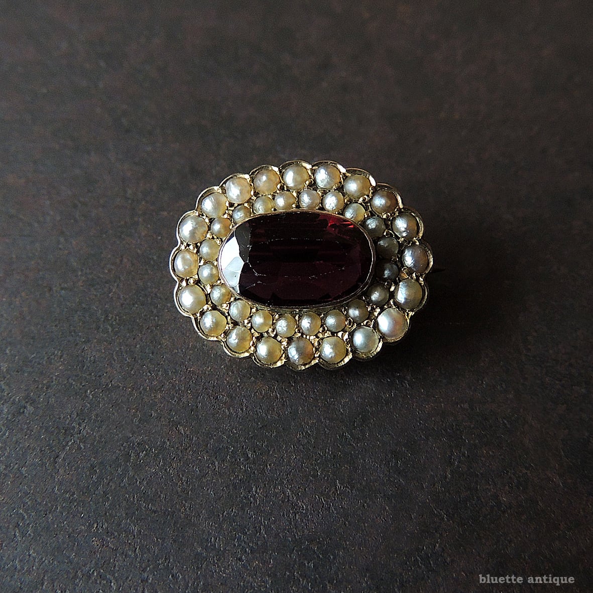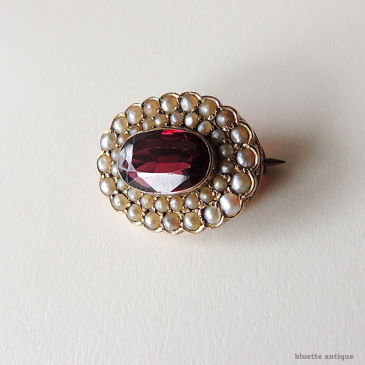 アンティーク、9金、真珠二重取り巻き、天然ロードライトガーネットのレースピンブローチです。