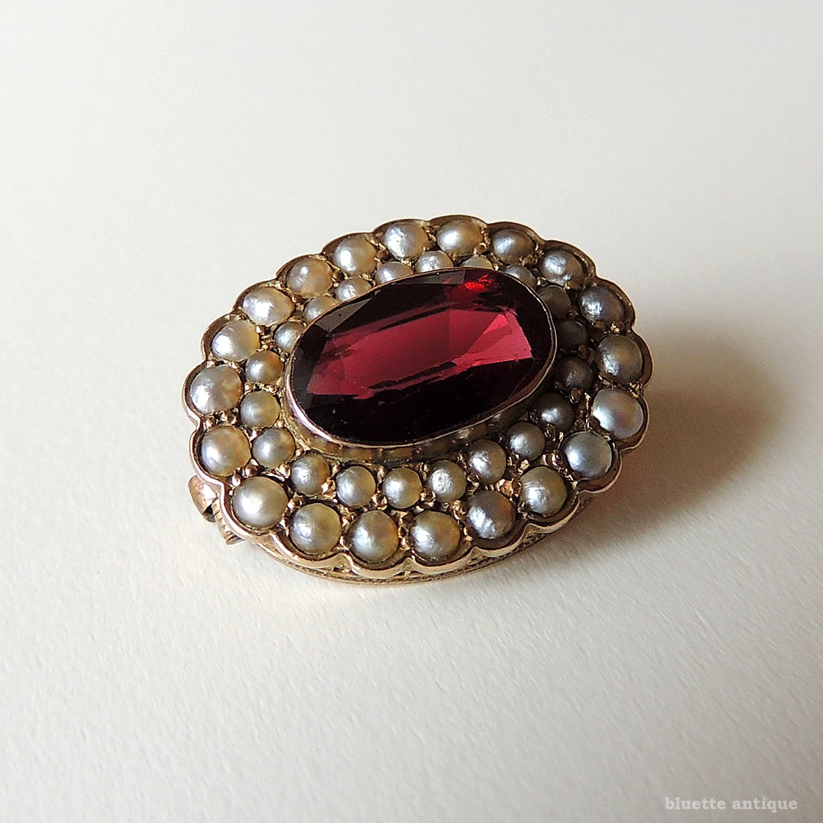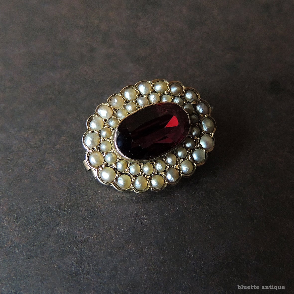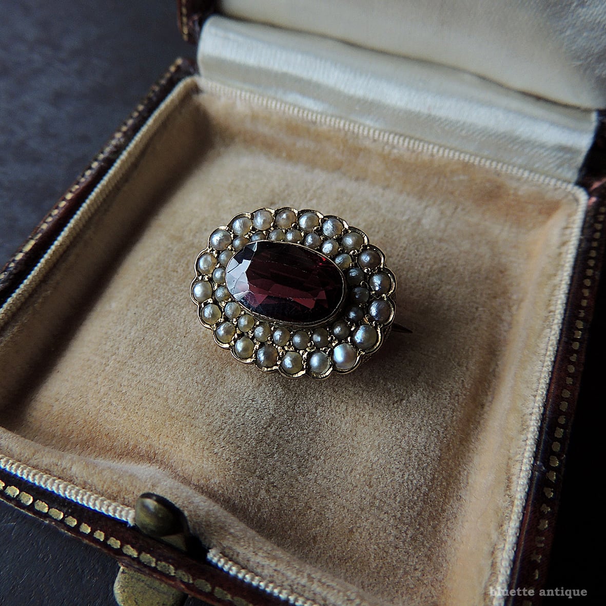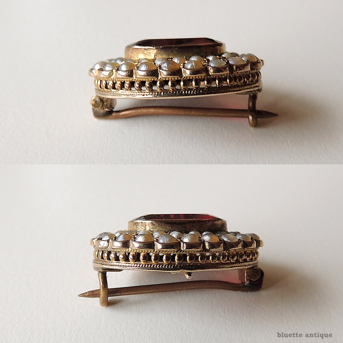 アンティーク、9金、真珠二重取り巻き、天然ロードライトガーネットのレースピンブローチです。