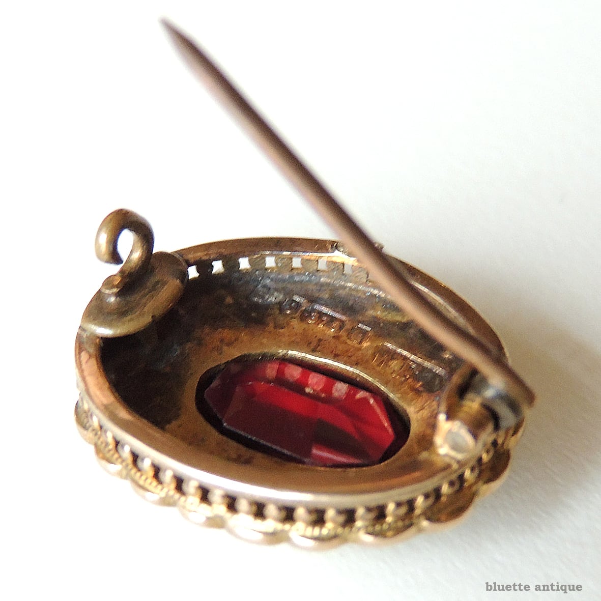 英国アンティークジュエリー 9ctゴールド 天然ロードライトガーネット 真珠 レースピン ブローチ(ソーティングメモ付)