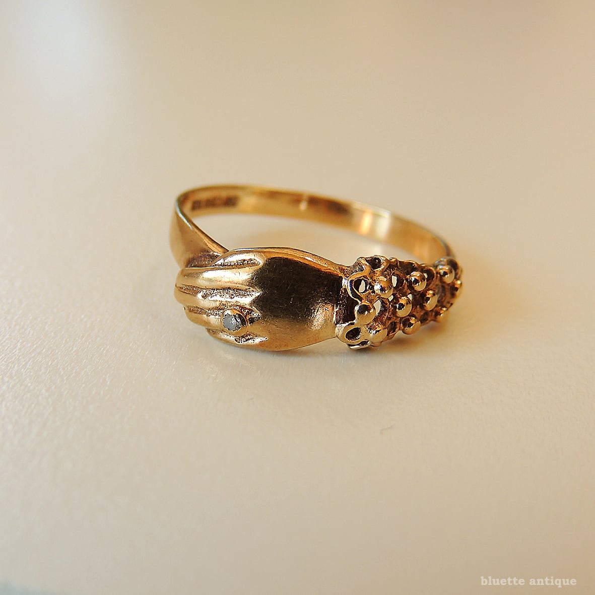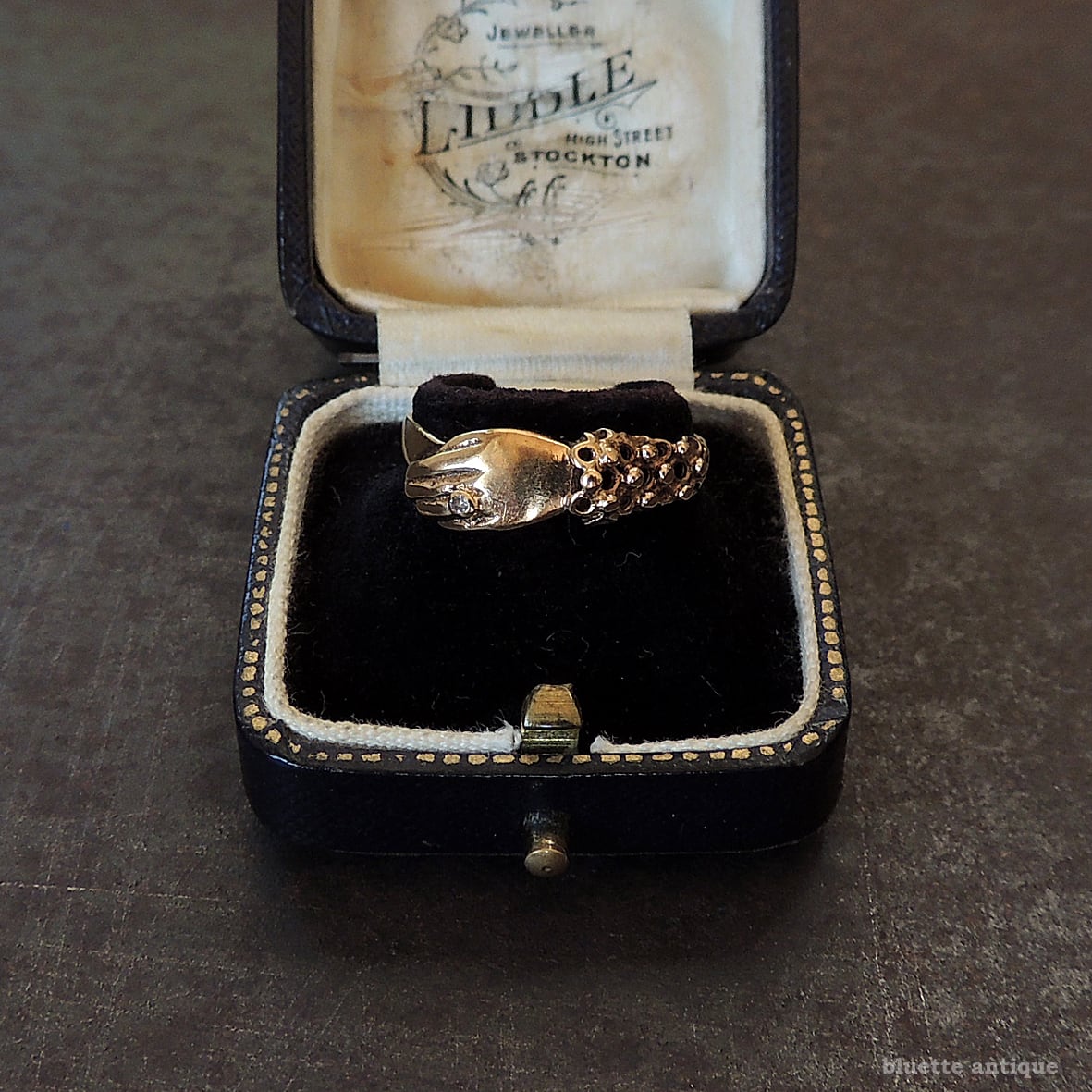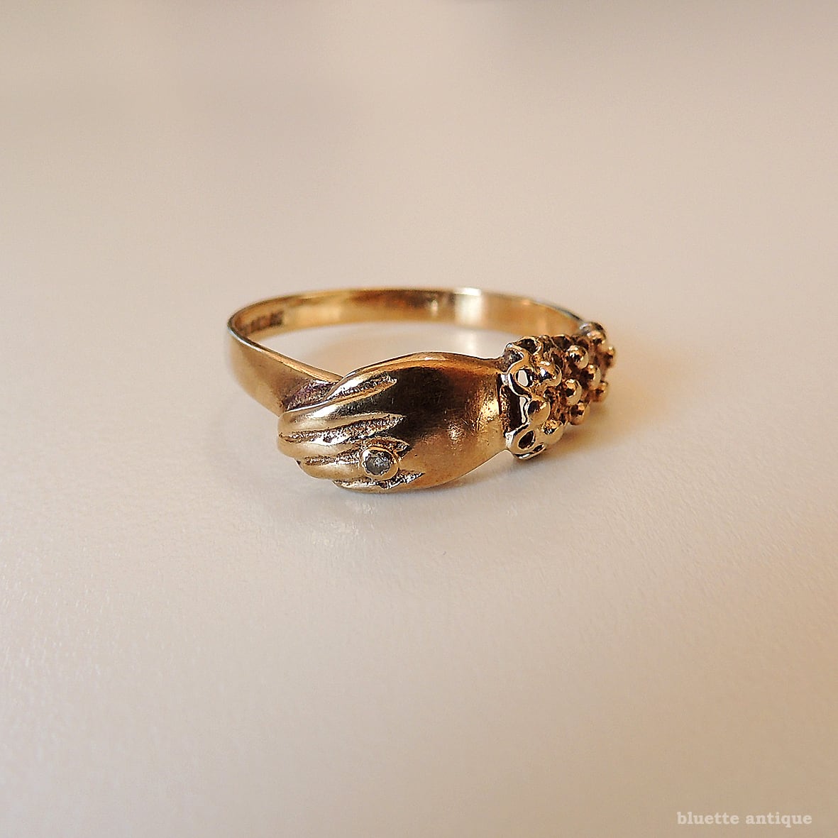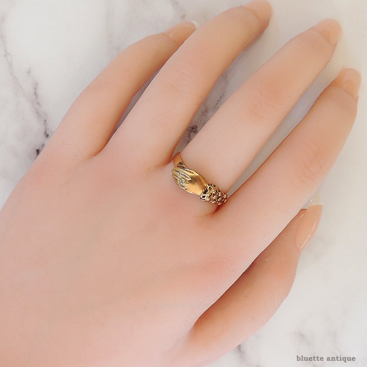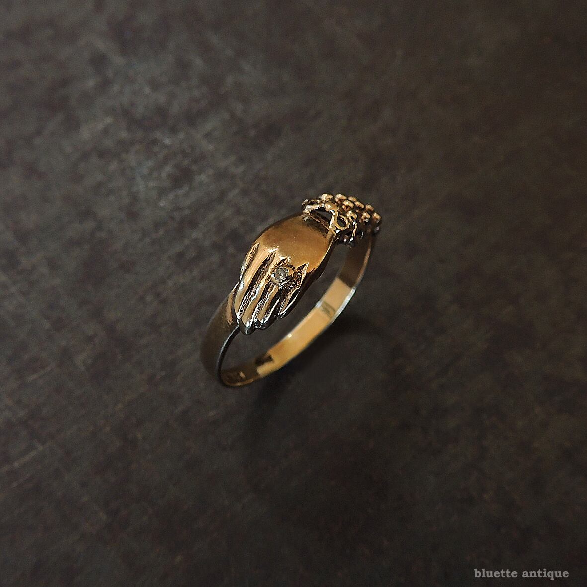 英国ヴィンテージジュエリー 9ctゴールド 天然ダイヤモンド ハンドモチーフリング【約16.5-17号】(ソーティングメモ付)