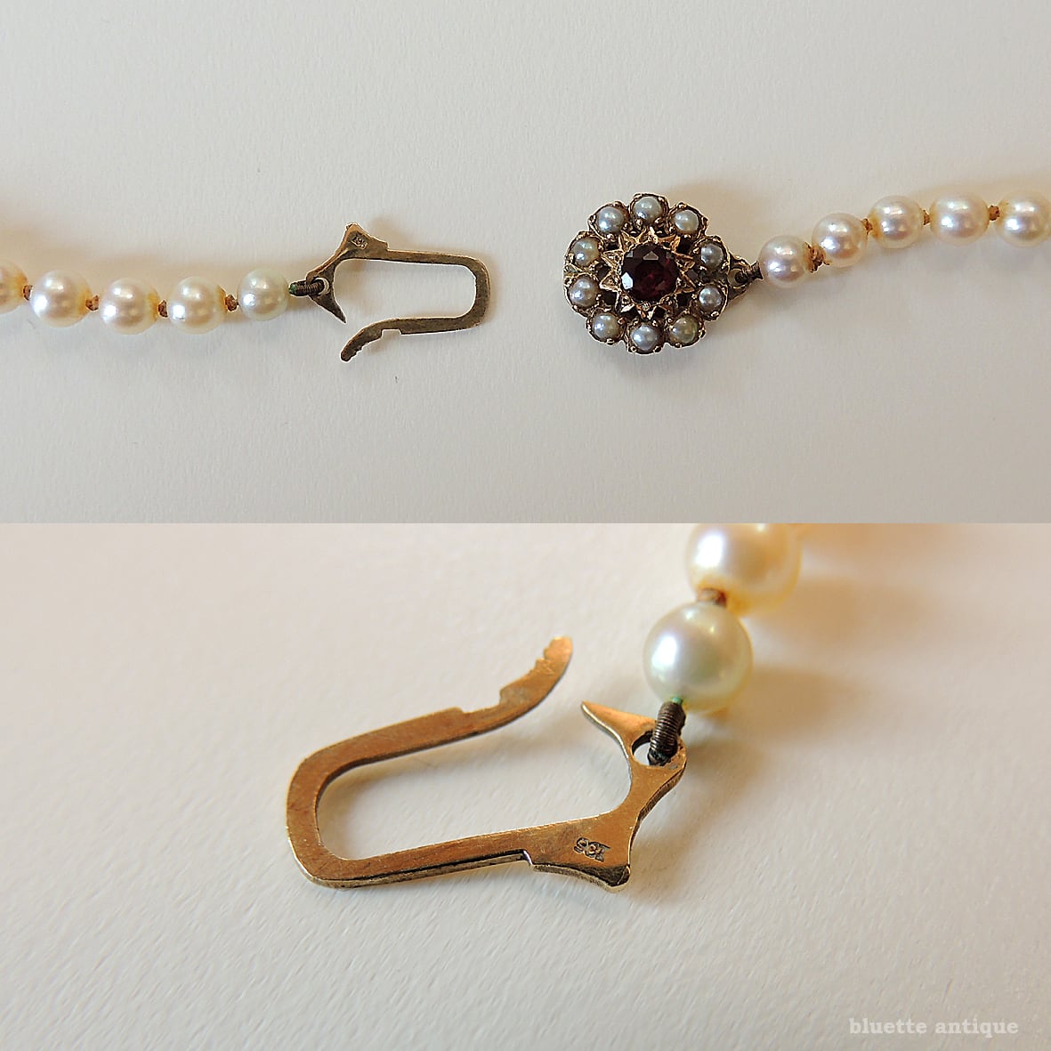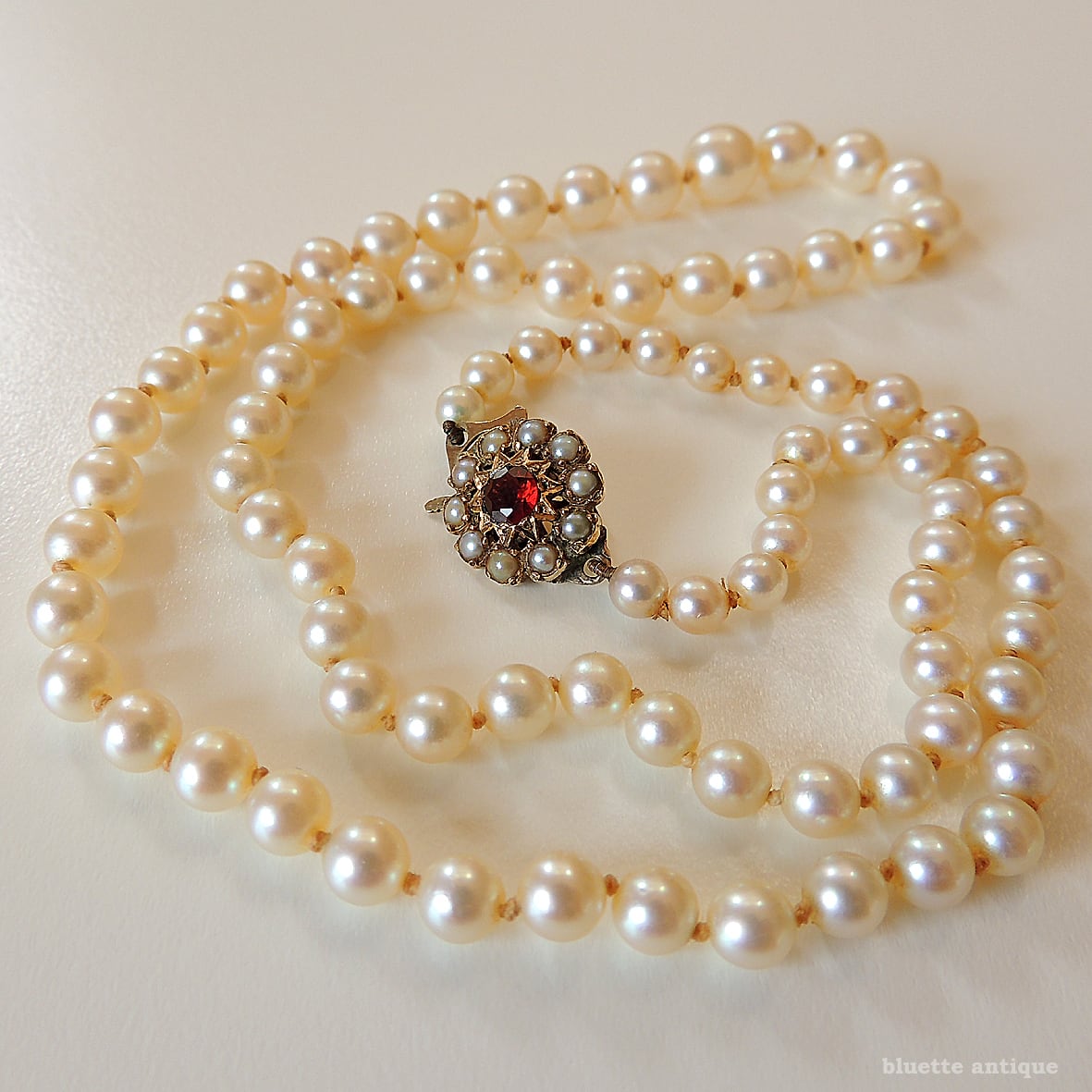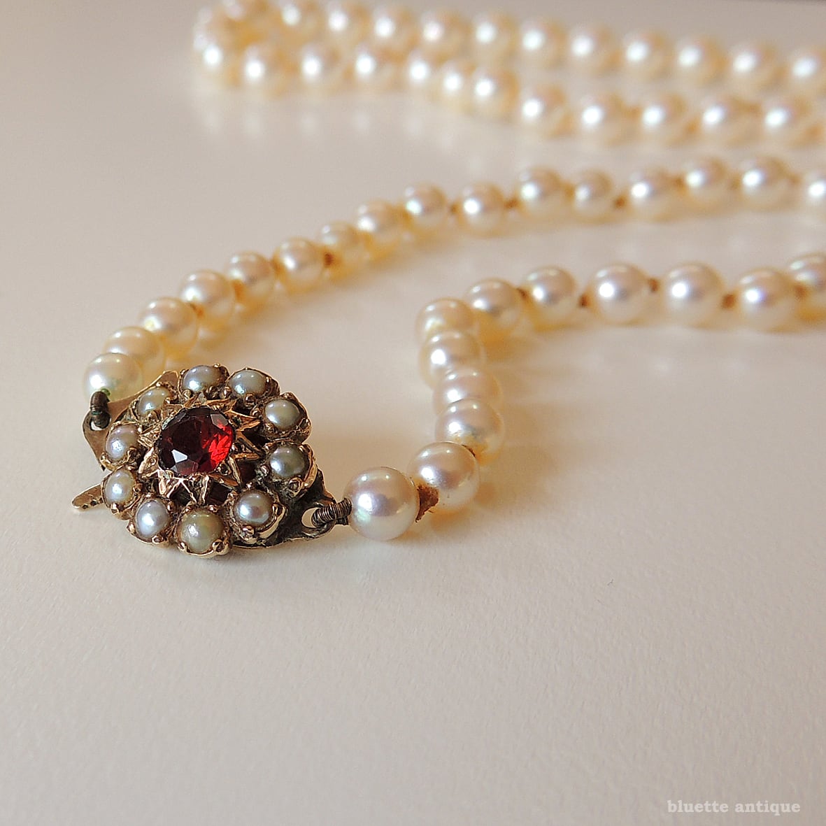 こちらは、アンティーク、9金ロードライトガーネットクラスプ、アコヤ真珠ネックレスです。