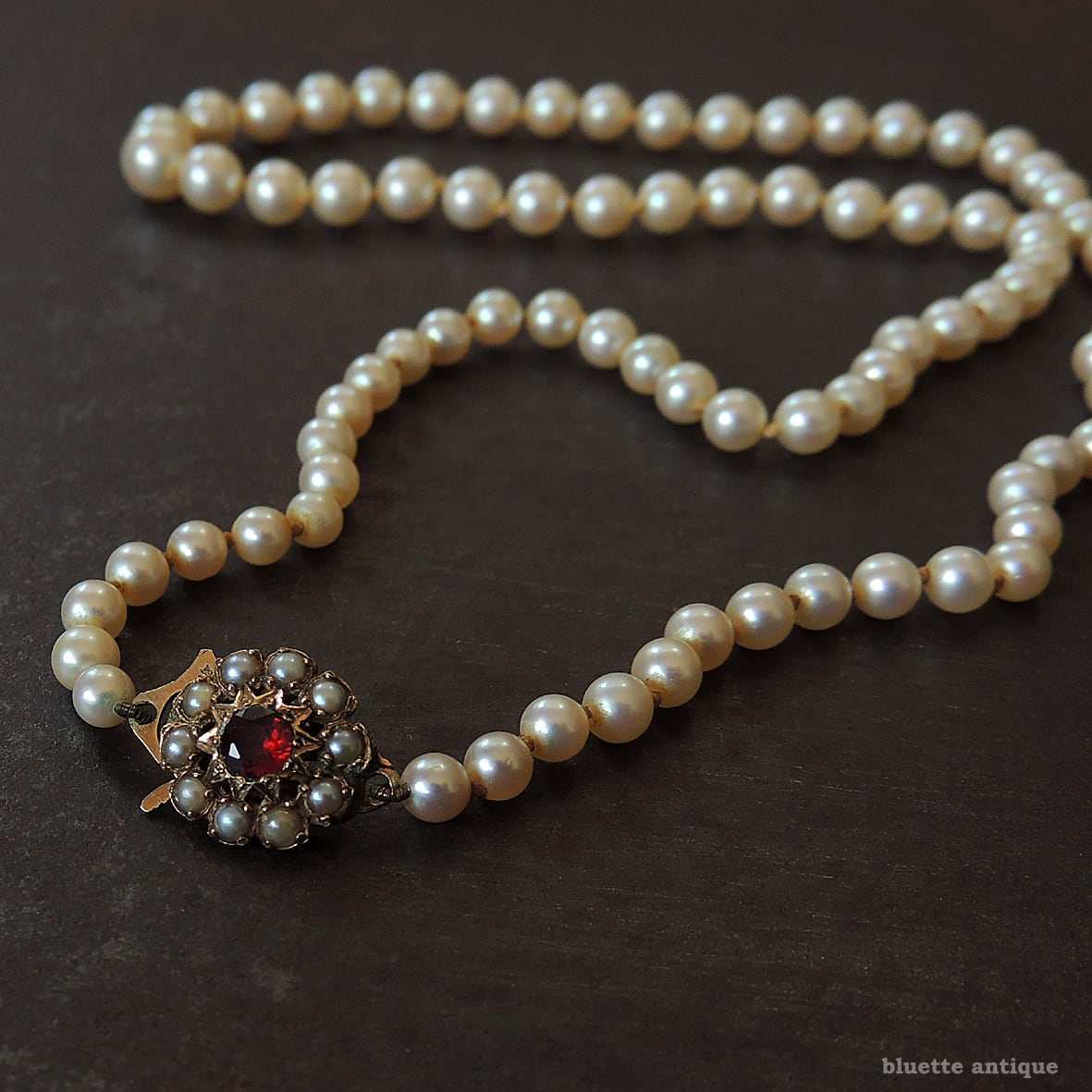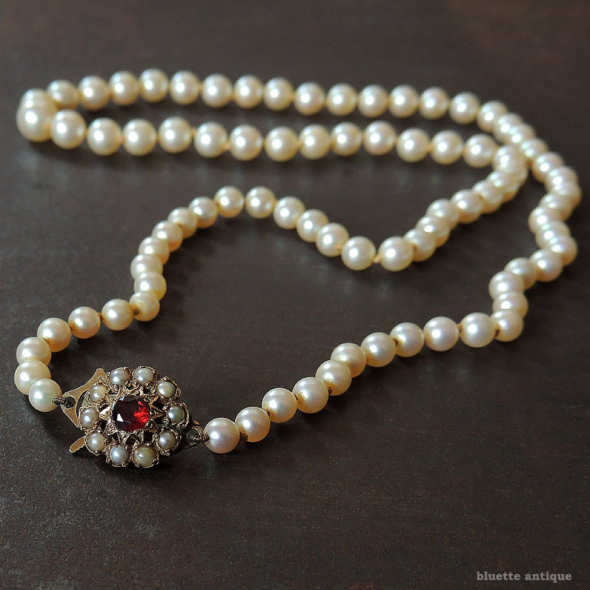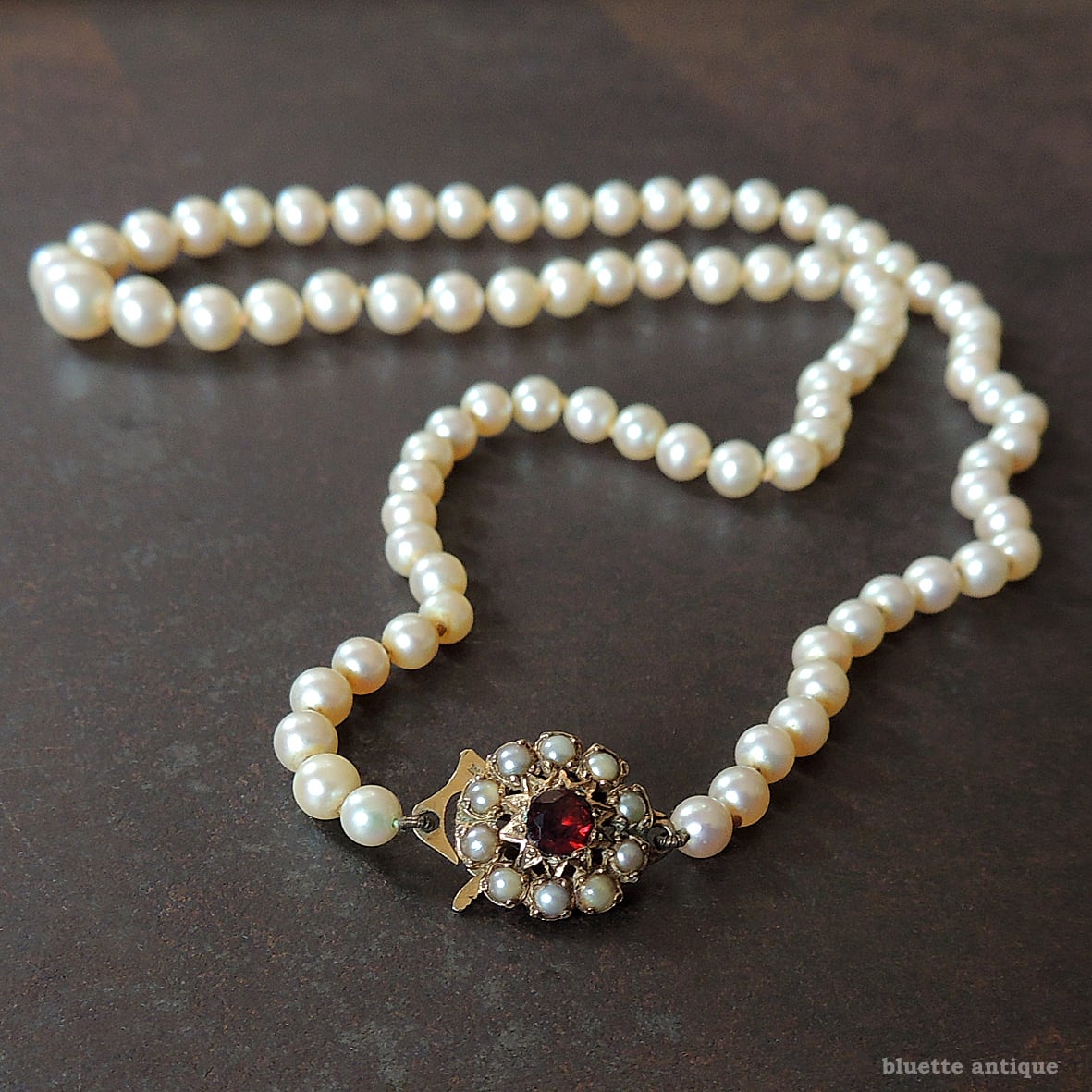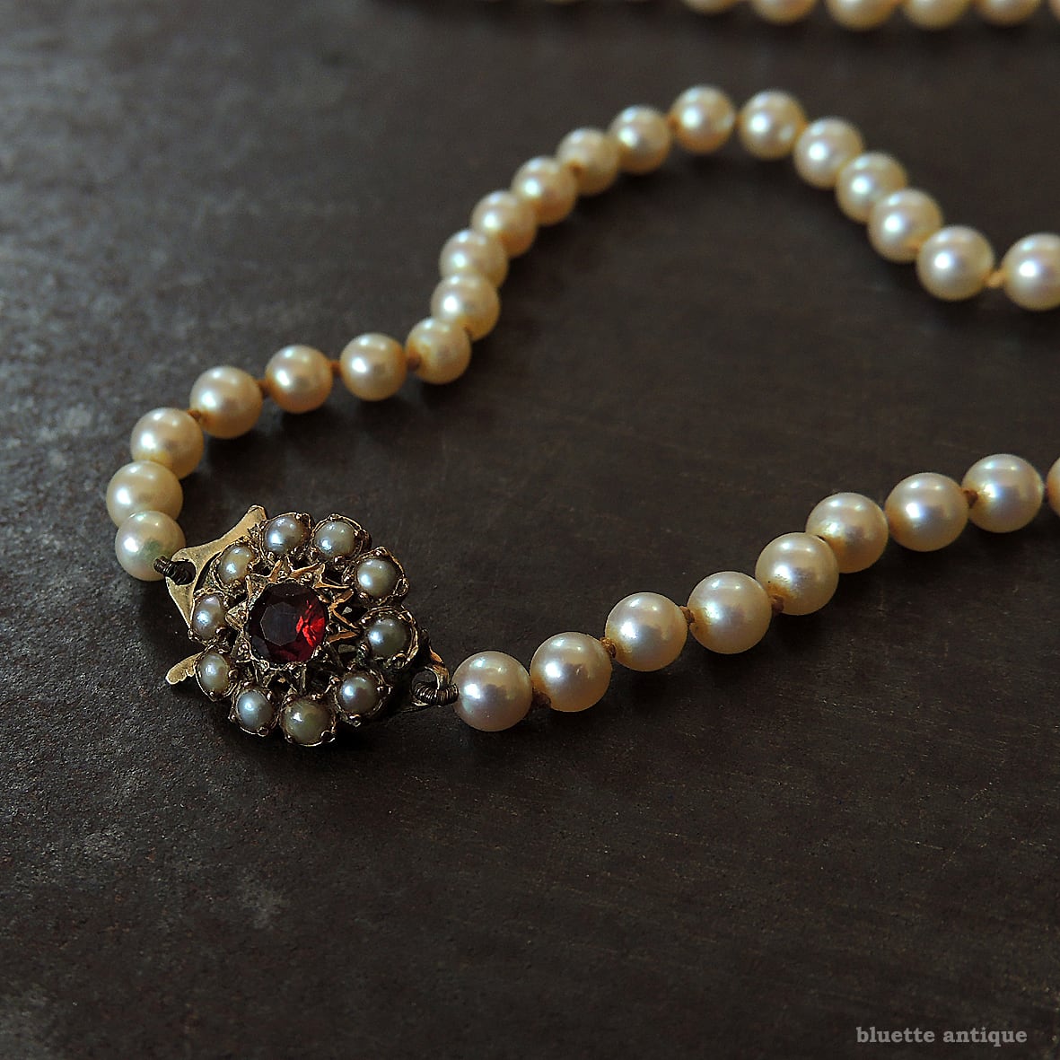 クラスプは9金、深みの有る赤いロードライトガーネットの周りには、シードパールが取り巻くフラワーデザイン。当時の手仕事ならではの美しさを感じます。