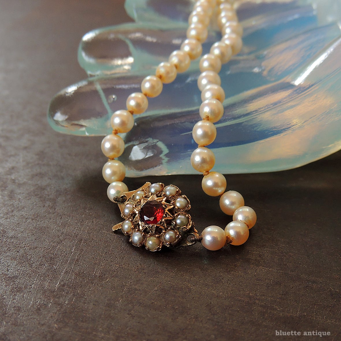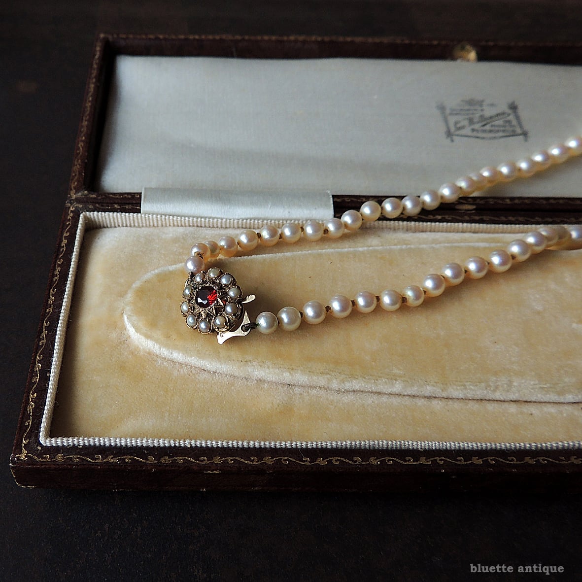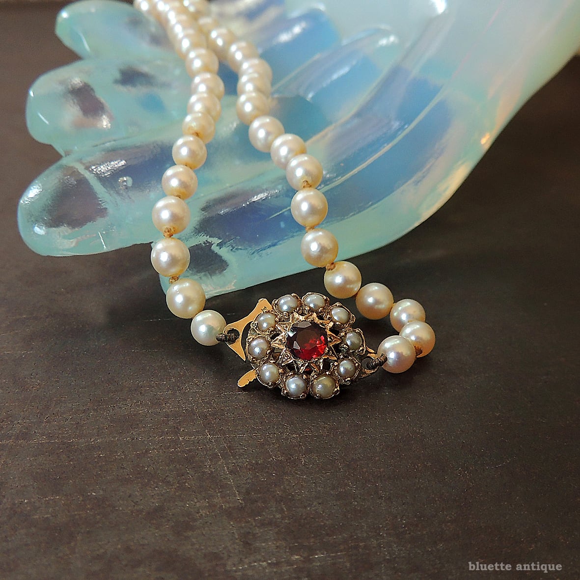 クラスプは9金、深みの有る赤いロードライトガーネットの周りには、シードパールが取り巻くフラワーデザイン。当時の手仕事ならではの美しさを感じます。