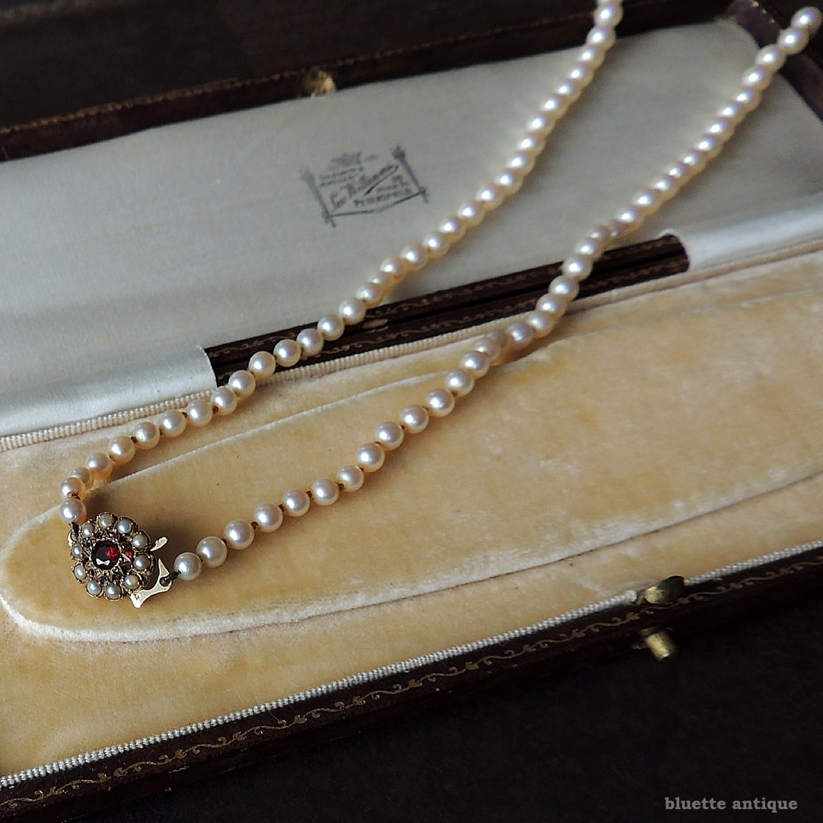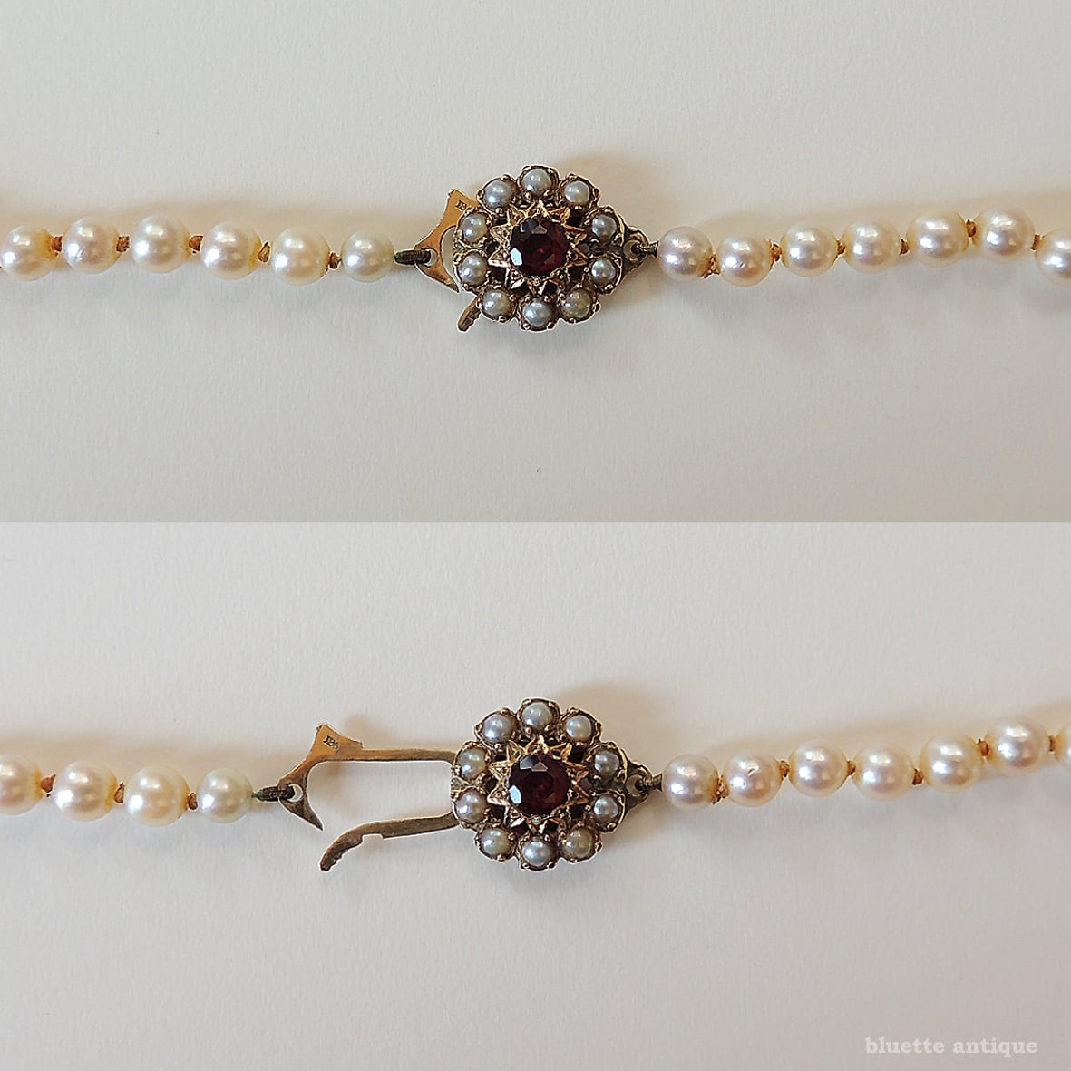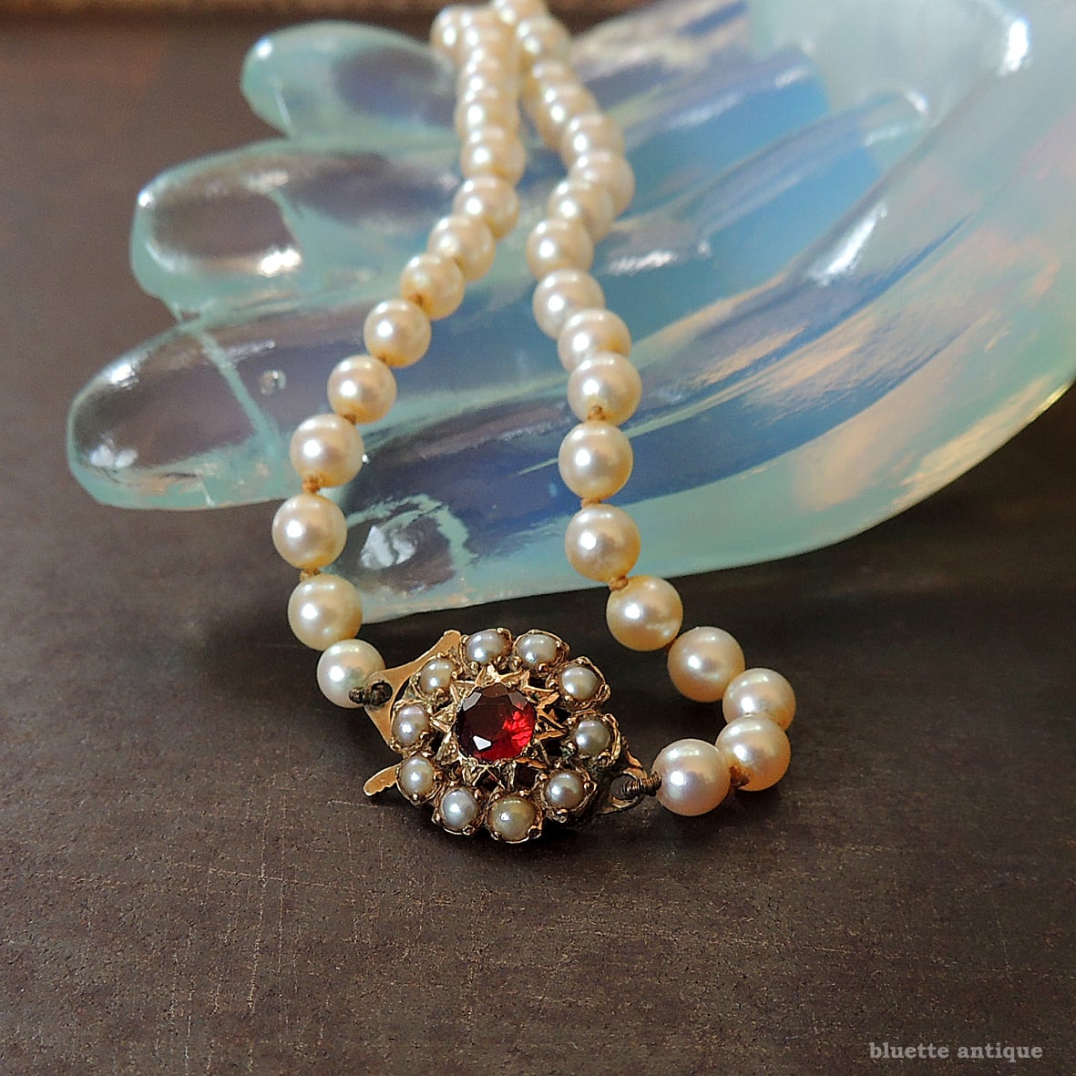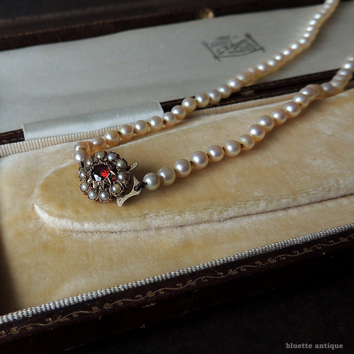 クラスプは9金、深みの有る赤いロードライトガーネットの周りには、シードパールが取り巻くフラワーデザイン。当時の手仕事ならではの美しさを感じます。