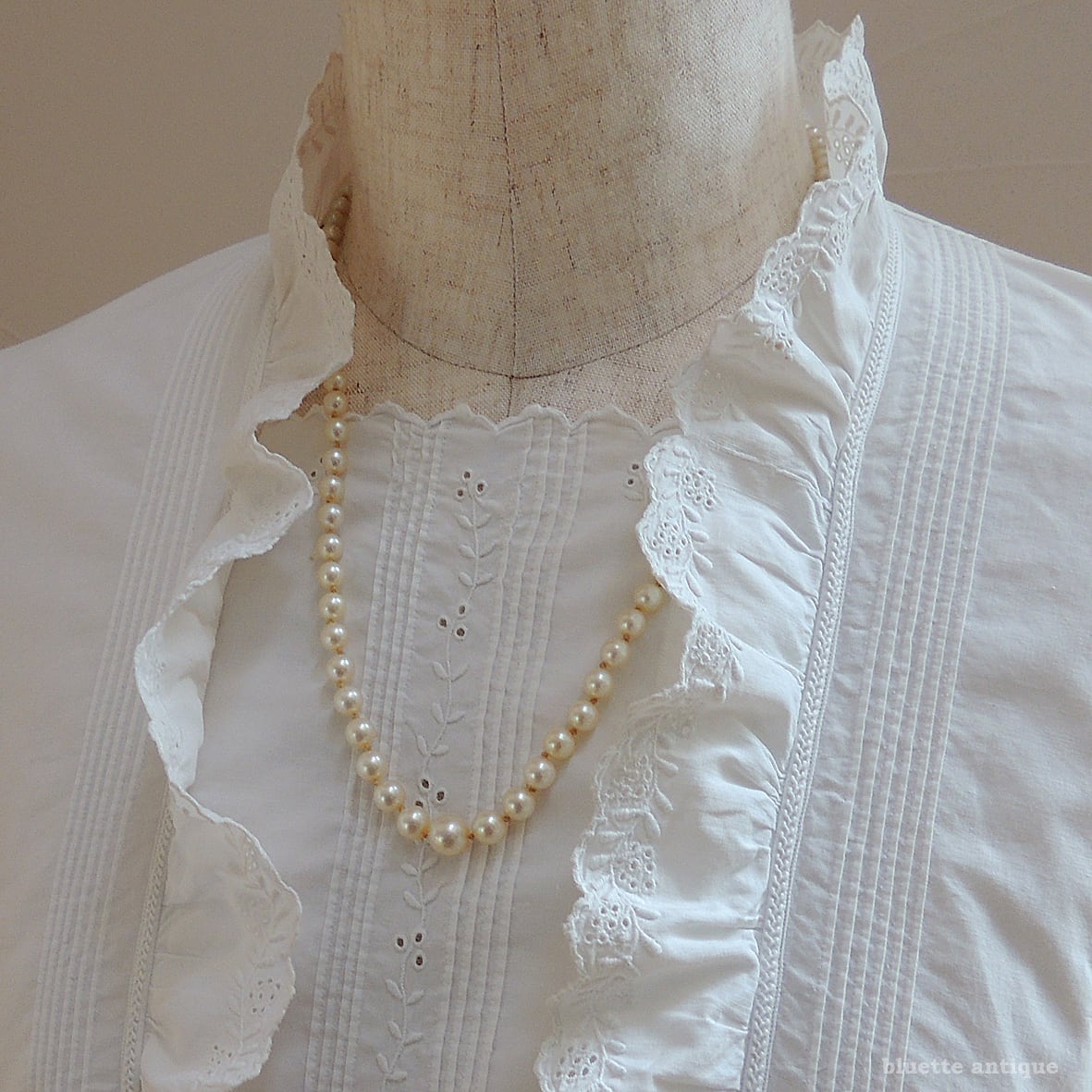凝ったクラスプで、後ろ姿も美しいネックレス。時代を経て受け継がれてきた真珠の柔らかな光と、クラシカルな意匠をお楽しみいただける一点です。