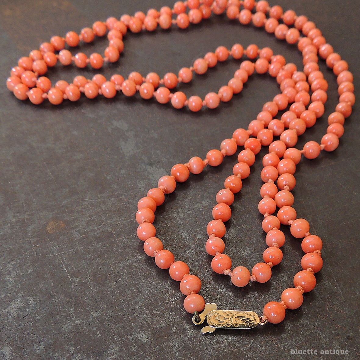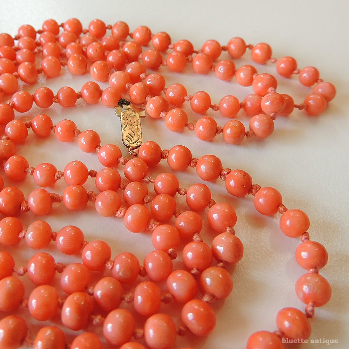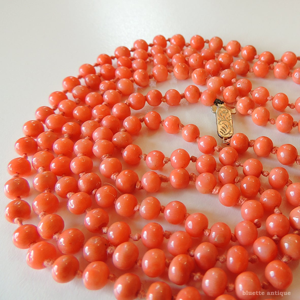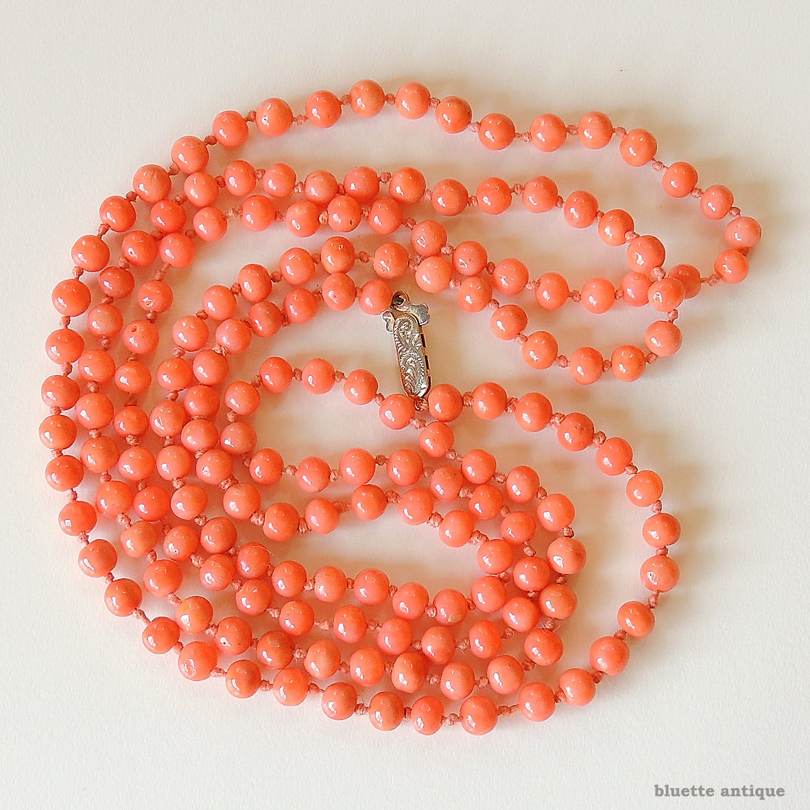 こちらは、アンティーク、鮮やかな朱色が魅力の、コーラル、オールノットのロングネックレスです。素朴な飾り彫りが施されたクラスプは9金、ホールマークが残っています。1897年、バーミンガム。