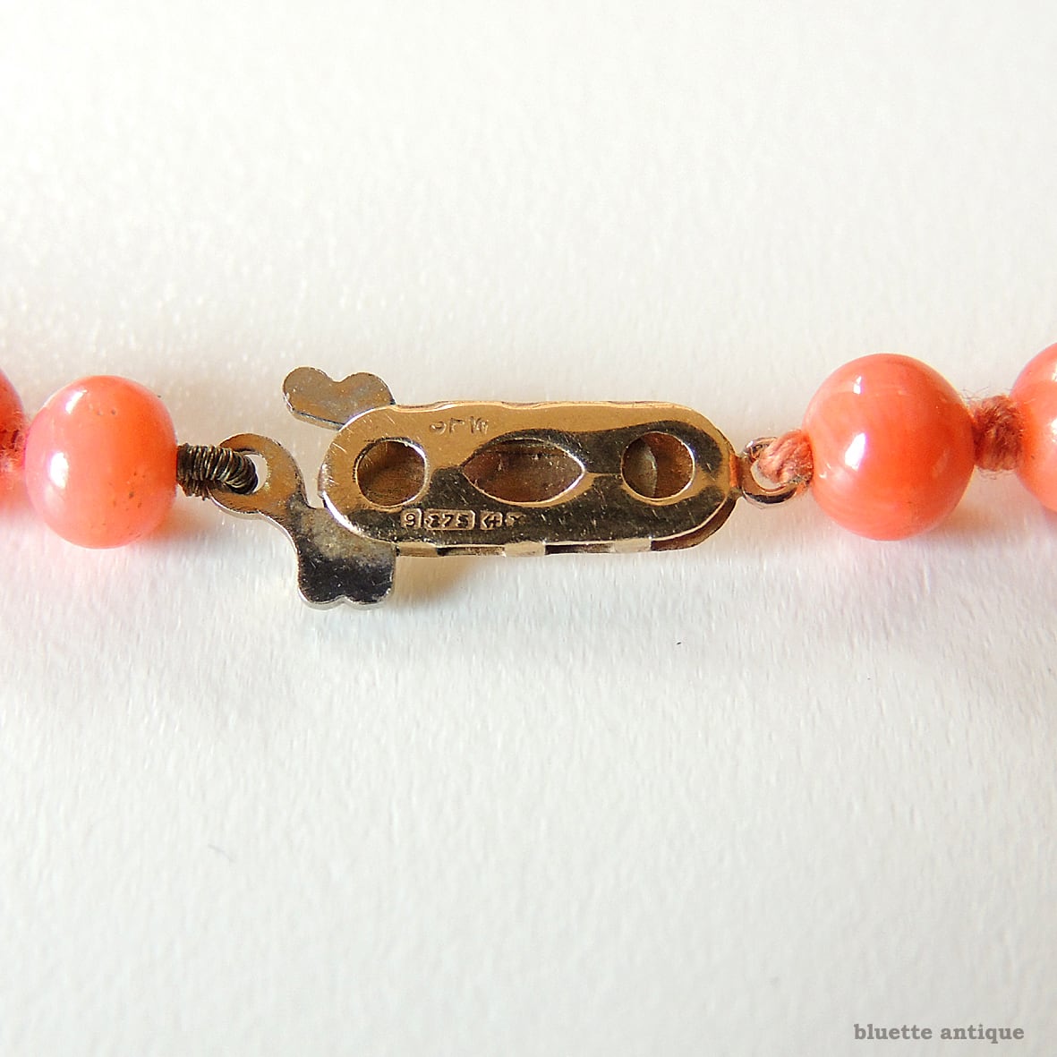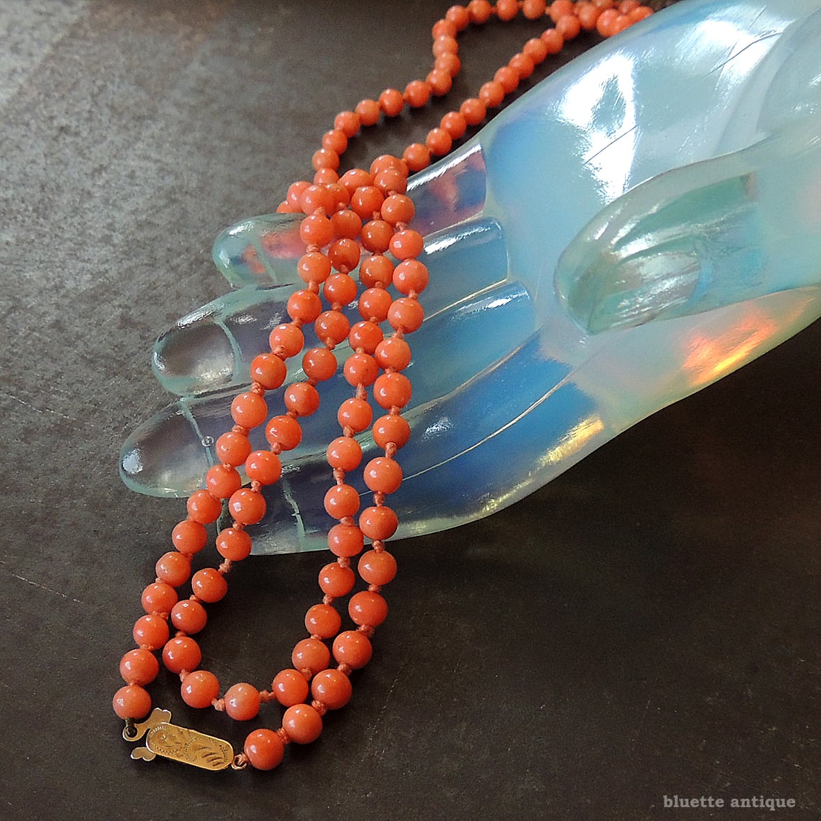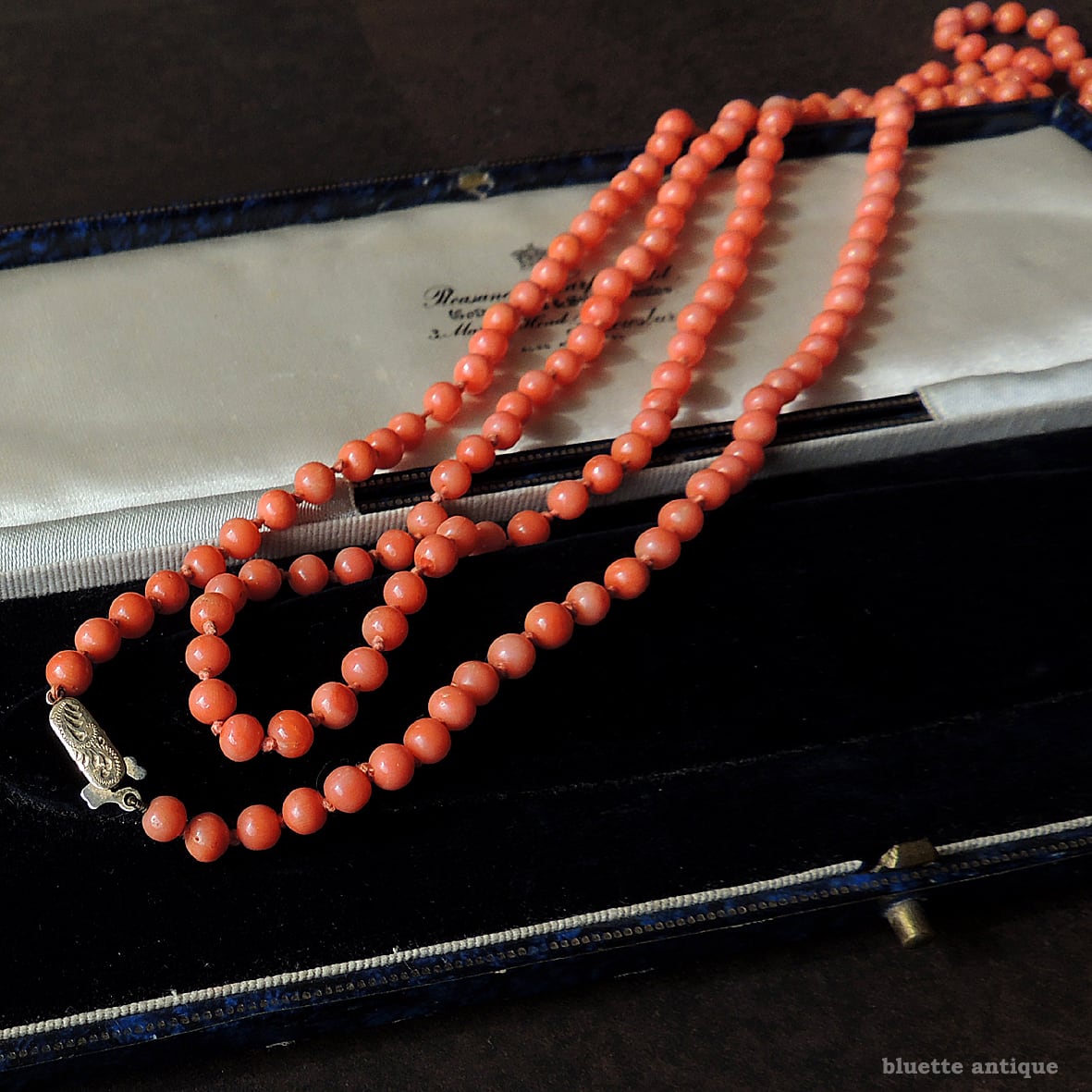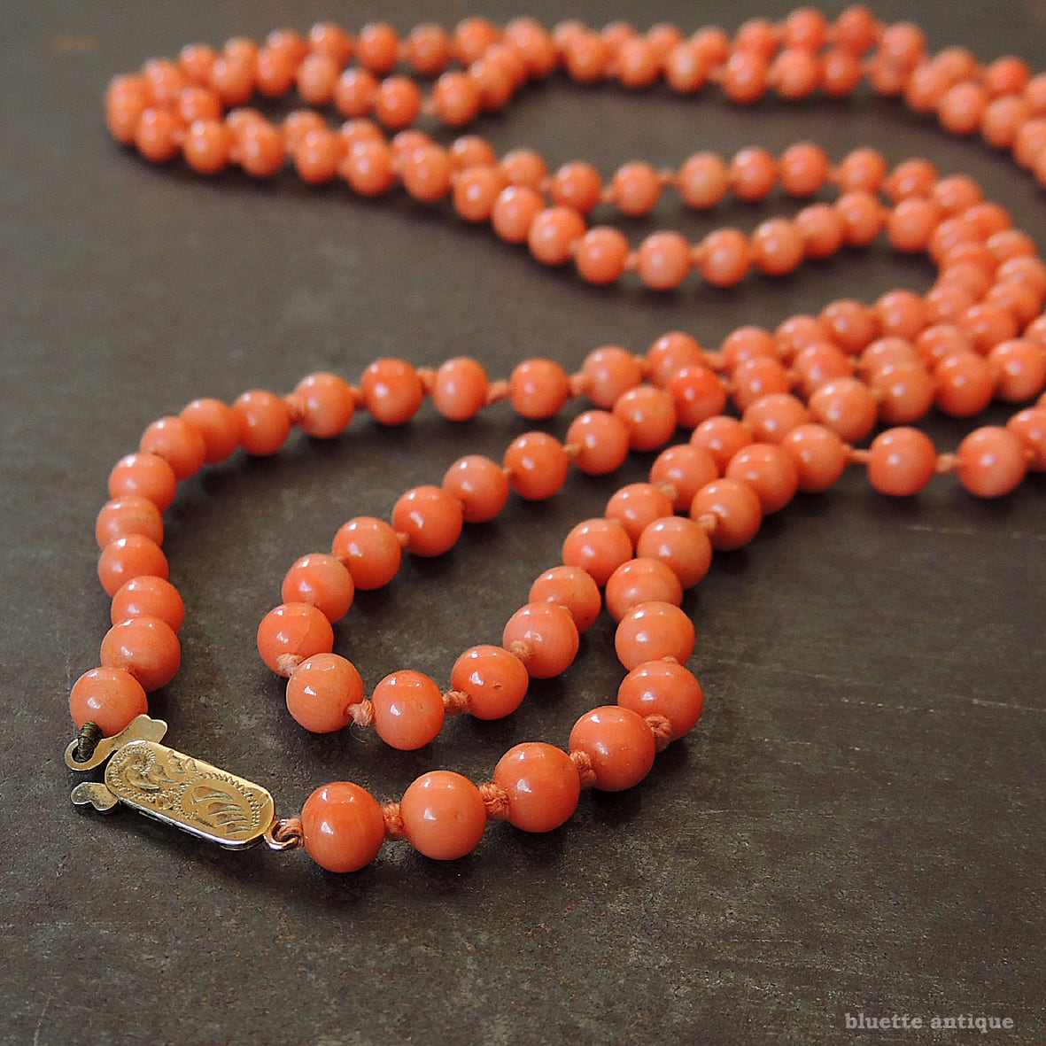 こちらは、アンティーク、鮮やかな朱色が魅力の、コーラル、オールノットのロングネックレスです。素朴な飾り彫りが施されたクラスプは9金、ホールマークが残っています。1897年、バーミンガム。