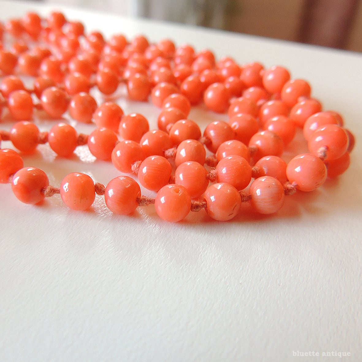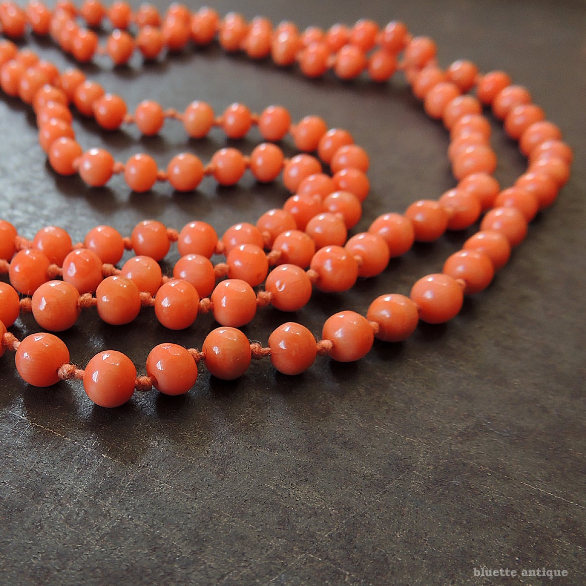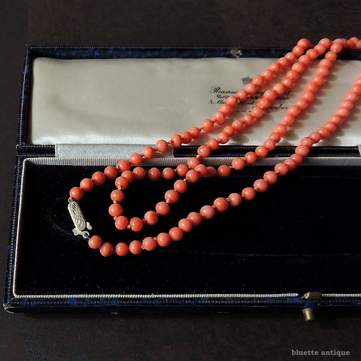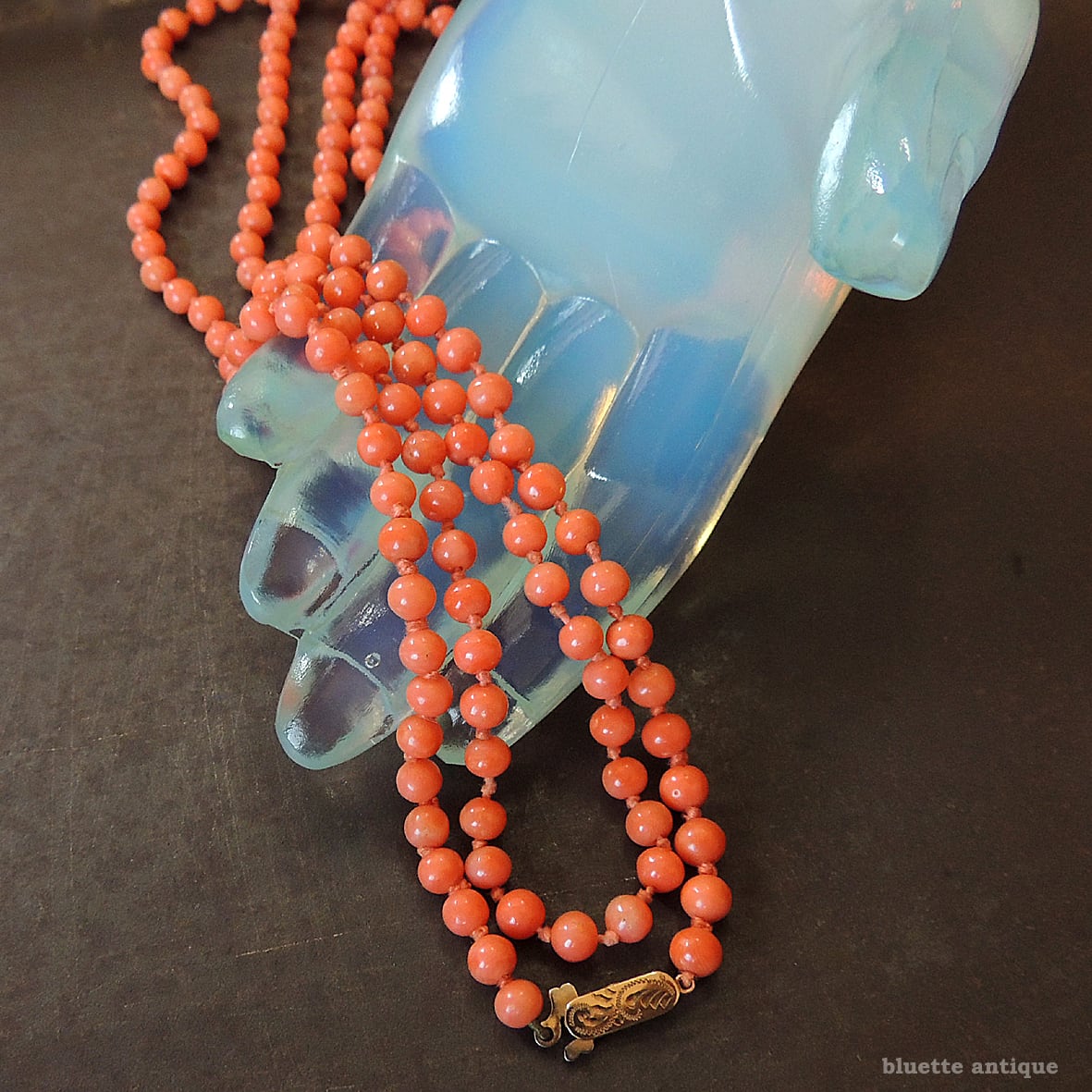 こちらは、アンティーク、鮮やかな朱色が魅力の、コーラル、オールノットのロングネックレスです。素朴な飾り彫りが施されたクラスプは9金、ホールマークが残っています。1897年、バーミンガム。
