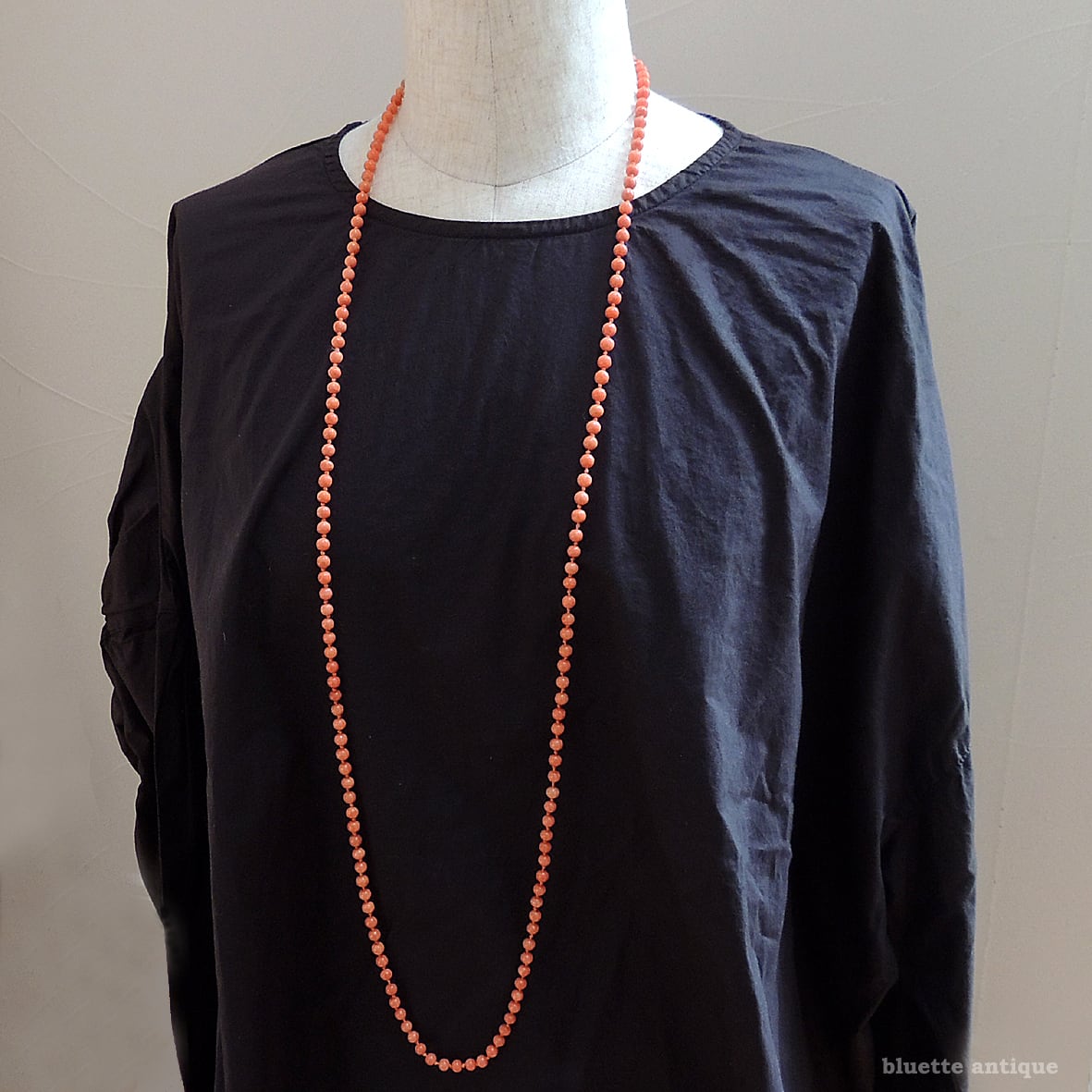 全長約110cmのロングレングスは、二連にしても美しく、装いに合わせて表情を変えて楽しめるのも魅力のひとつ。シンプルな装いに合わせるだけで、アンティークならではの奥行きと品格を添えてくれます。