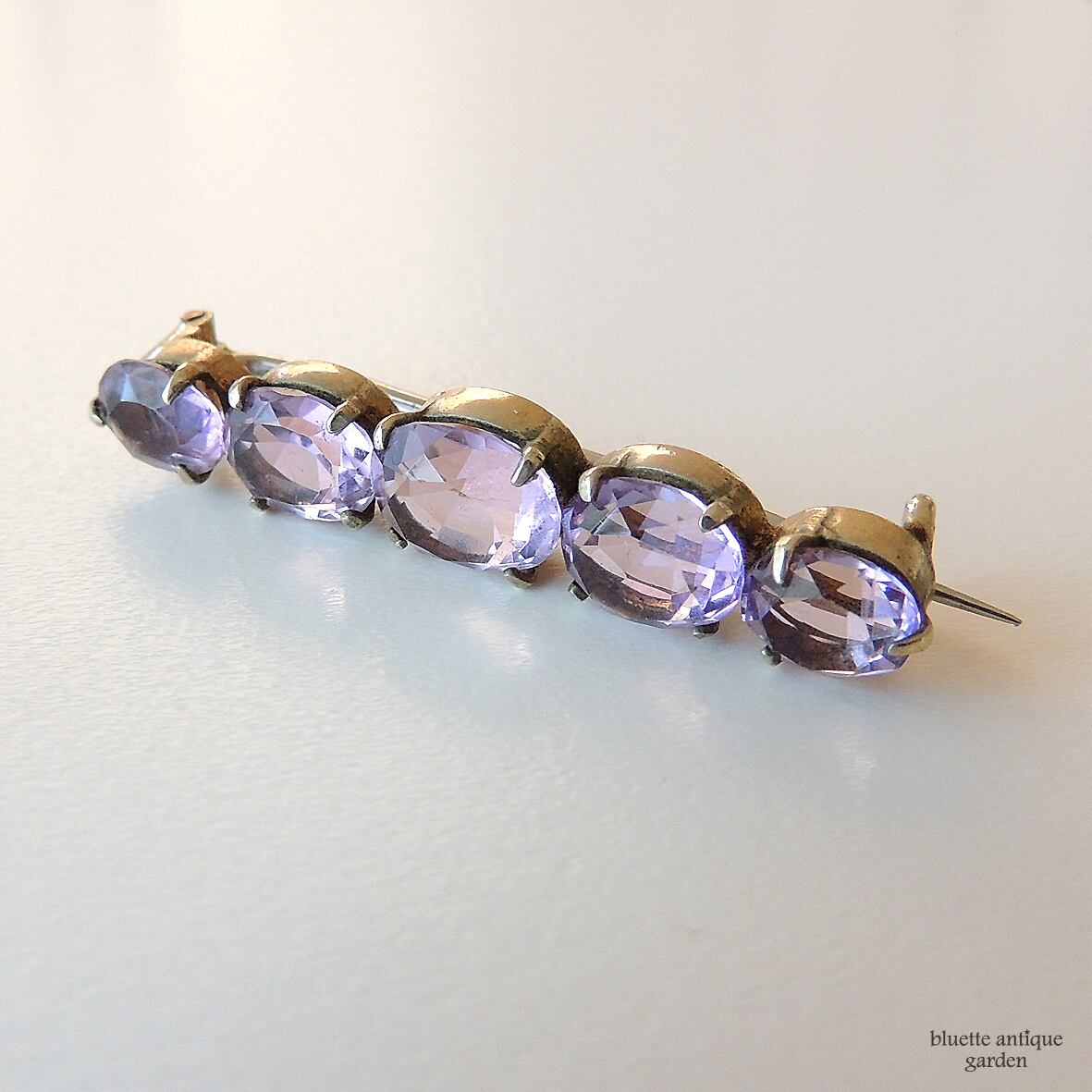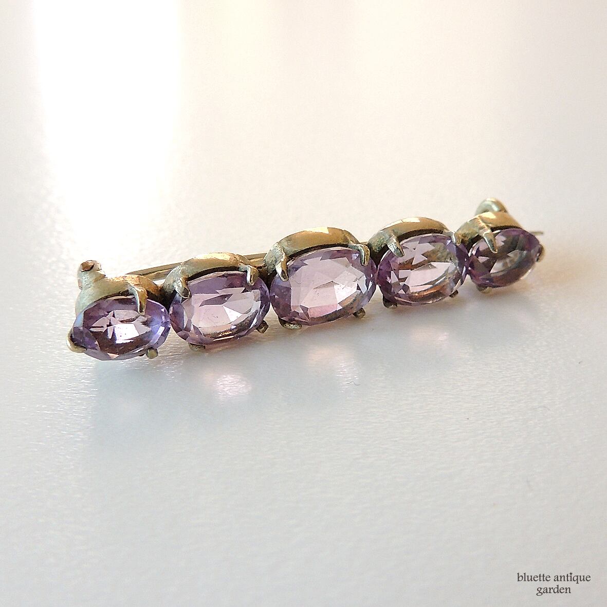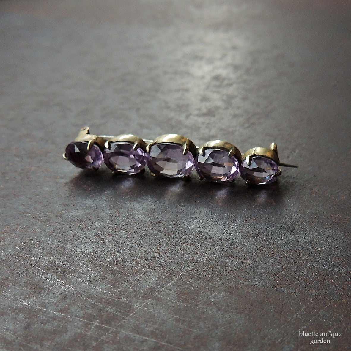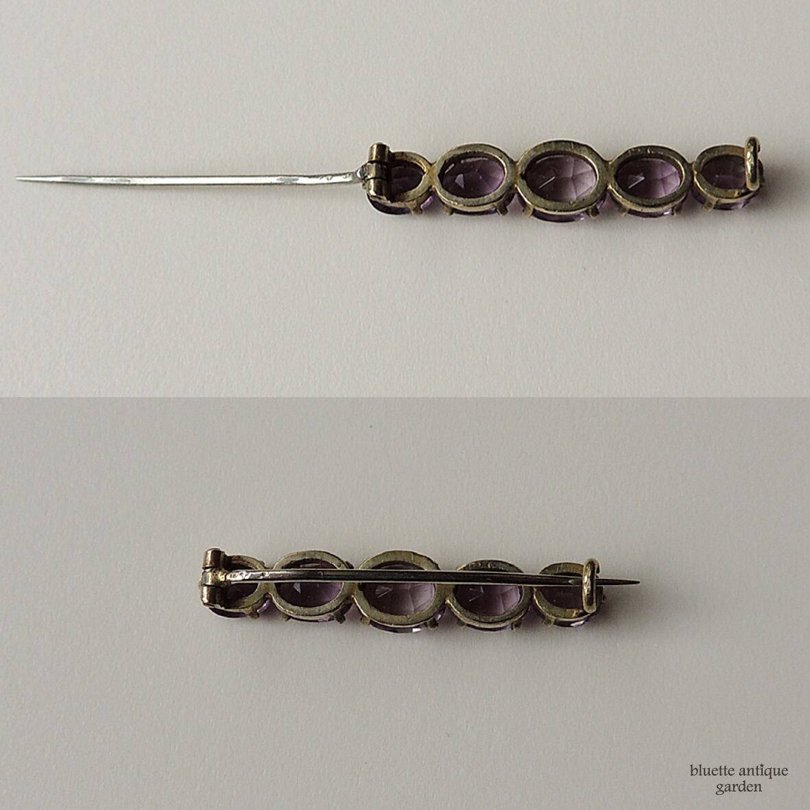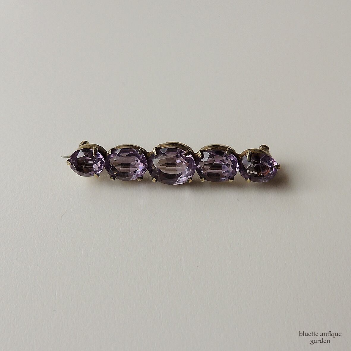 イギリスより、アンティーク、天然アメシストの5連バーブローチです。こちらはオーバルのアメシストが5石、やや大小のグラデーションをつけて並んでいます。