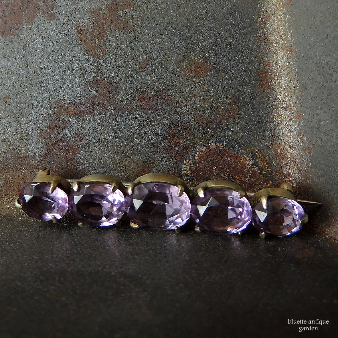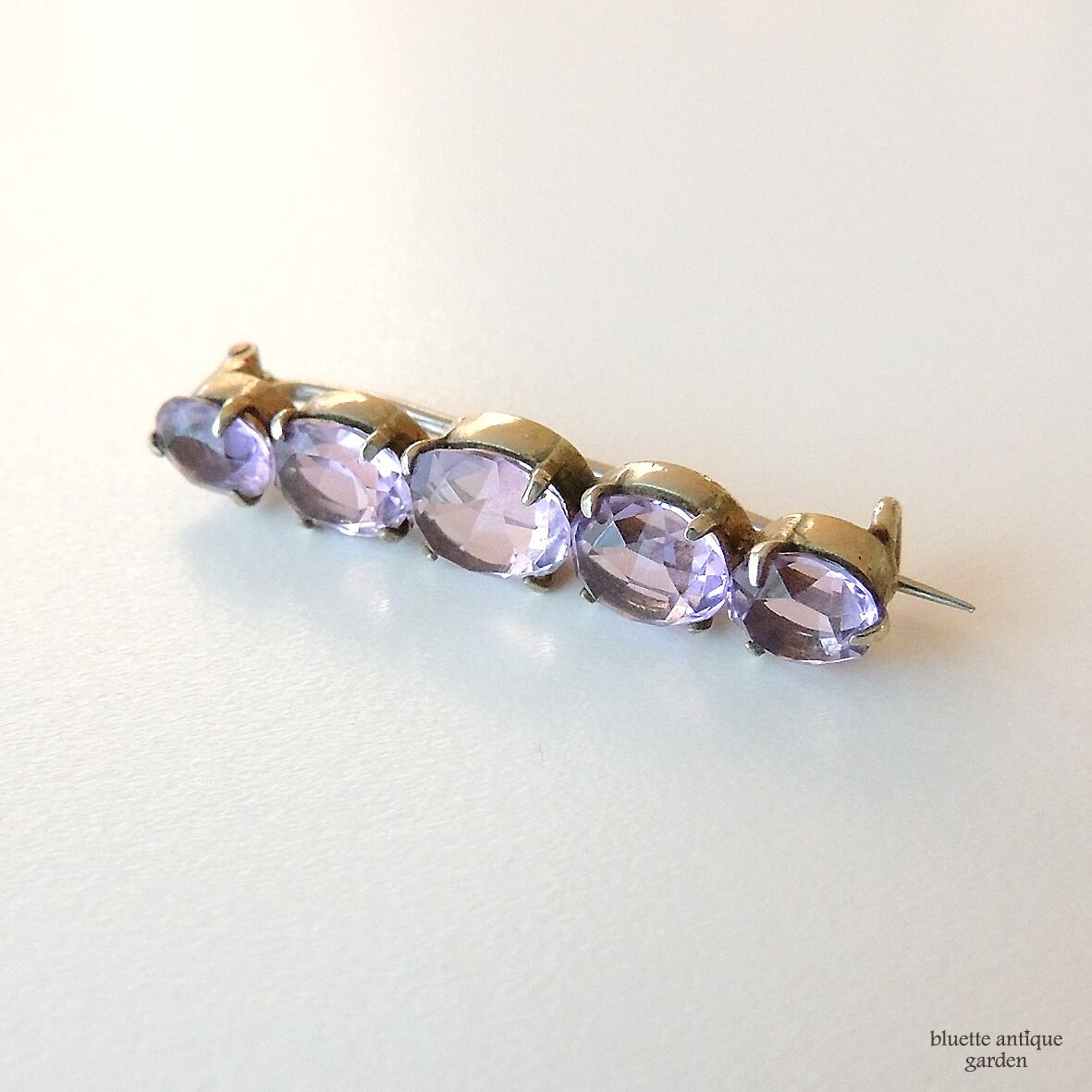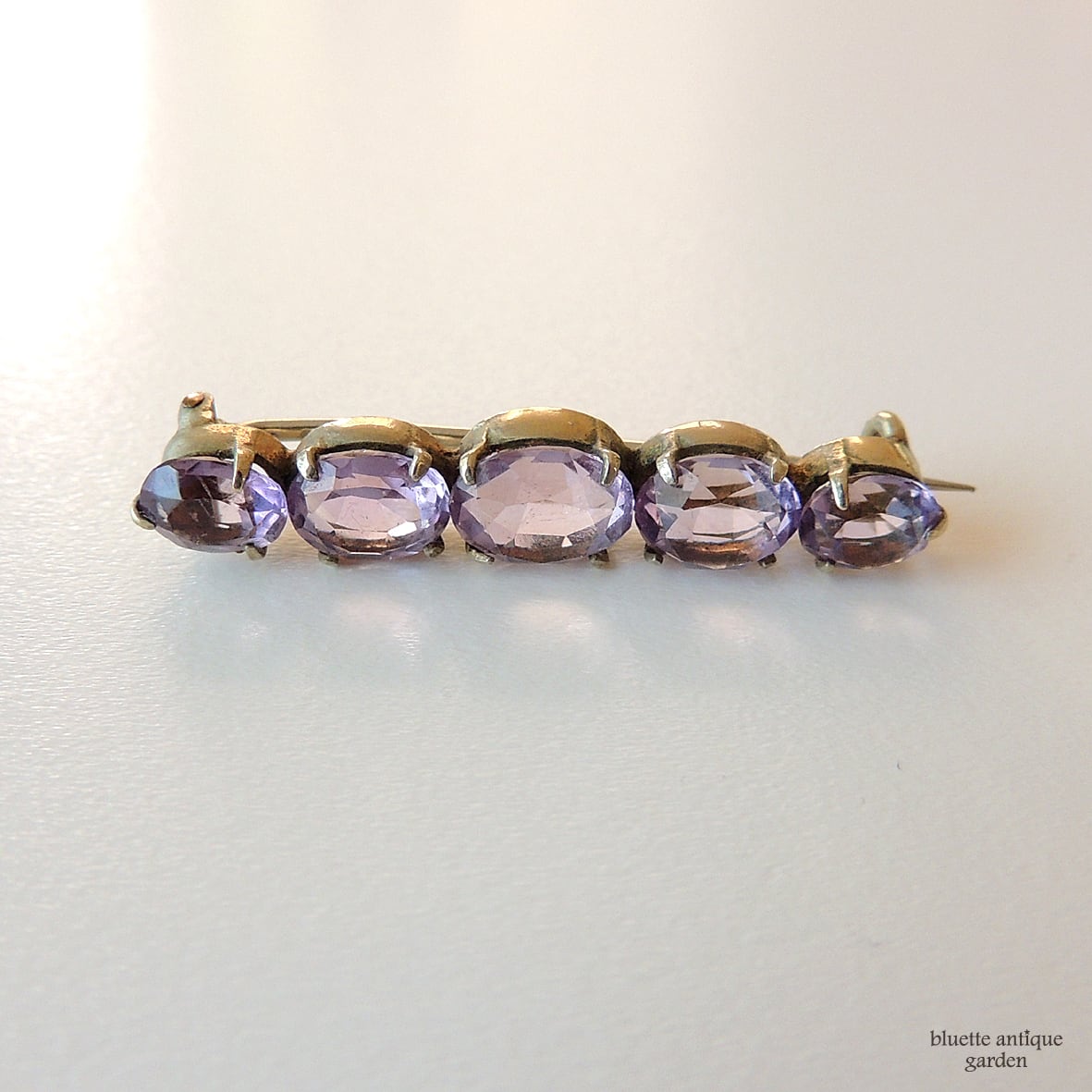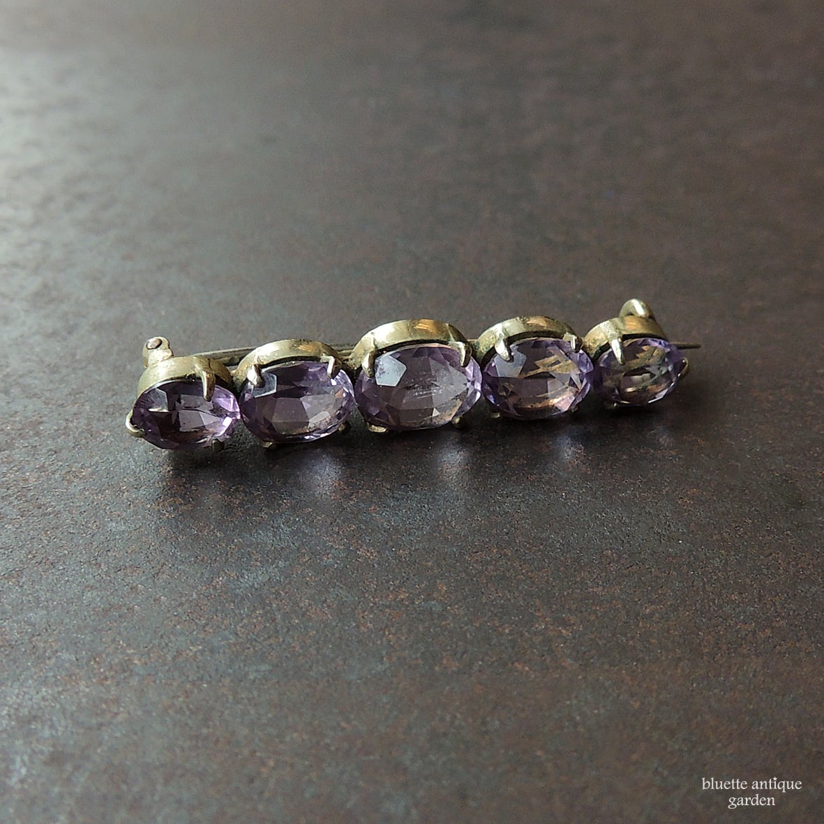イギリスより、アンティーク、天然アメシストの5連バーブローチです。こちらはオーバルのアメシストが5石、やや大小のグラデーションをつけて並んでいます。