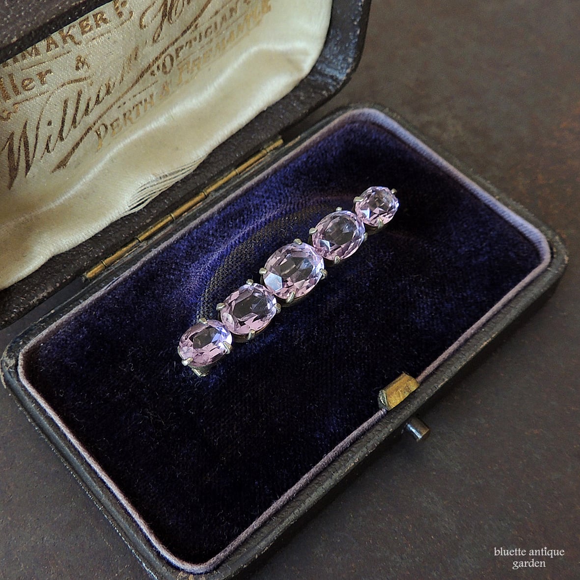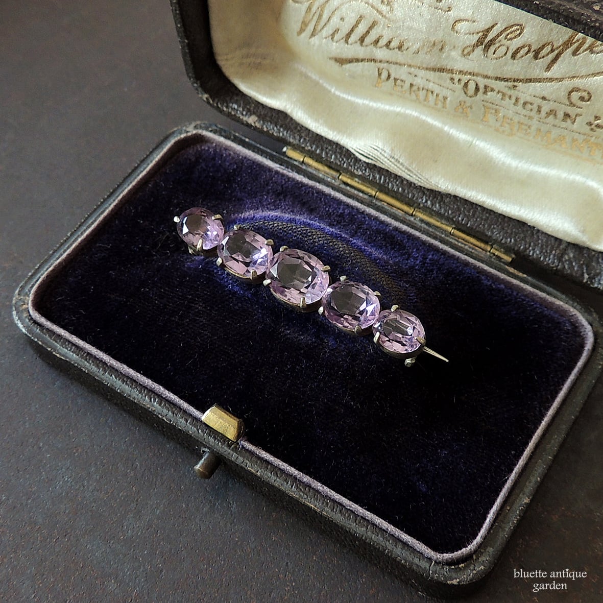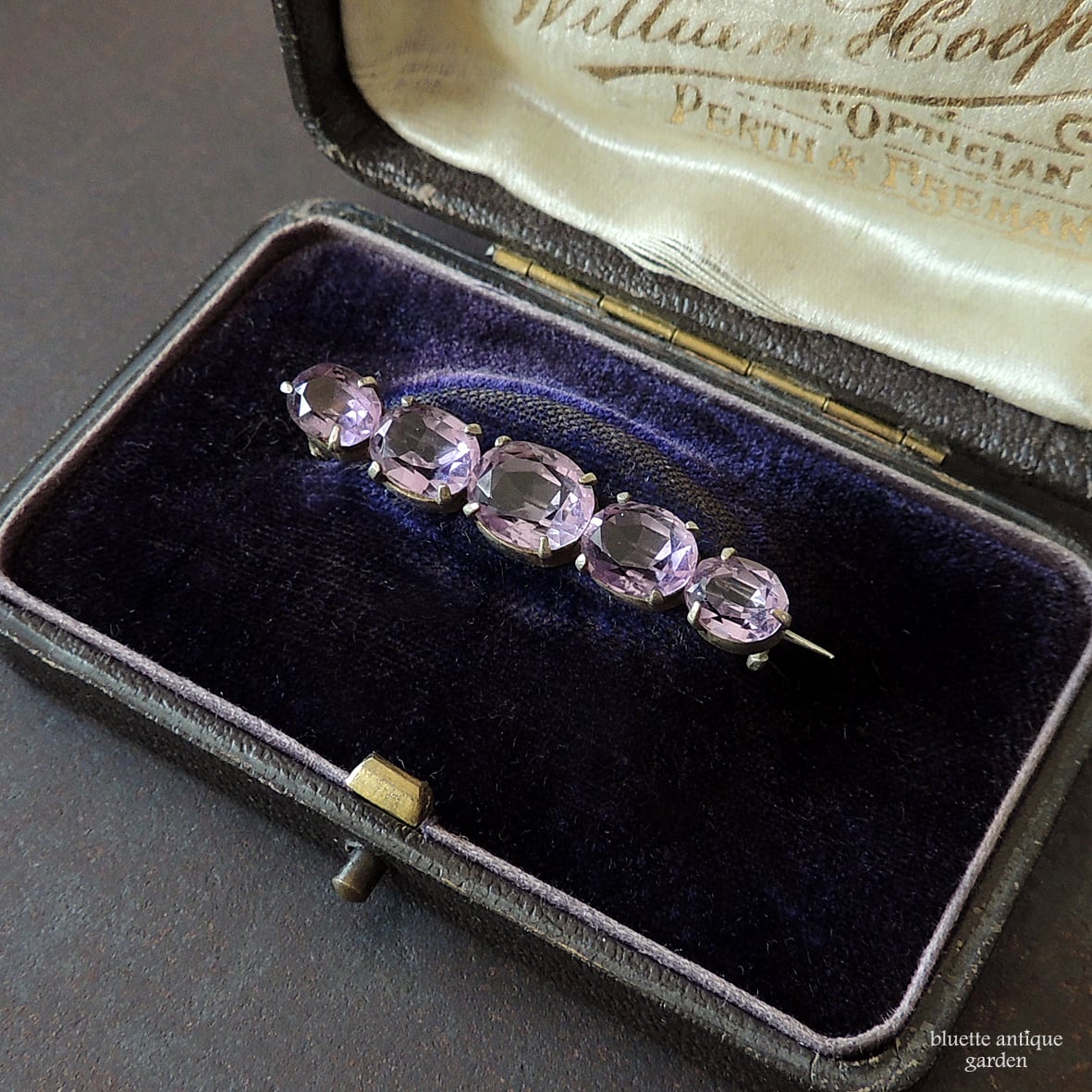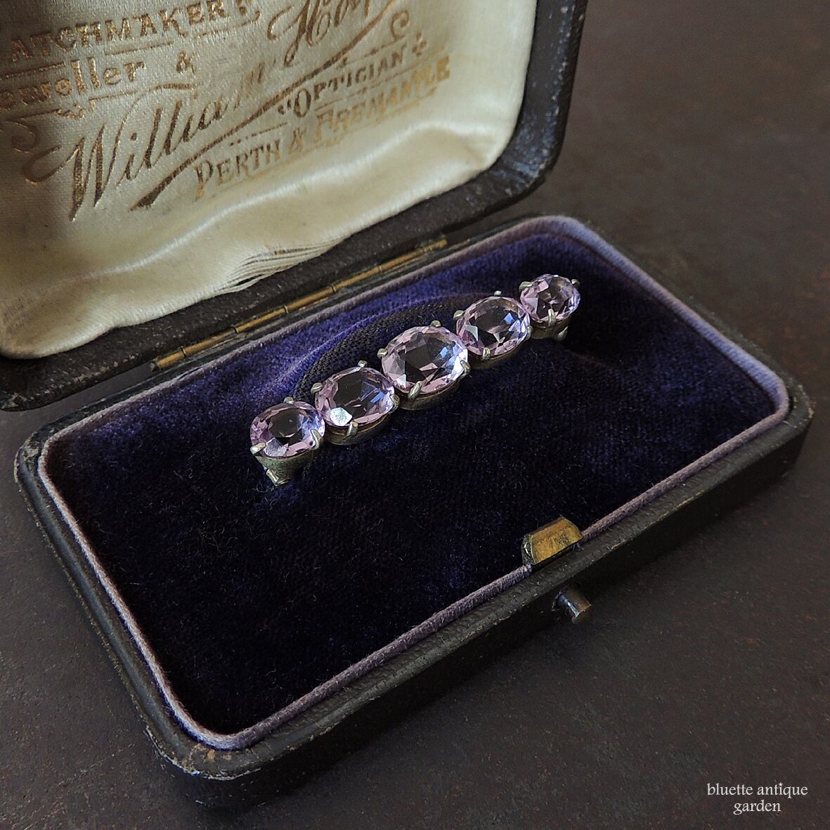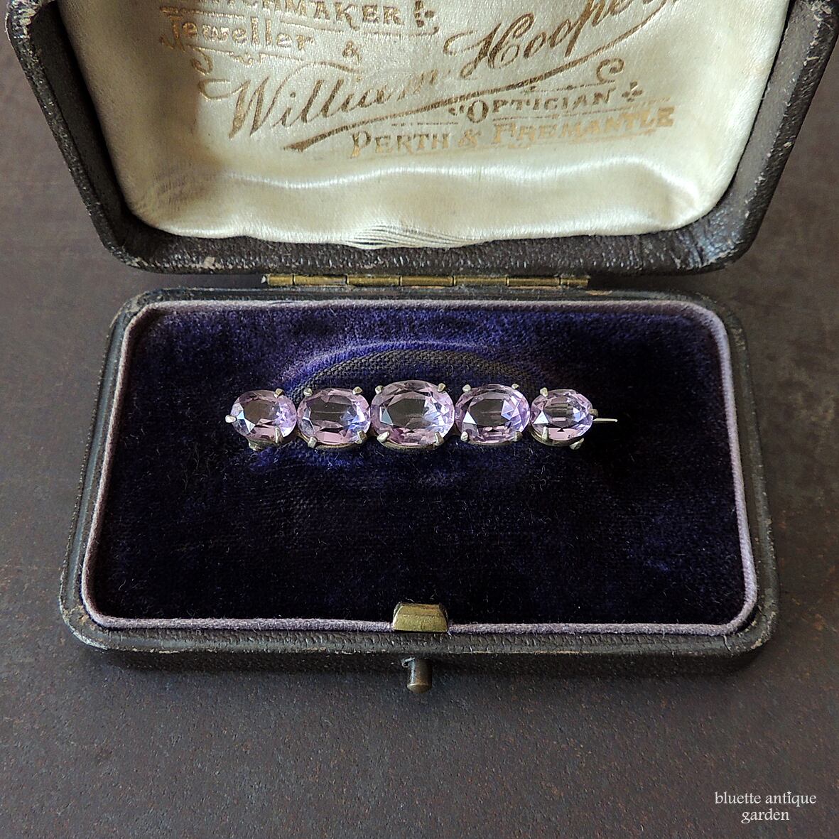 イギリスより、アンティーク、天然アメシストの5連バーブローチです。こちらはオーバルのアメシストが5石、やや大小のグラデーションをつけて並んでいます。