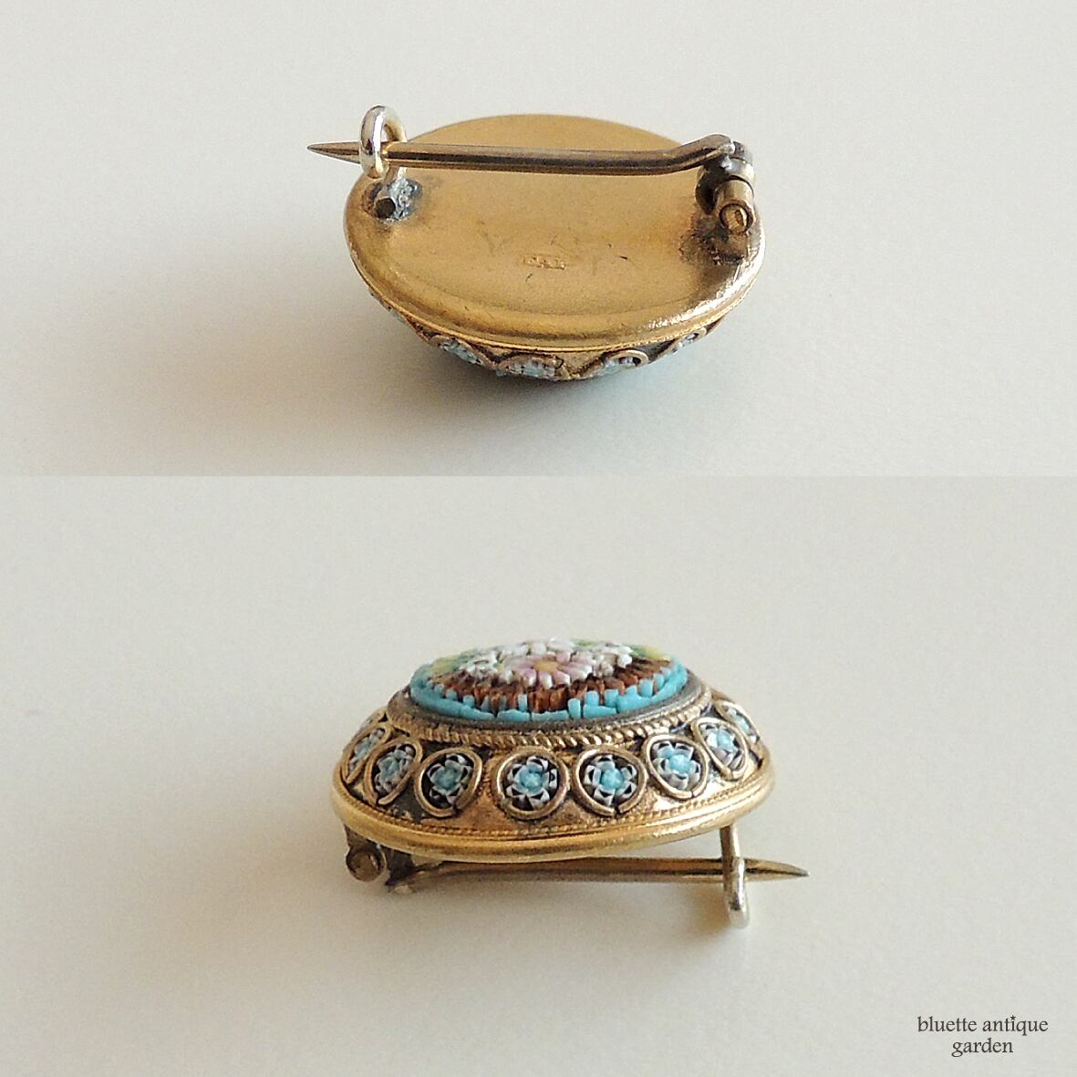 アンティーク、イタリア製のマイクロモザイクのブローチです。背面にメーカーズマーク「FAP」の刻印有。