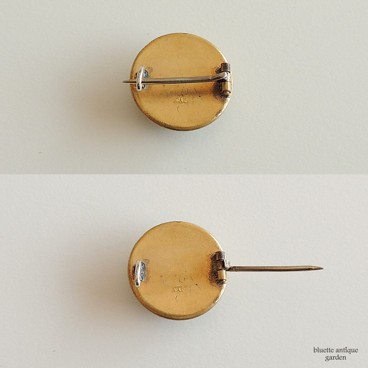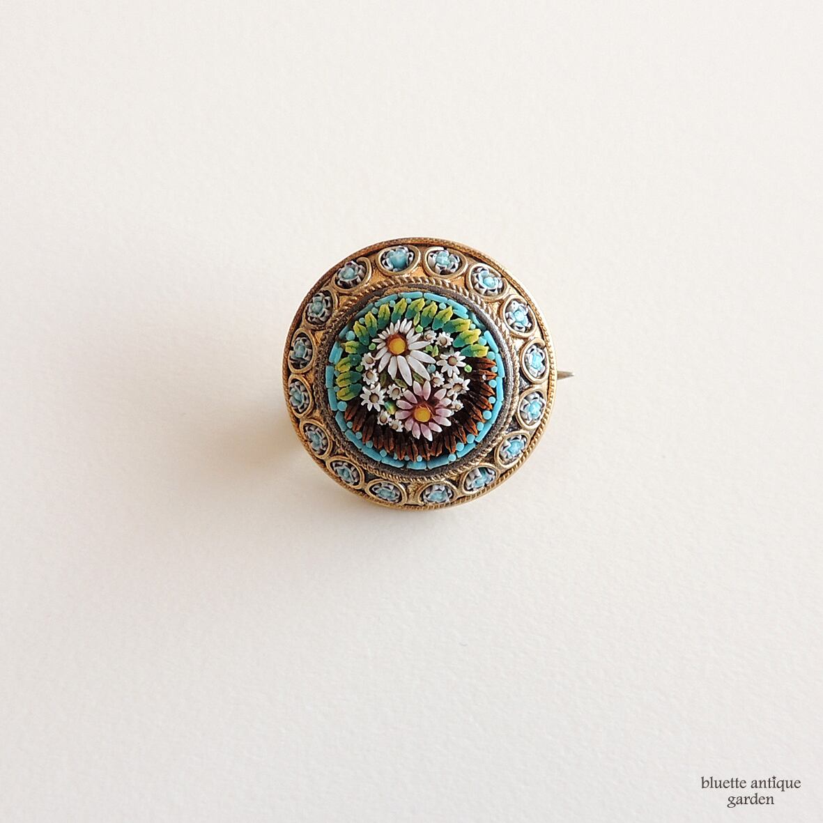 直径約20.7mmの、極小さな円形のブローチ。ターコイズブルーのベースに、ロープツイストデザインの縁取りが入るタイプで、中央には、白とピンクの2輪のマーガレット、小さなデイジーが表現されています。