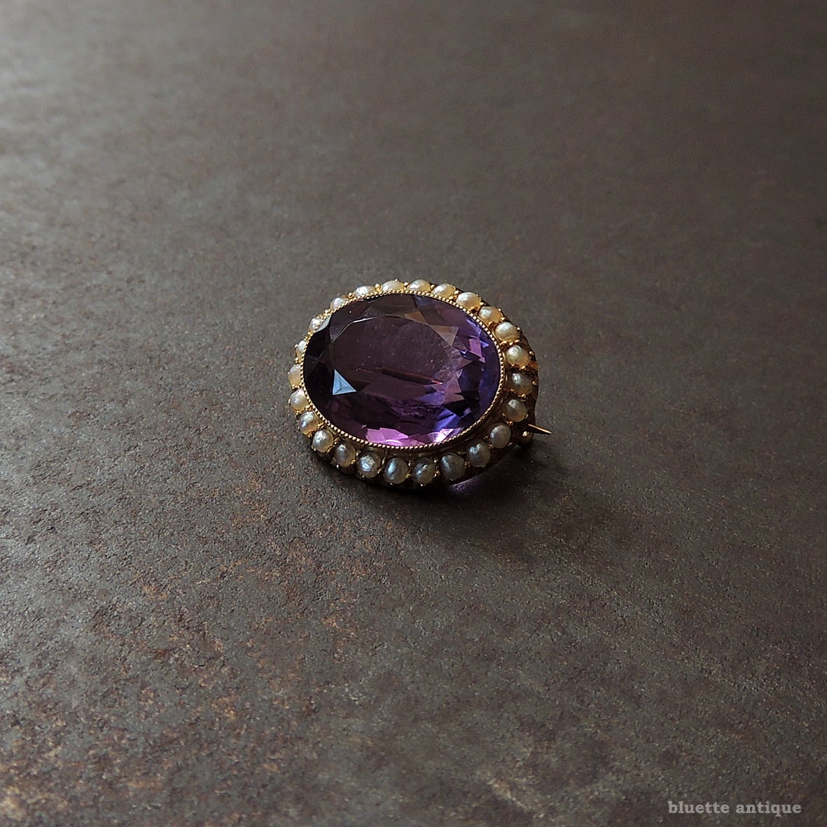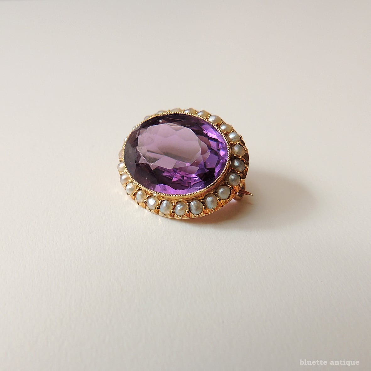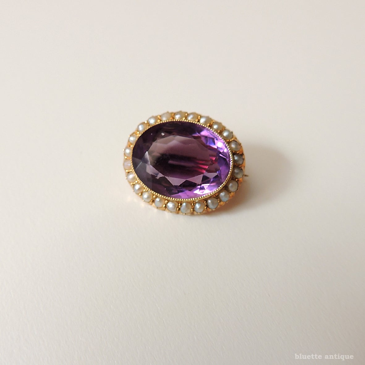 イギリスより、アンティーク、15金、シードパール取り巻き、天然アメシストのレースピンブローチです。