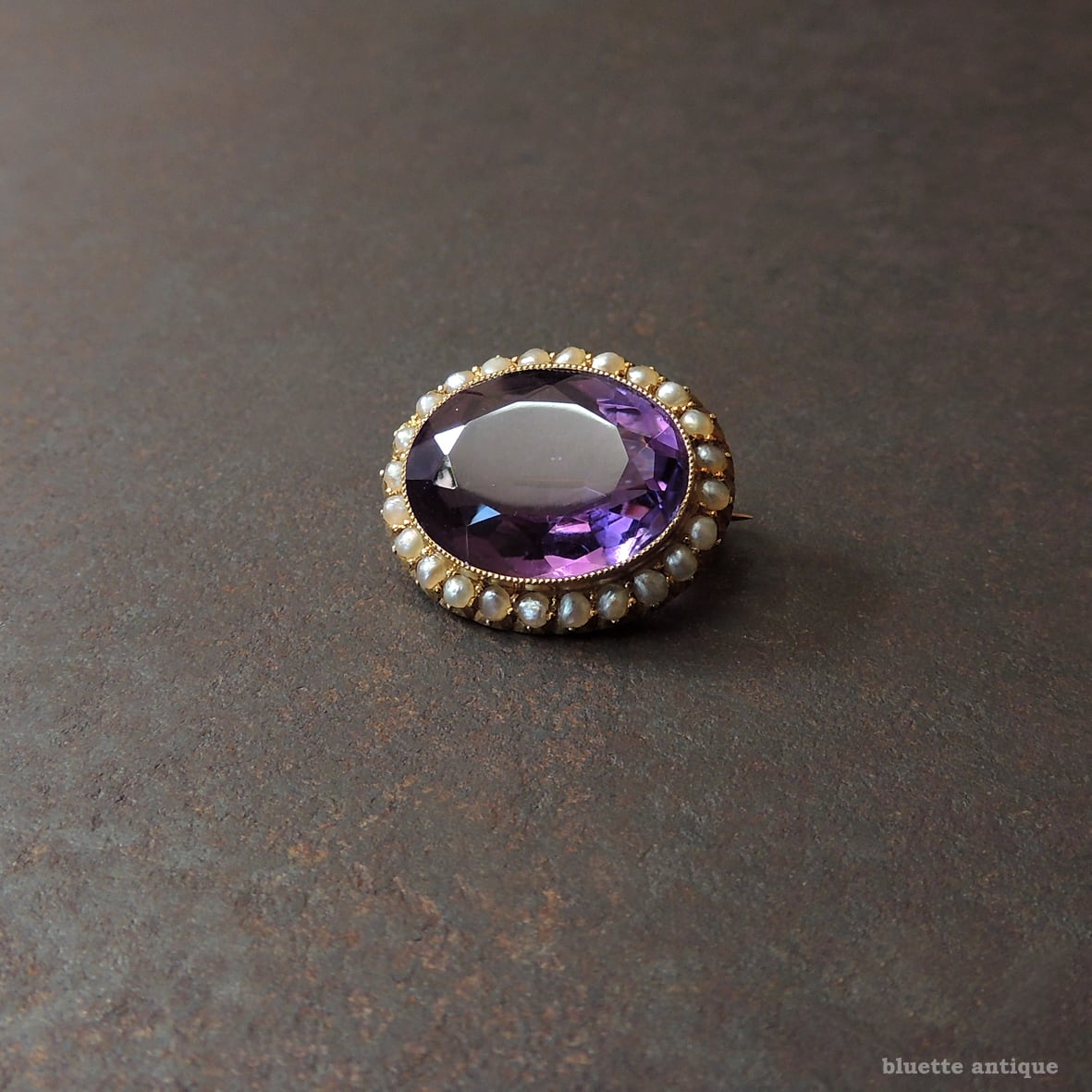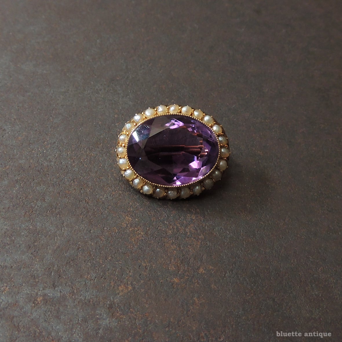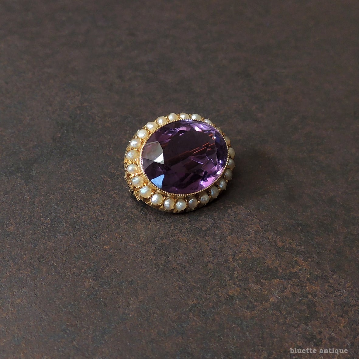 しっかりと紫を感じられる、透明感ある瑞々しいアメシスト。その周りをアンティークジュエリーならではの、ハーフカットのシードパールが取り巻いています。アメシストを留める枠には極細やかなミル打ちが施されています。