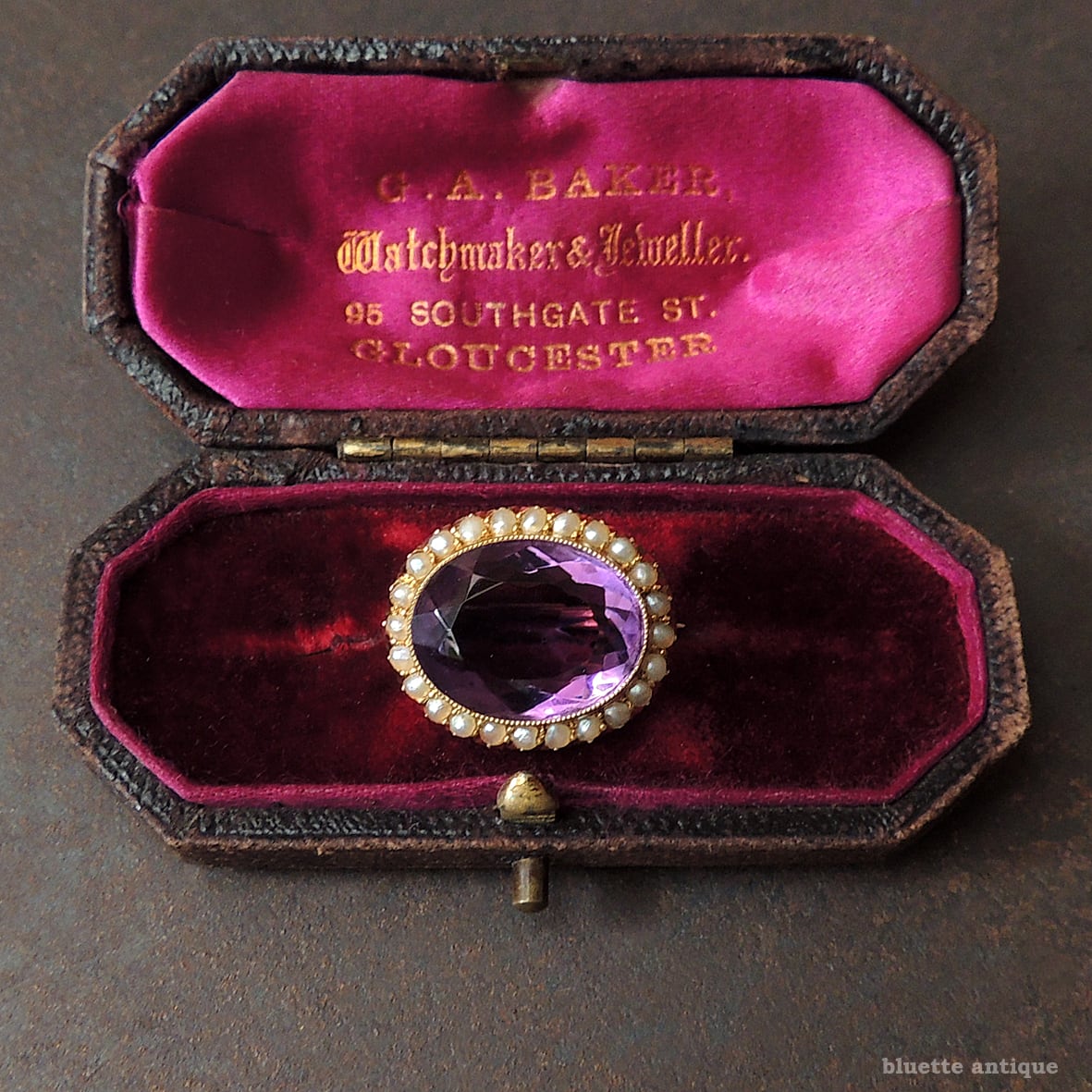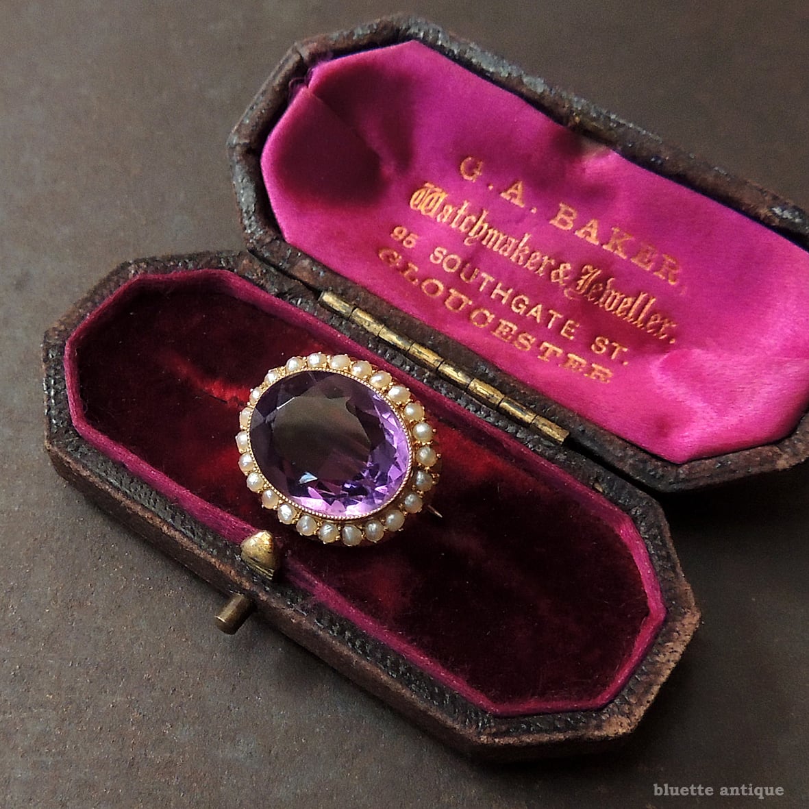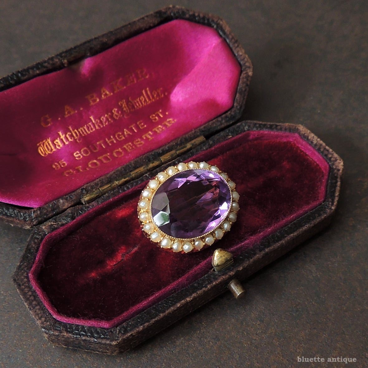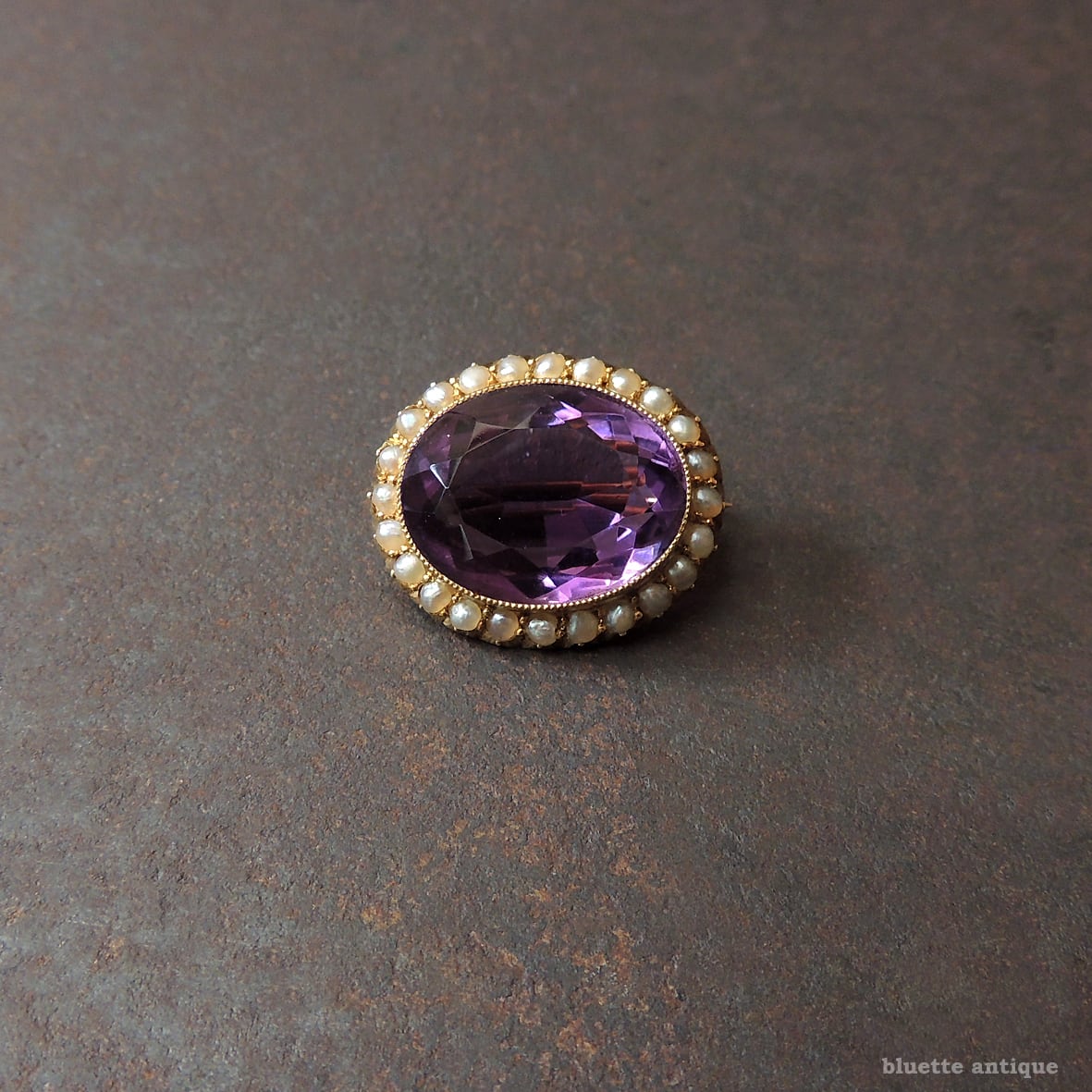 しっかりと紫を感じられる、透明感ある瑞々しいアメシスト。その周りをアンティークジュエリーならではの、ハーフカットのシードパールが取り巻いています。アメシストを留める枠には極細やかなミル打ちが施されています。