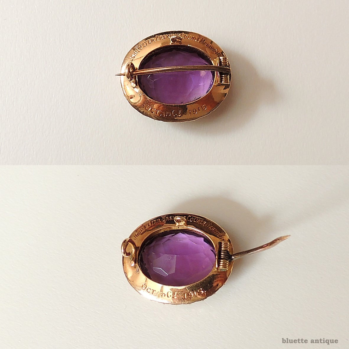 中央のアメシストはとても美しく、肉眼で気になる傷や欠けは有りません。ルーペで確認すると、アメシストやシードパールに針先程の欠け・極僅かな擦れ、インクルージョン等有。15金の台に経年による小傷や黒ずみ等有りますが、アンティークの風合いが美しいです。