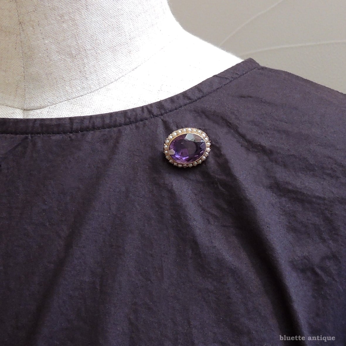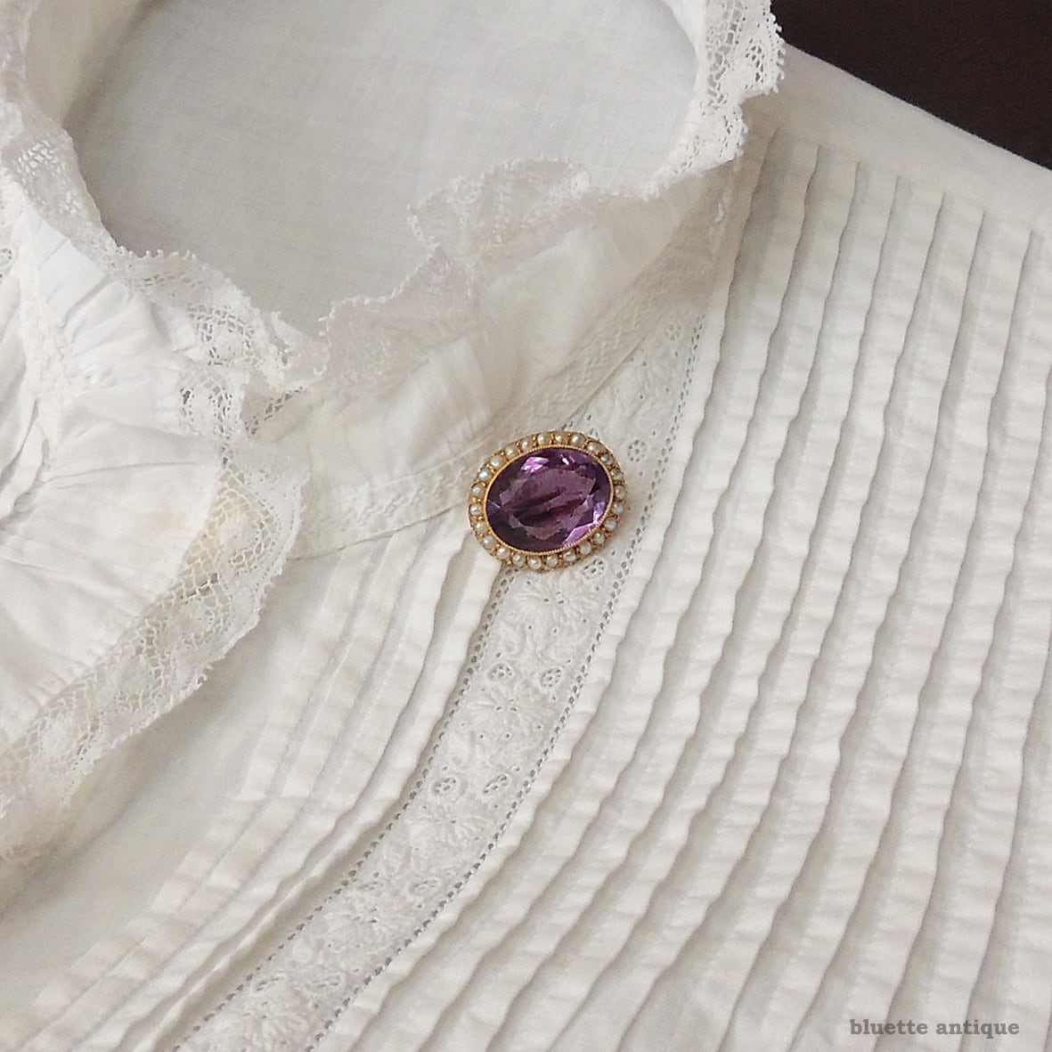 クラシカルなデザインが美しい、存在感あるレースピン。濃い紫、瑞々しい煌めきのアンティークのアメシストがとても魅力的です。