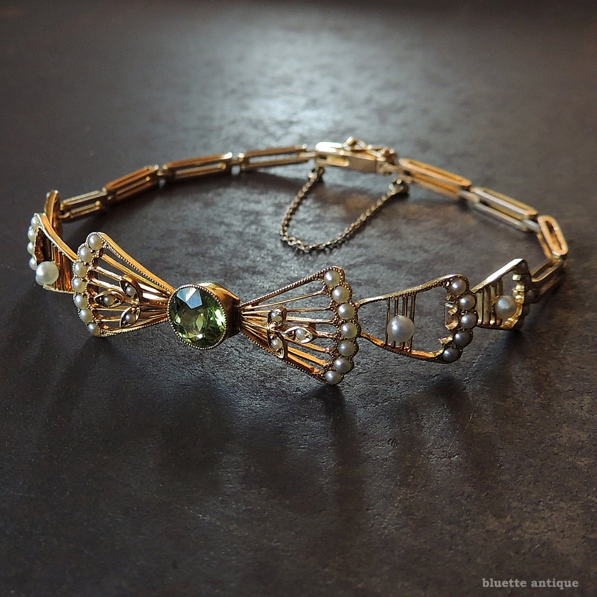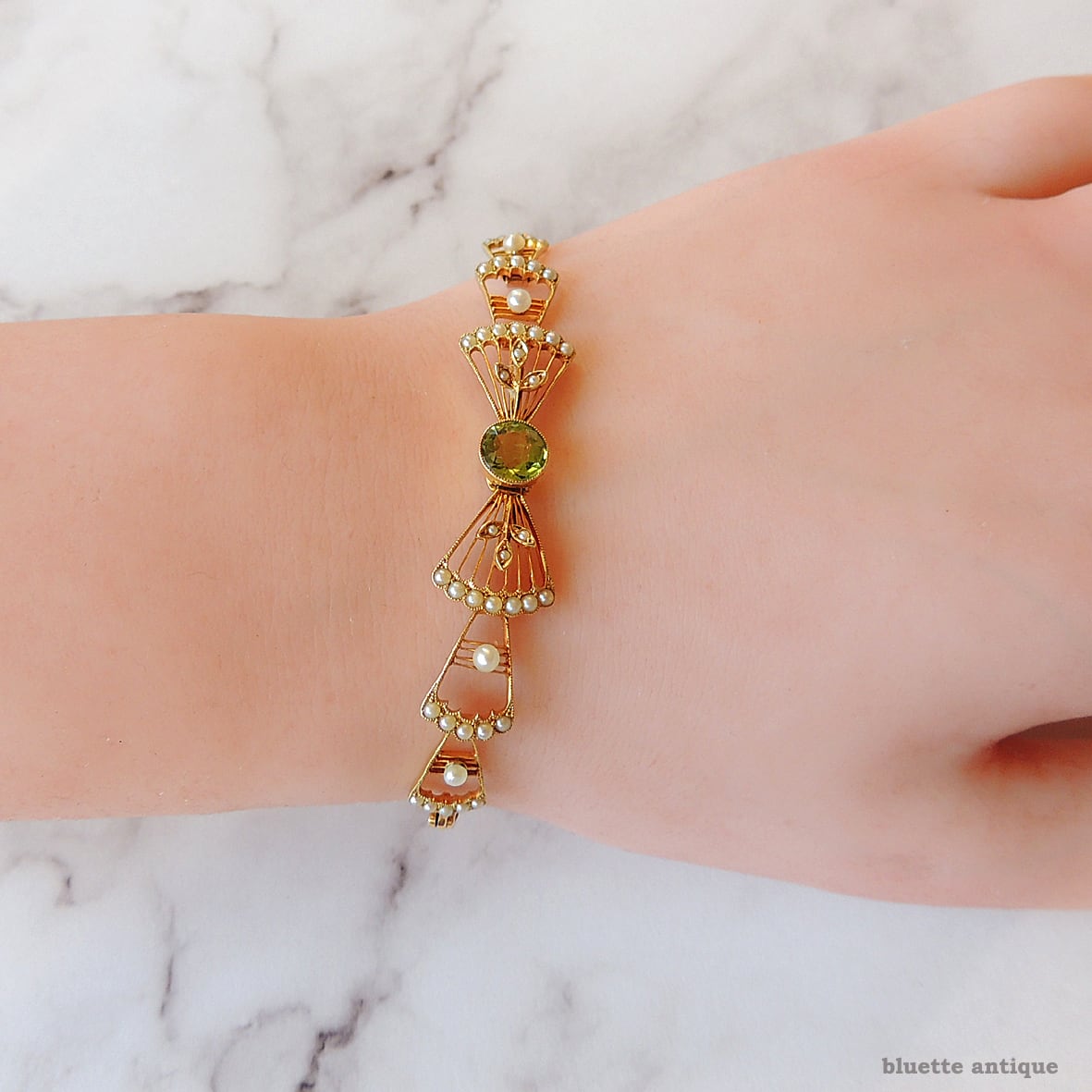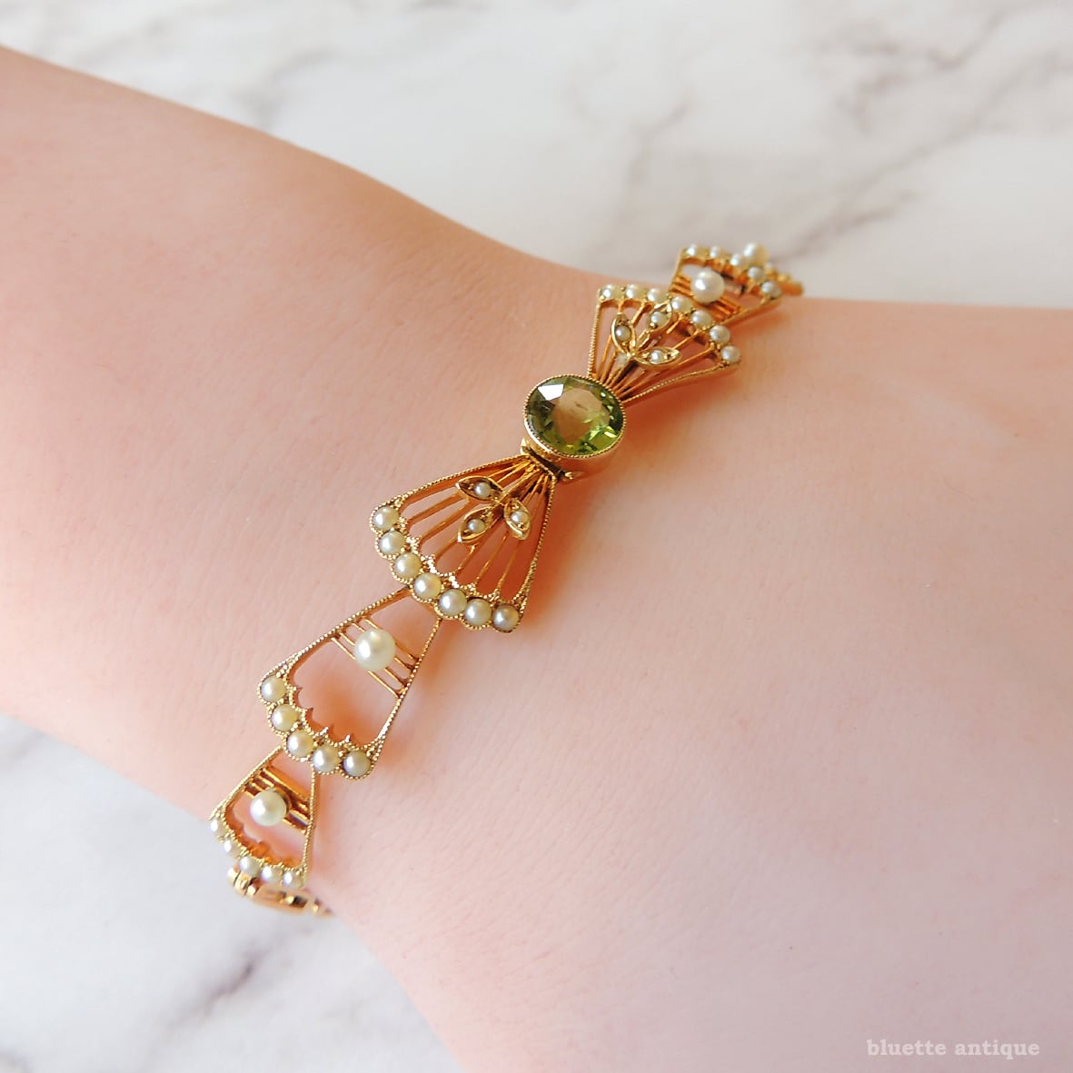 英国アンティークジュエリー アール・デコ 15ctゴールド 天然ペリドット 真珠 リボンブレスレット(ソーティングメモ付)