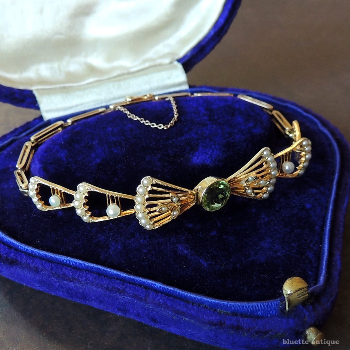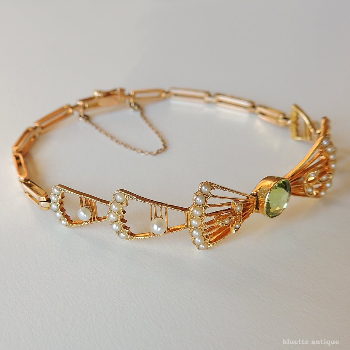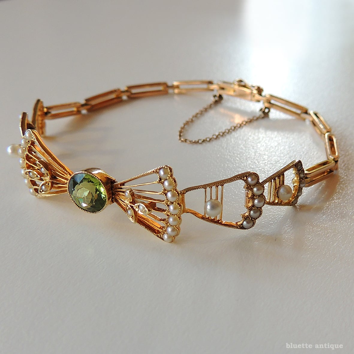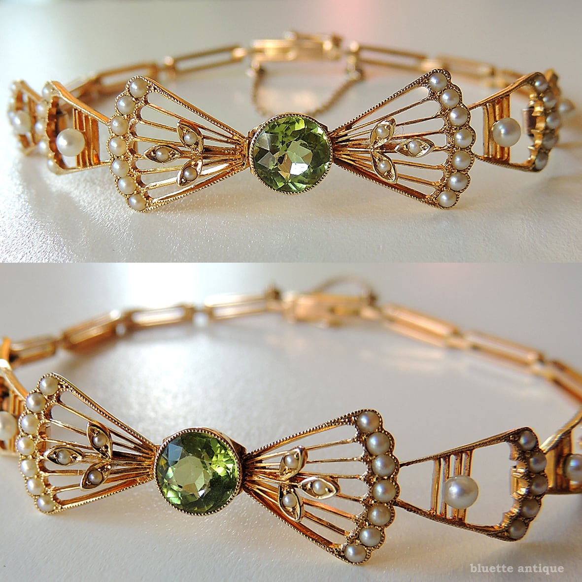 英国アンティークジュエリー アール・デコ 15ctゴールド 天然ペリドット 真珠 リボンブレスレット(ソーティングメモ付)
