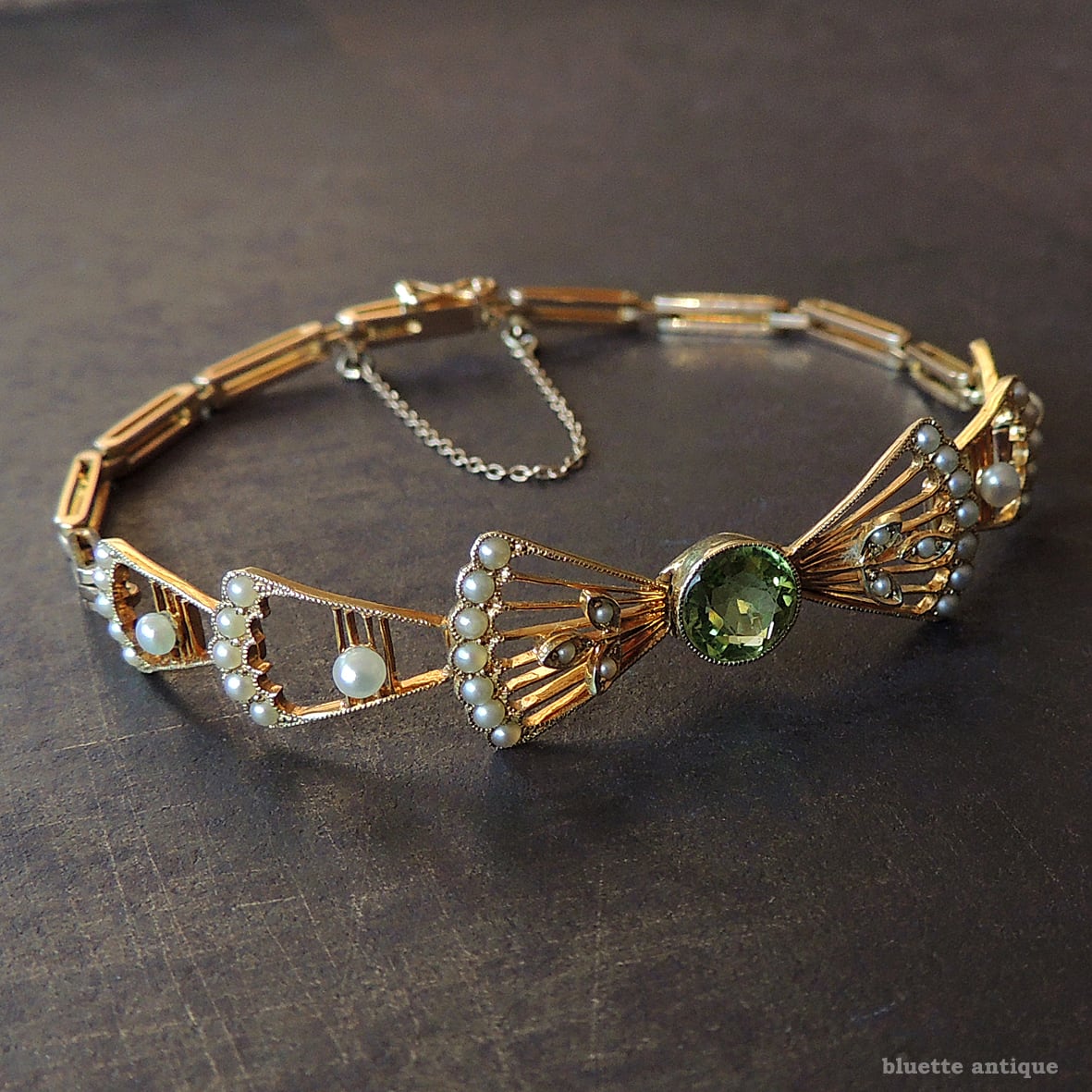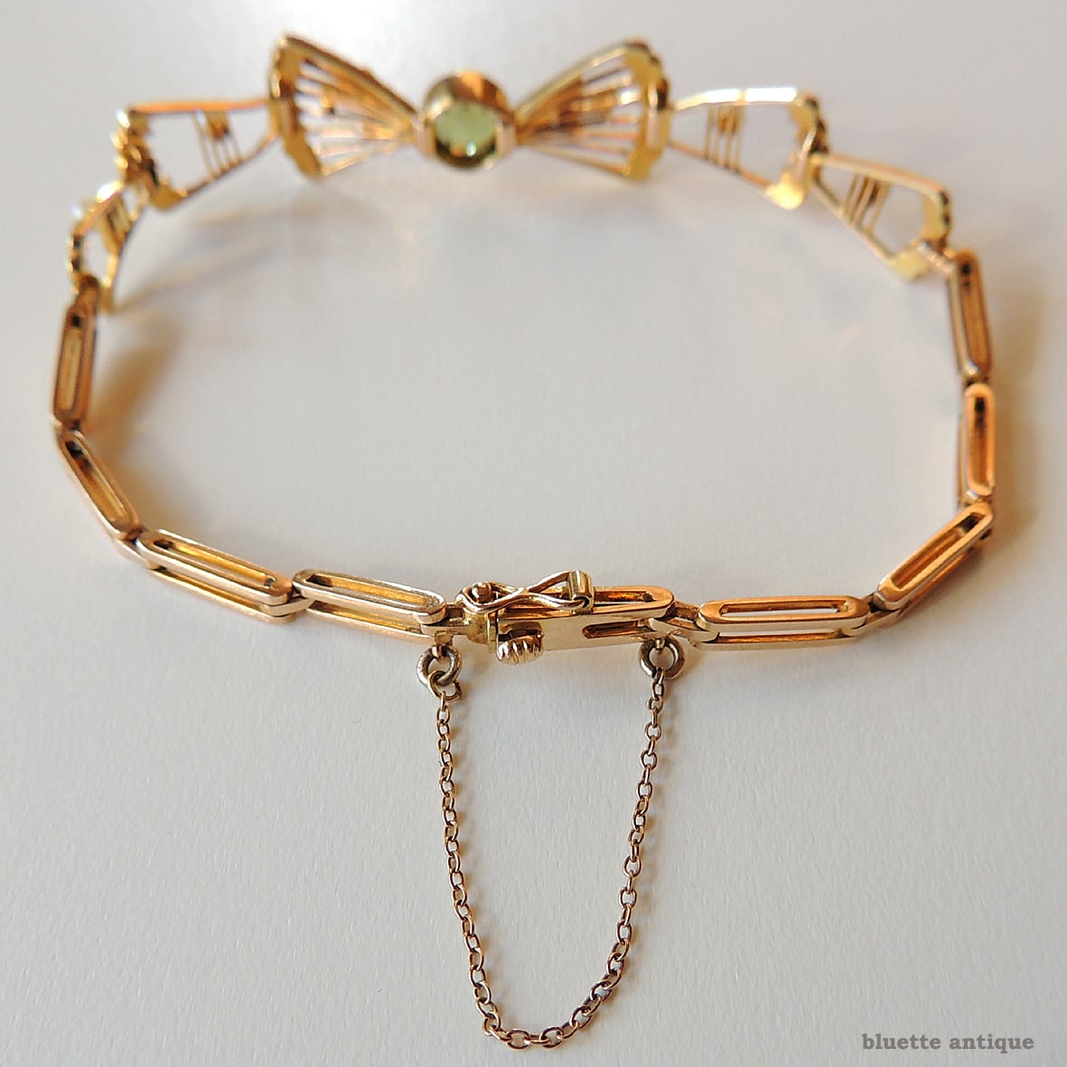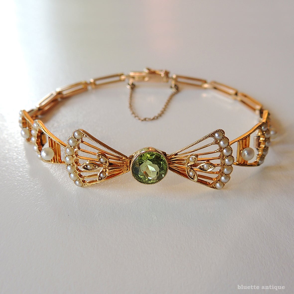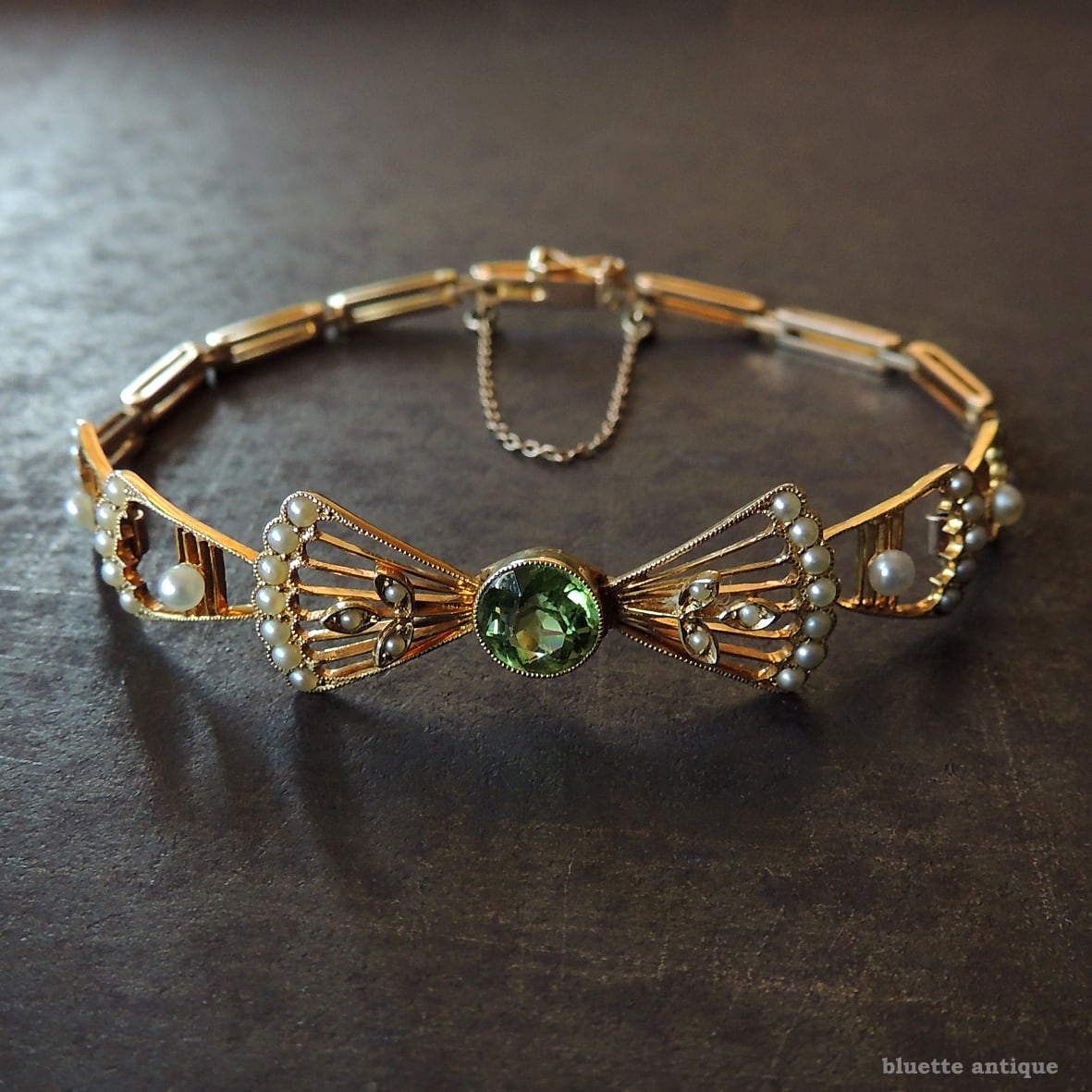 イギリスより、アンティーク、アール・デコ、15金、天然ペリドットとシードパールのリボンブレスレットです。差し込み金具(タング)にゴールドの品位をあらわす「15CT」の刻印が有ります。セーフティーチェーンが付属します。