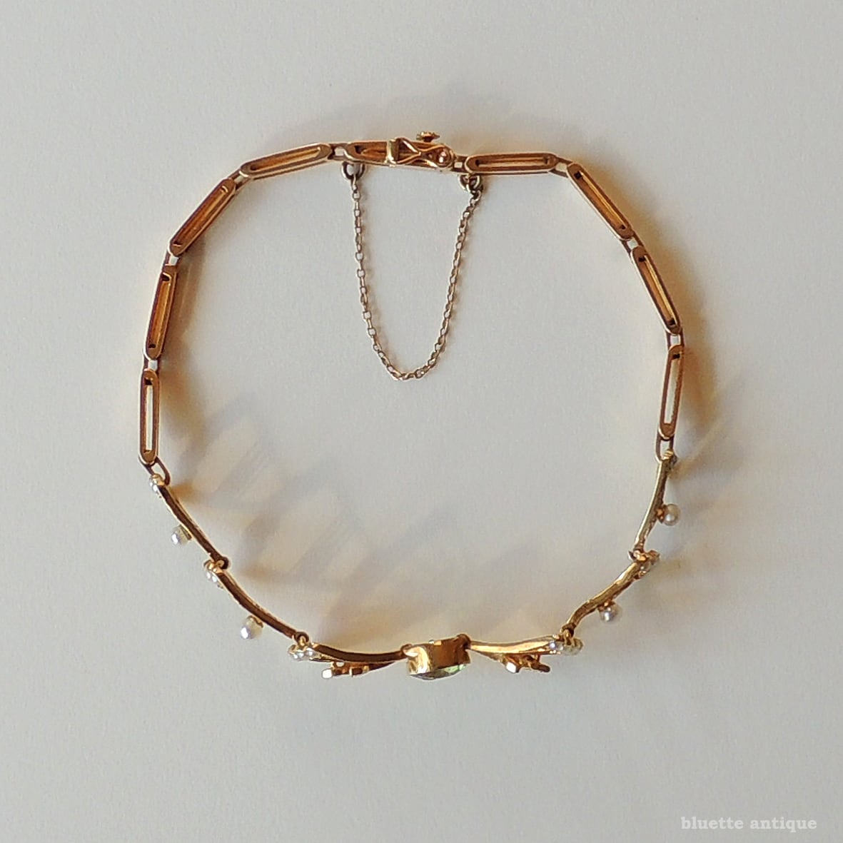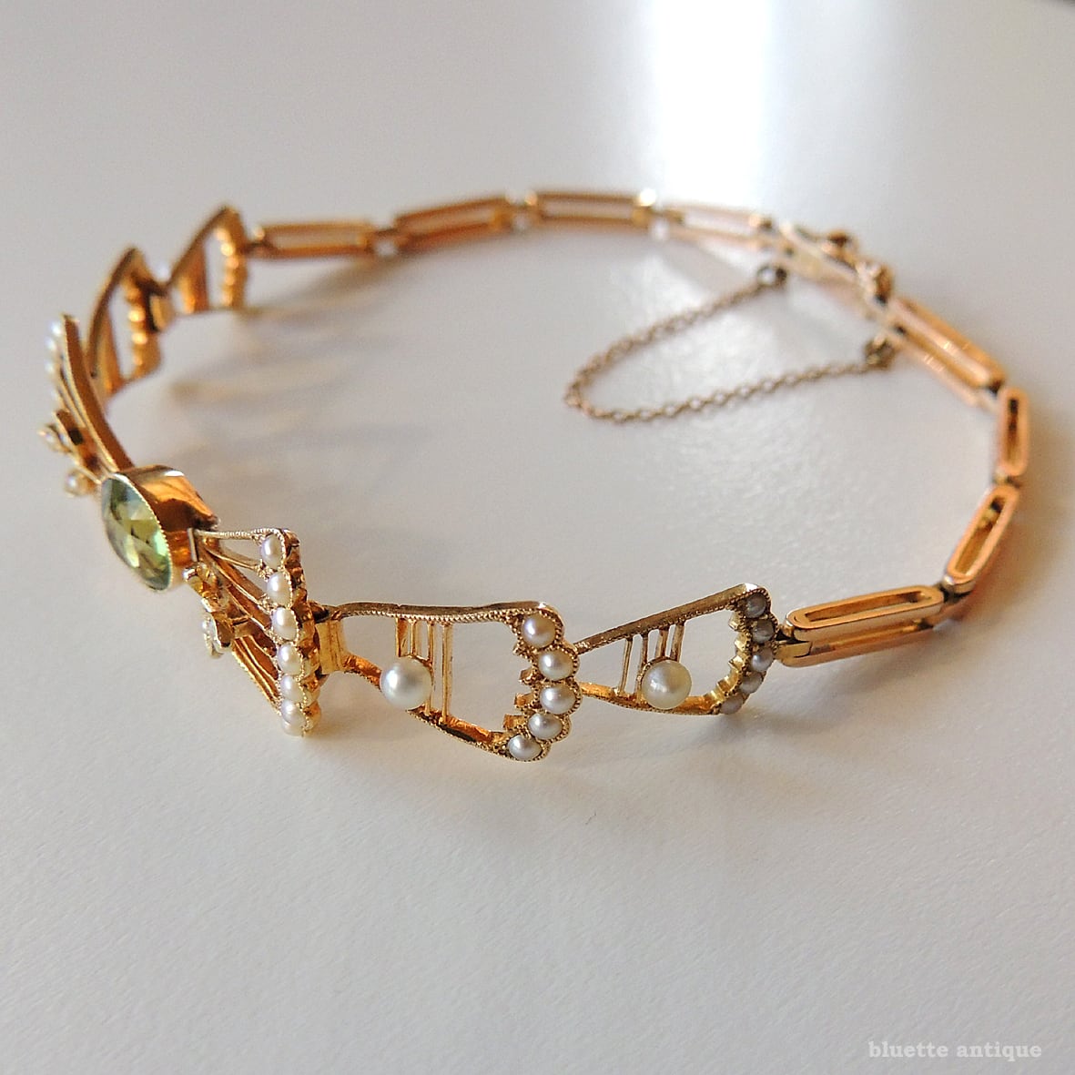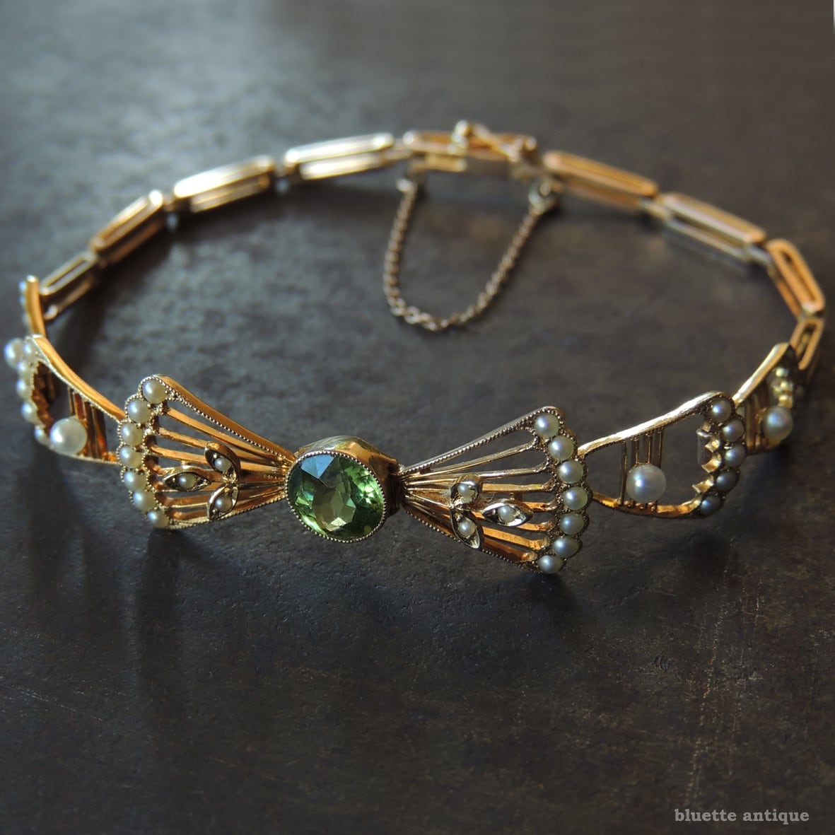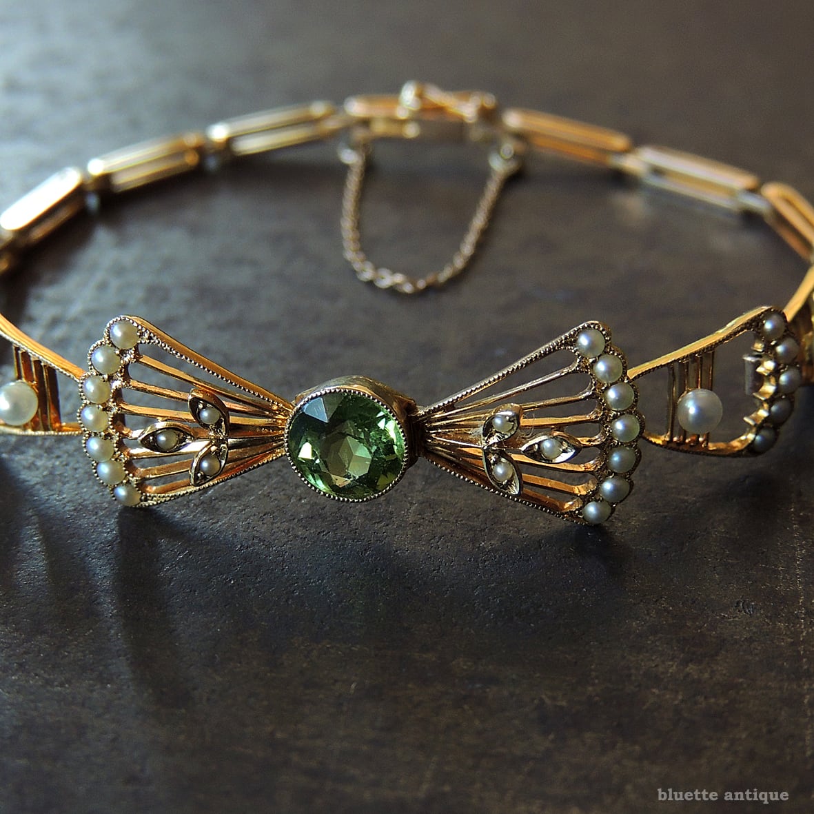 イギリスより、アンティーク、アール・デコ、15金、天然ペリドットとシードパールのリボンブレスレットです。差し込み金具(タング)にゴールドの品位をあらわす「15CT」の刻印が有ります。セーフティーチェーンが付属します。